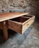 The wood shows a natural patina with visible signs of use, including wear to the surface and minor irregularities, consistent with its age. The structure is stable and in good overall condition.
