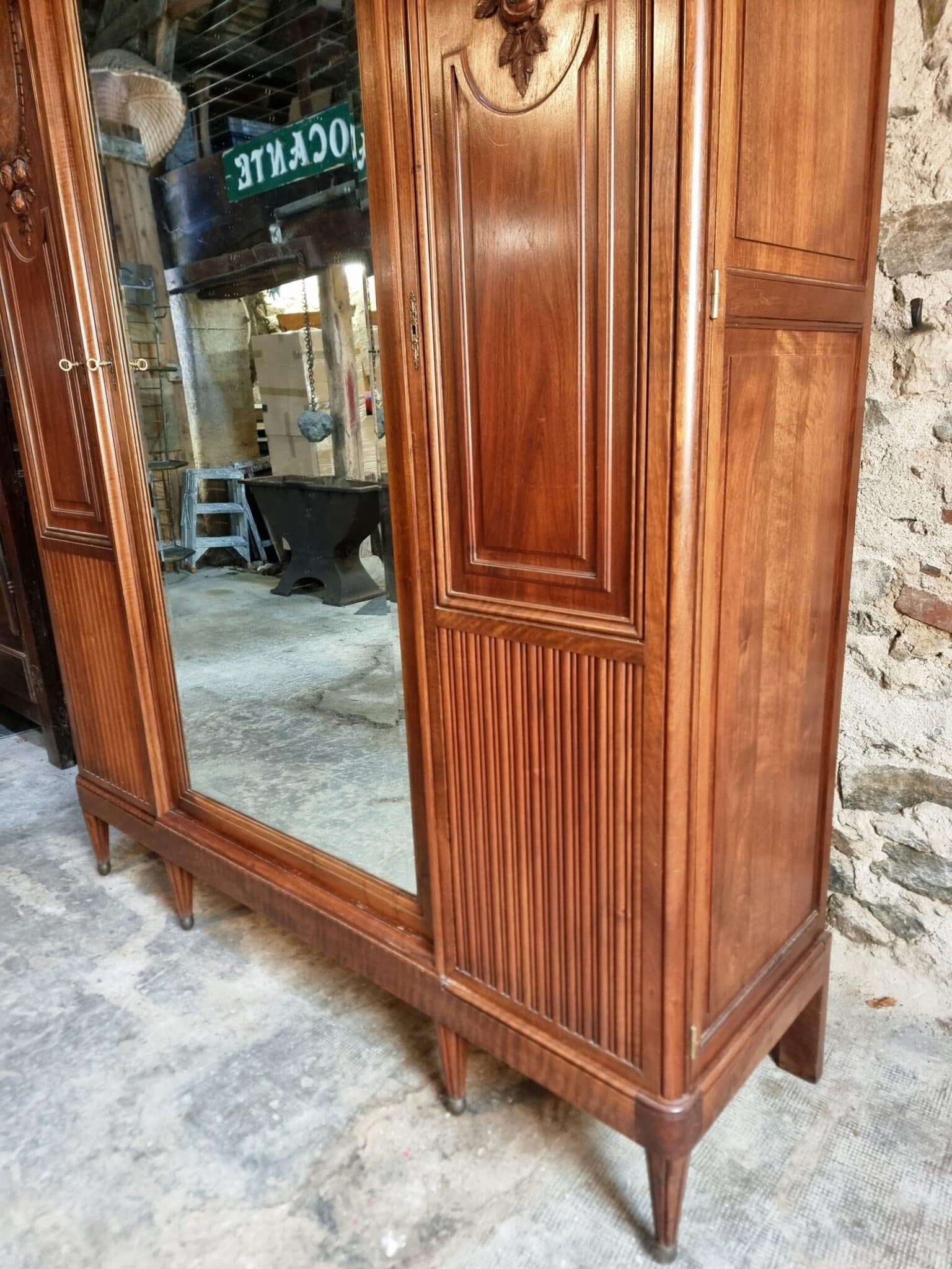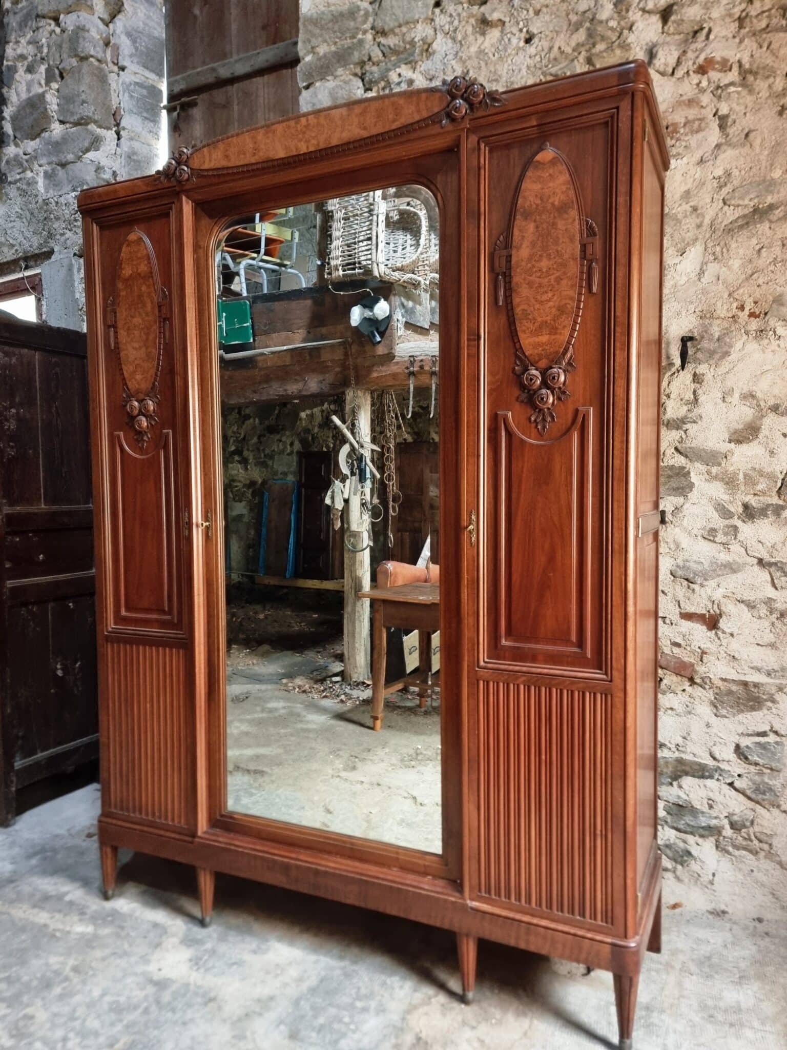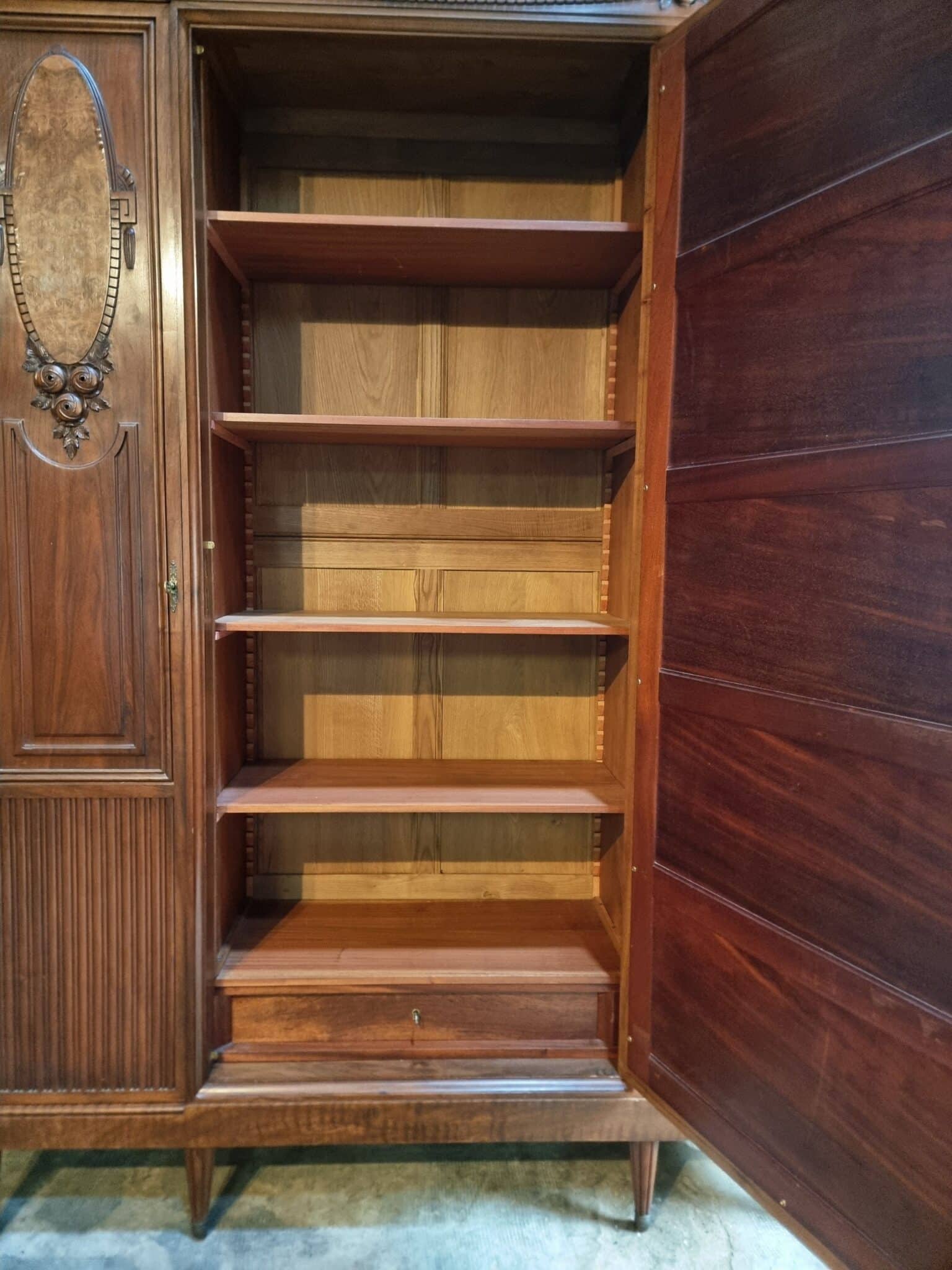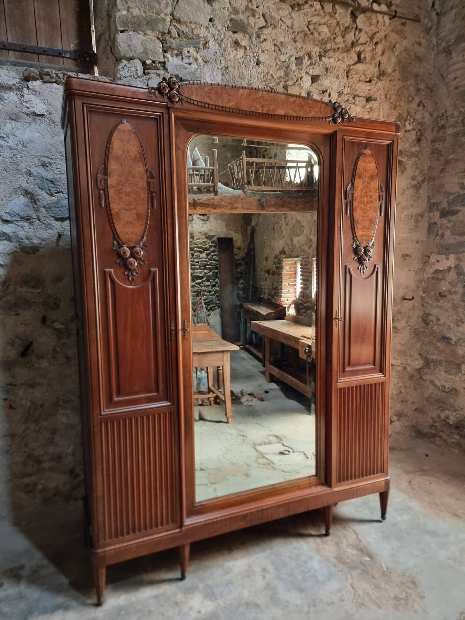 This antique French wardrobe, dating from the early 20th century, reflects elements of the Art Nouveau style with a subtle transition towards Art Deco. It combines refined decorative craftsmanship with practical storage.