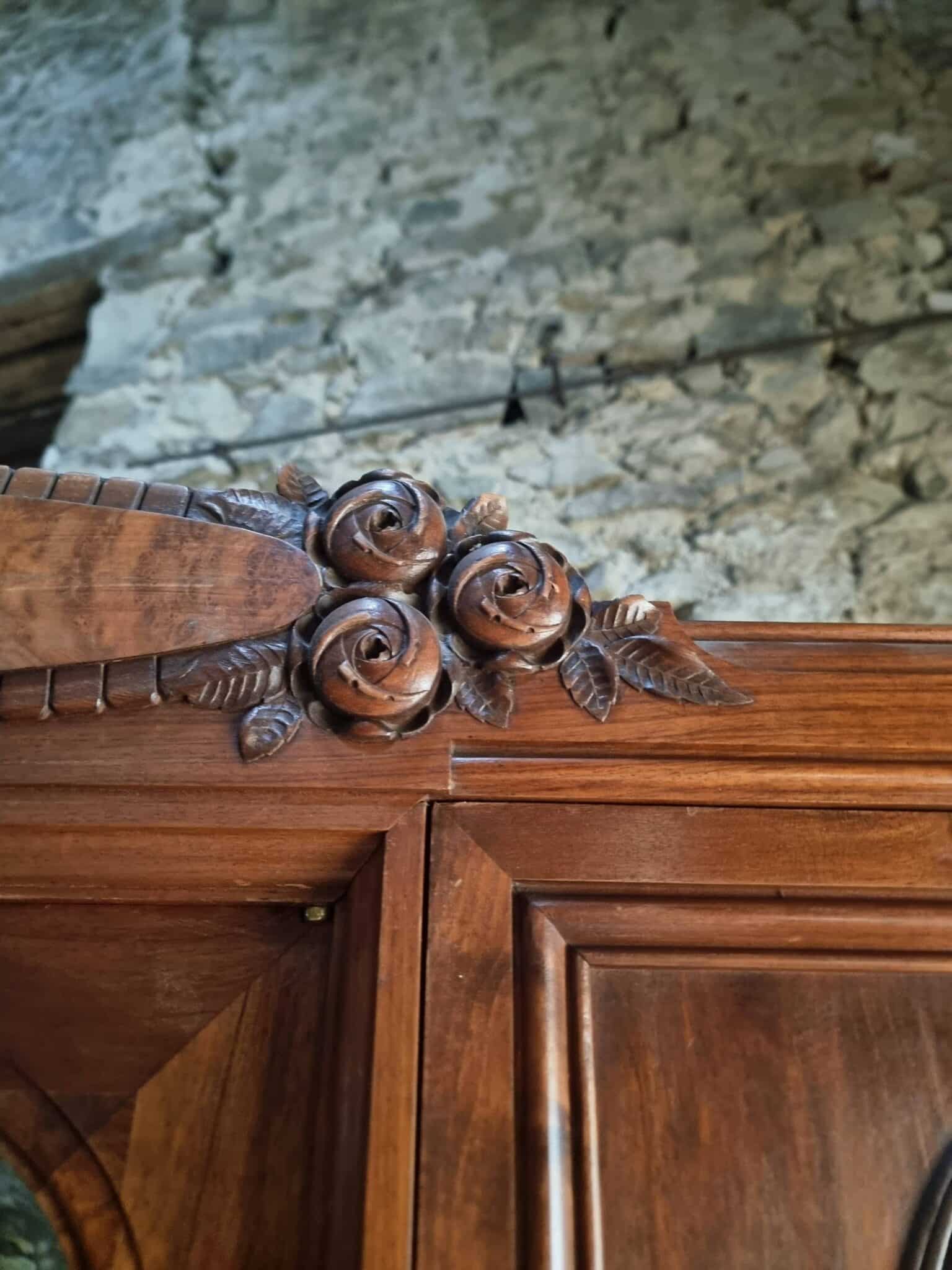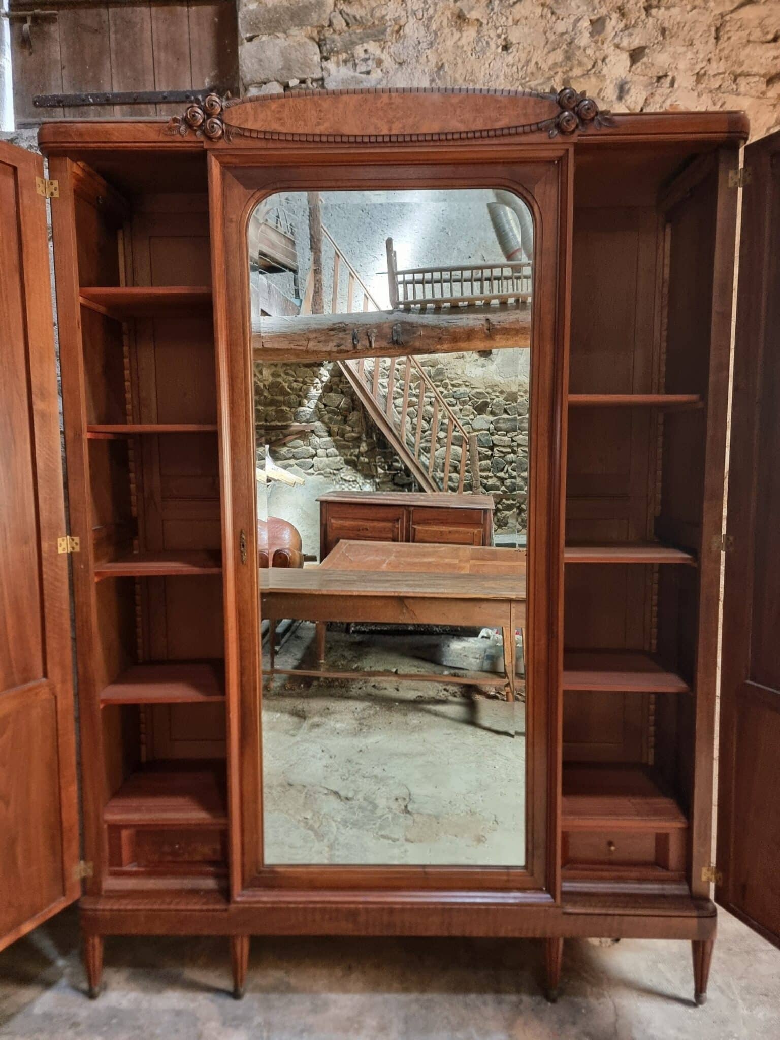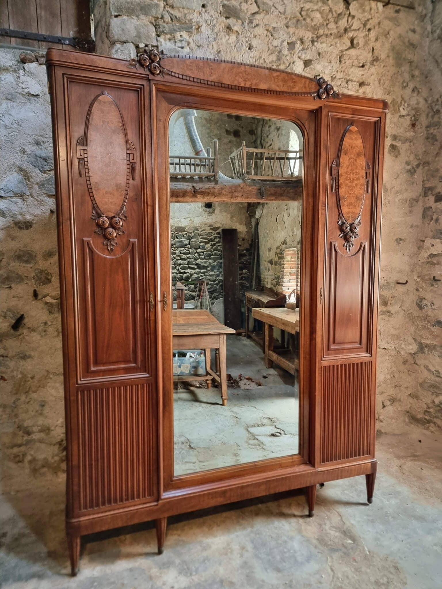 This antique French wardrobe, dating from the early 20th century, reflects elements of the Art Nouveau style with a subtle transition towards Art Deco. It combines refined decorative craftsmanship with practical storage.