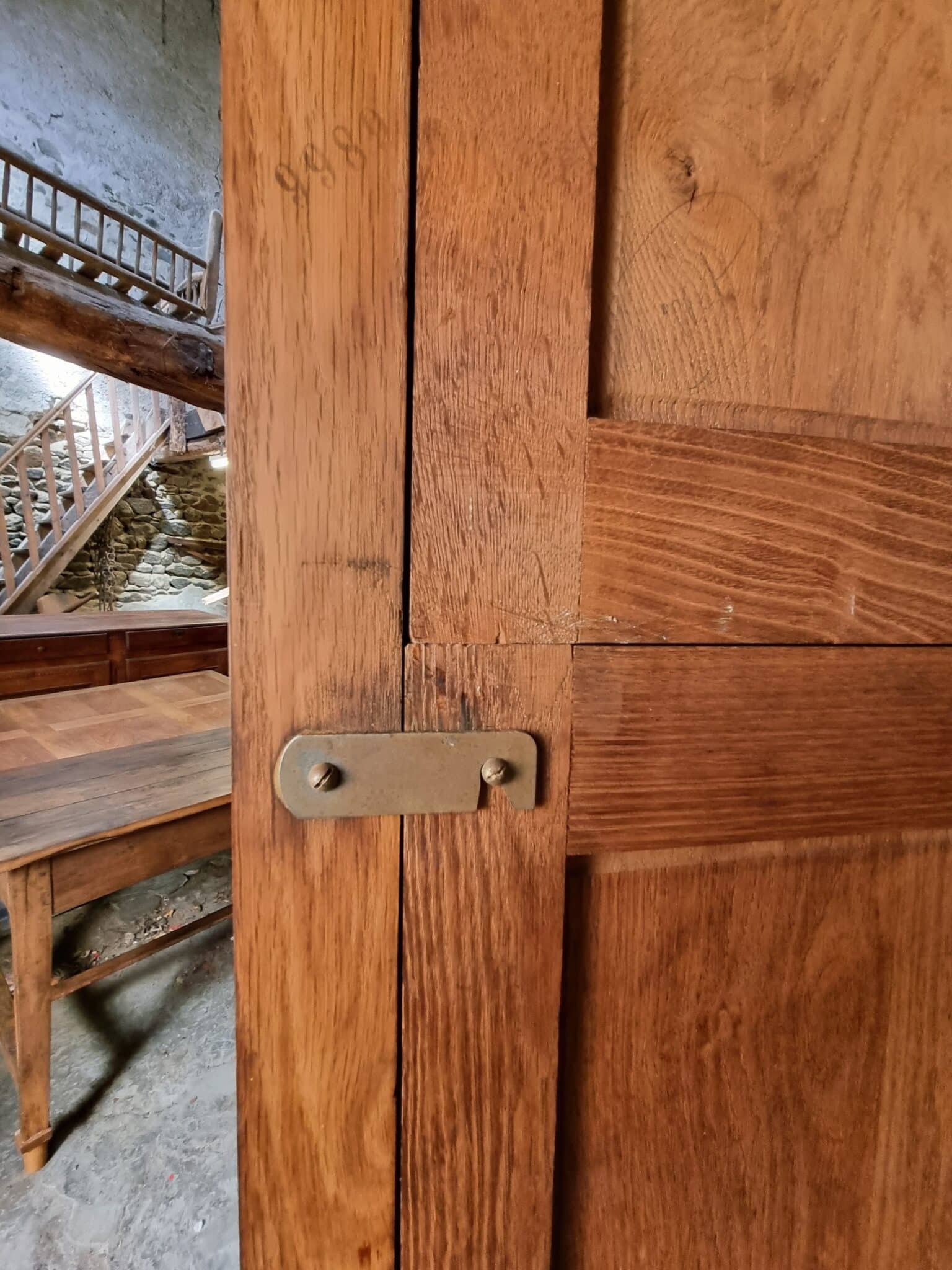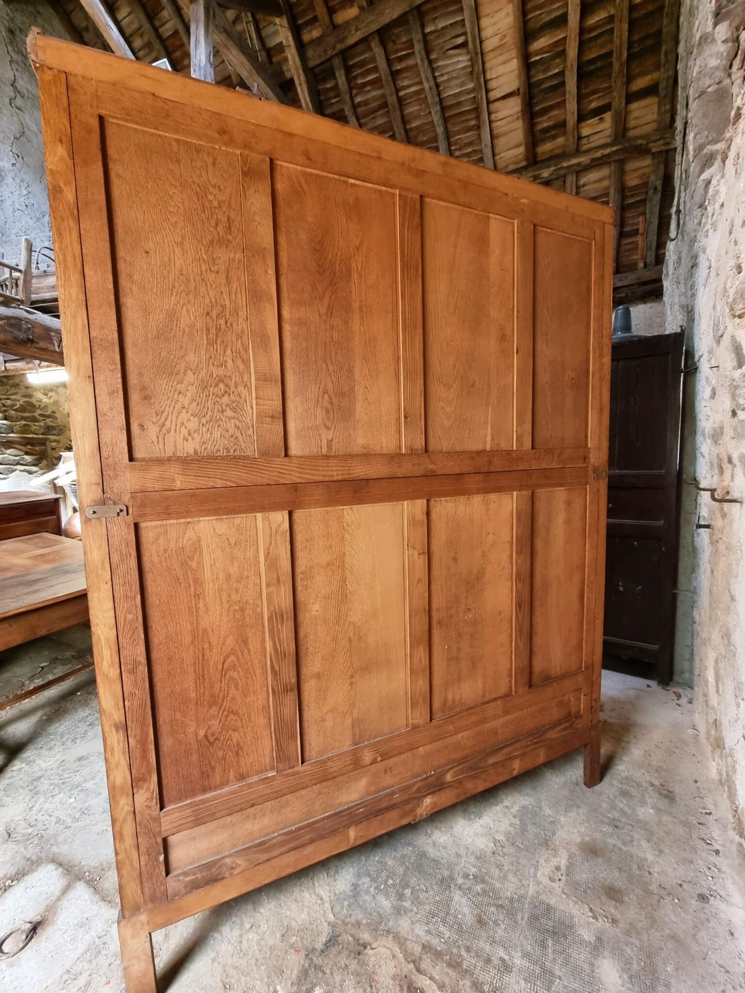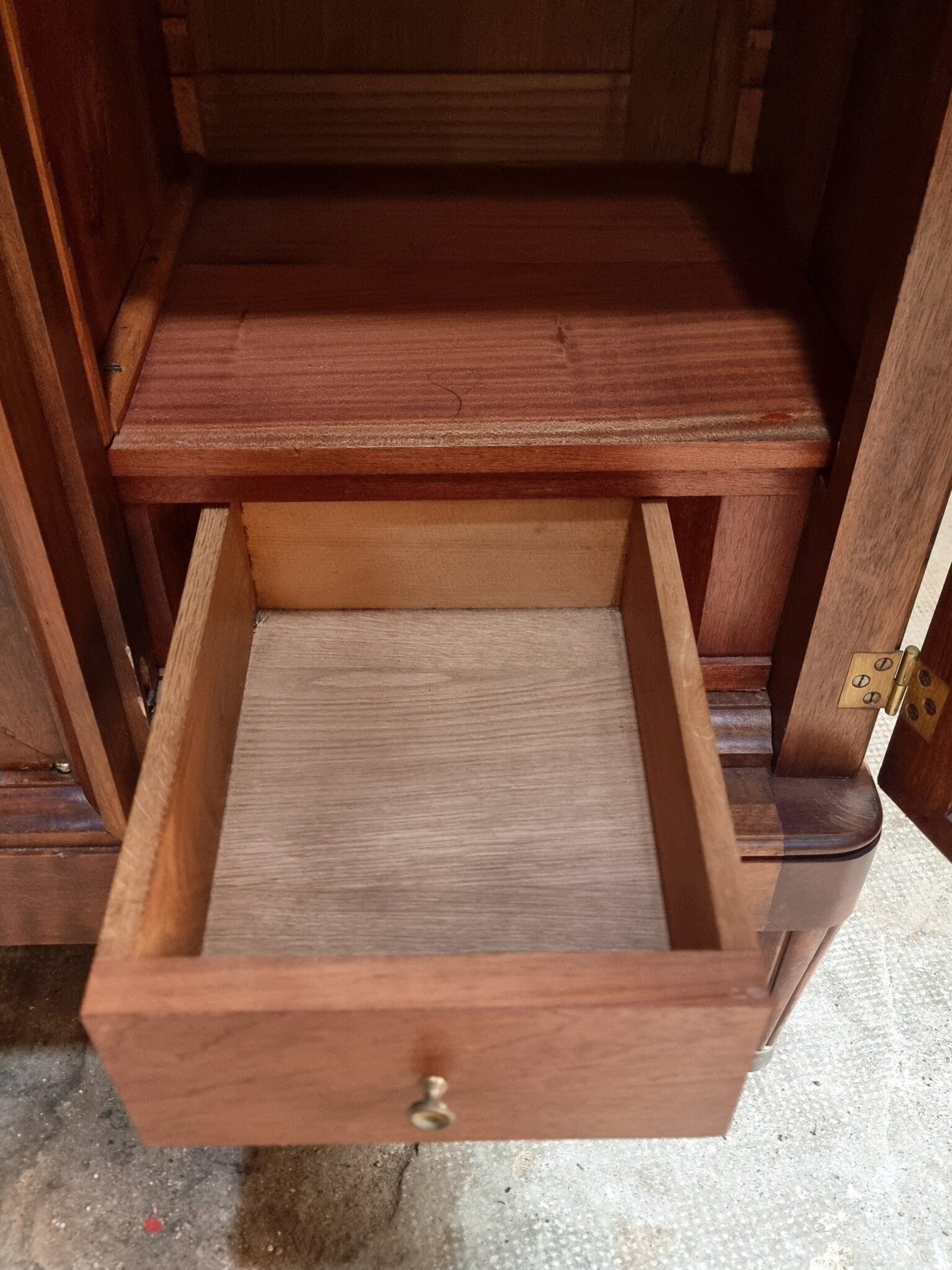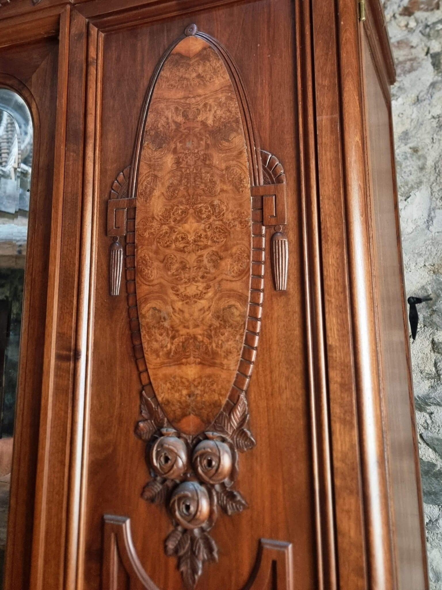 This antique French wardrobe, dating from the early 20th century, reflects elements of the Art Nouveau style with a subtle transition towards Art Deco. It combines refined decorative craftsmanship with practical storage.
