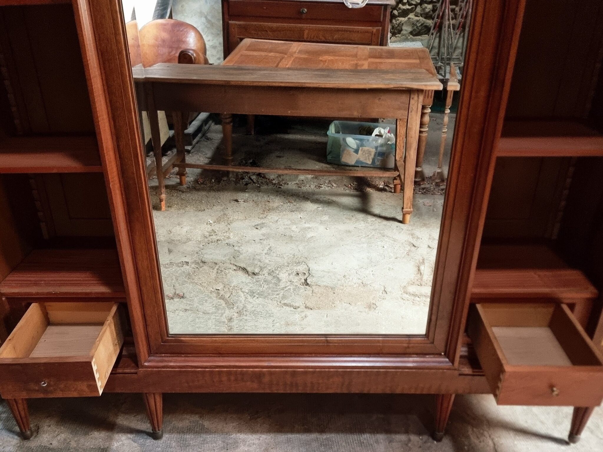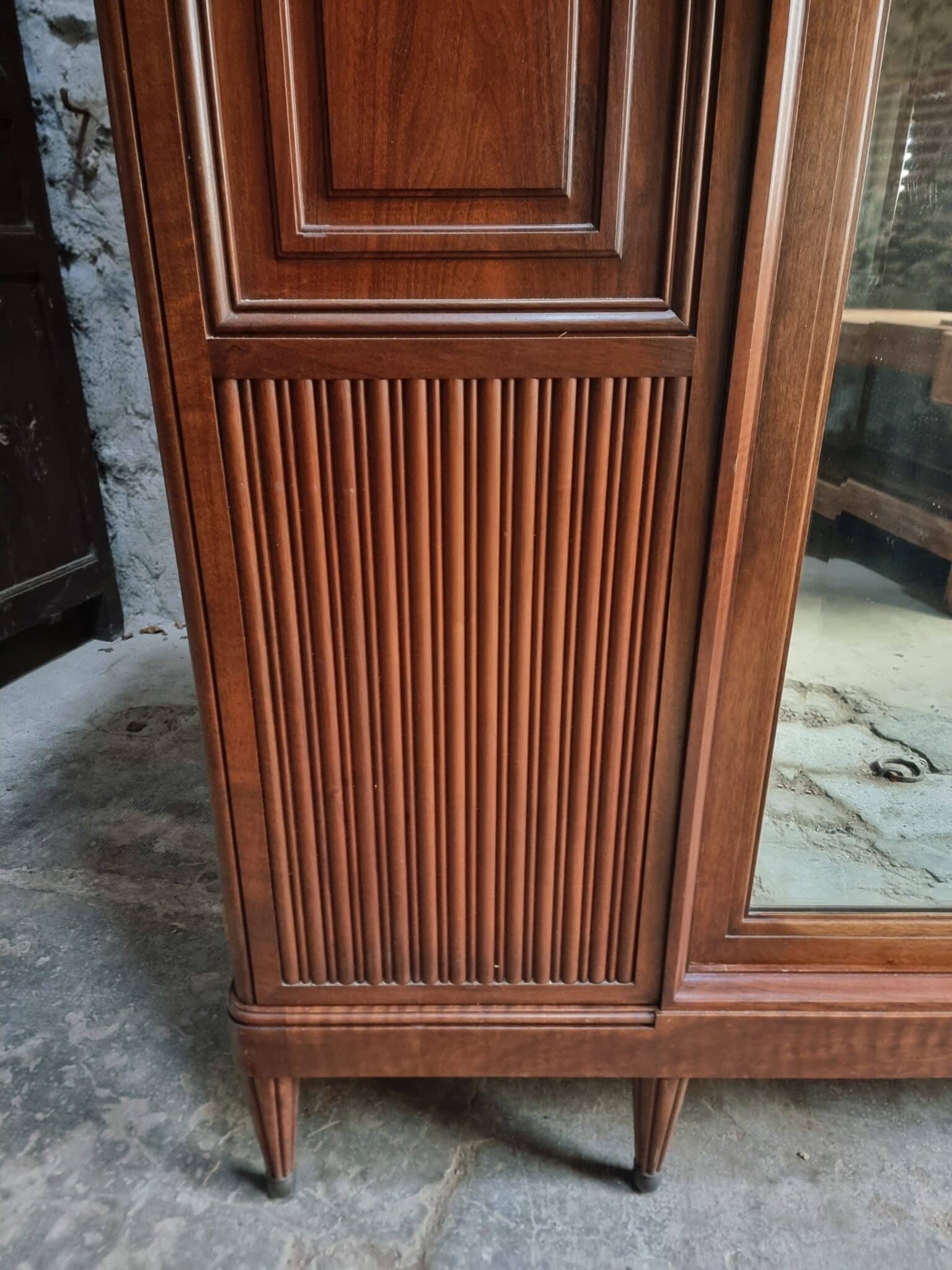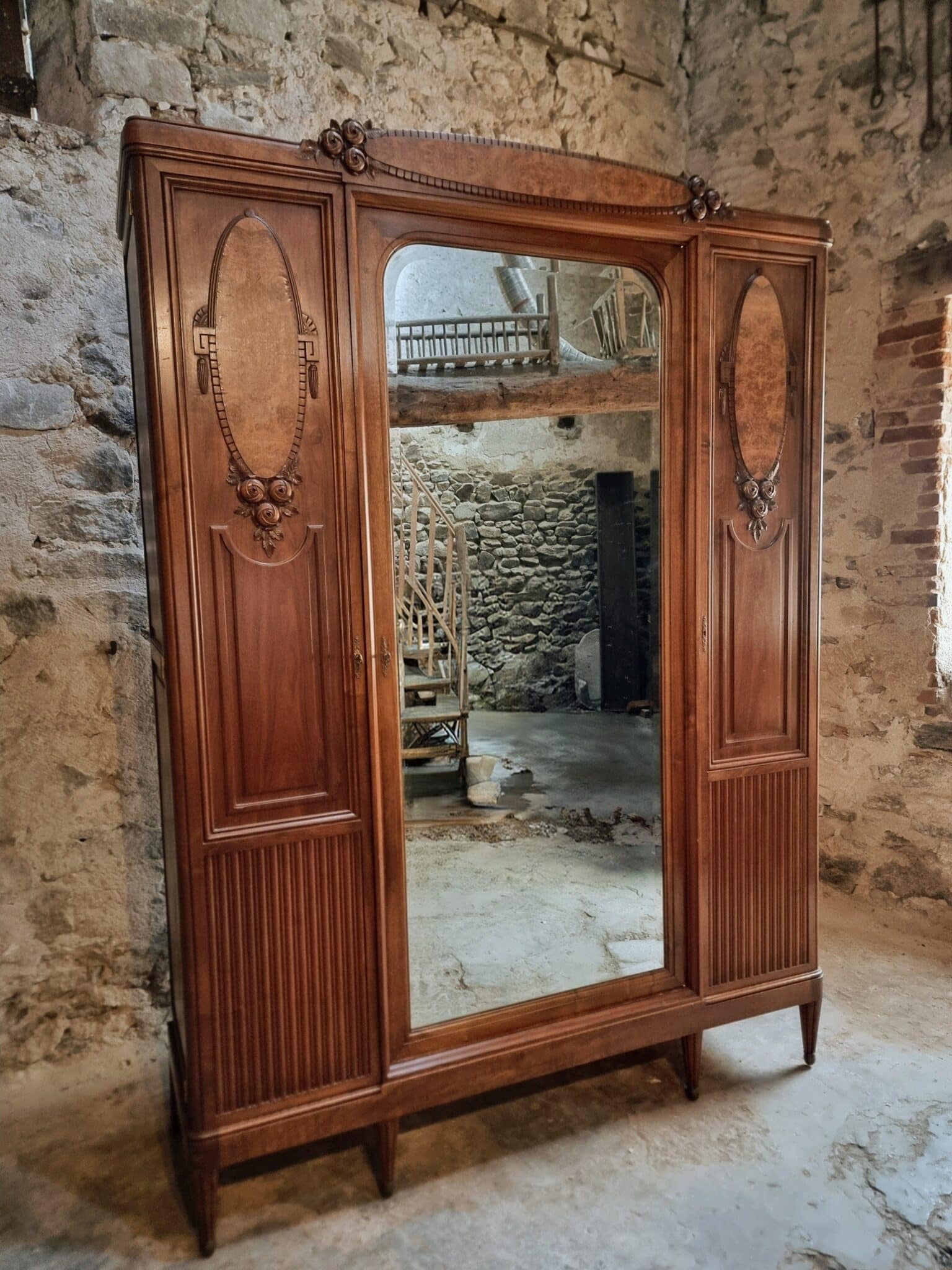 The piece features a well-balanced three-door design, including a central full-length mirror, flanked by two paneled doors with decorative veneered details. The cabinet is constructed from a combination of walnut and oak, contributing to both its durability and warm, natural appearance.