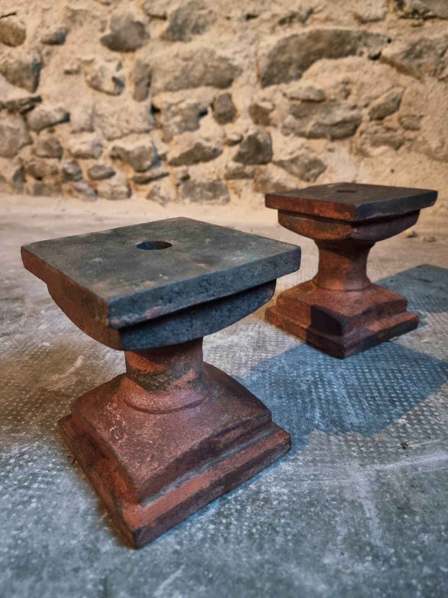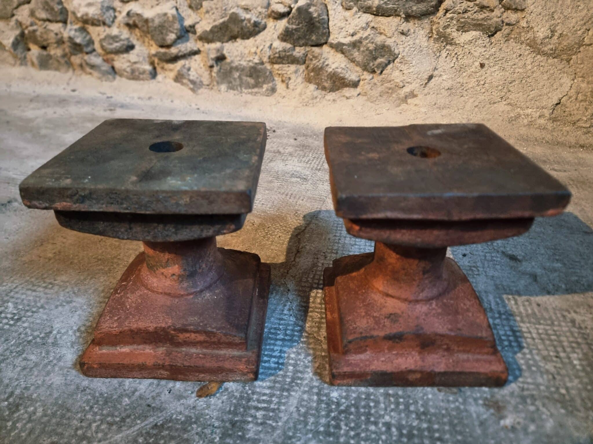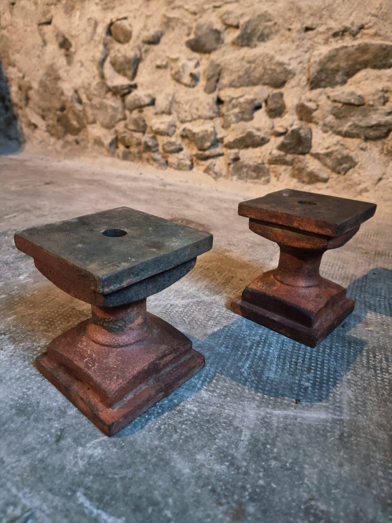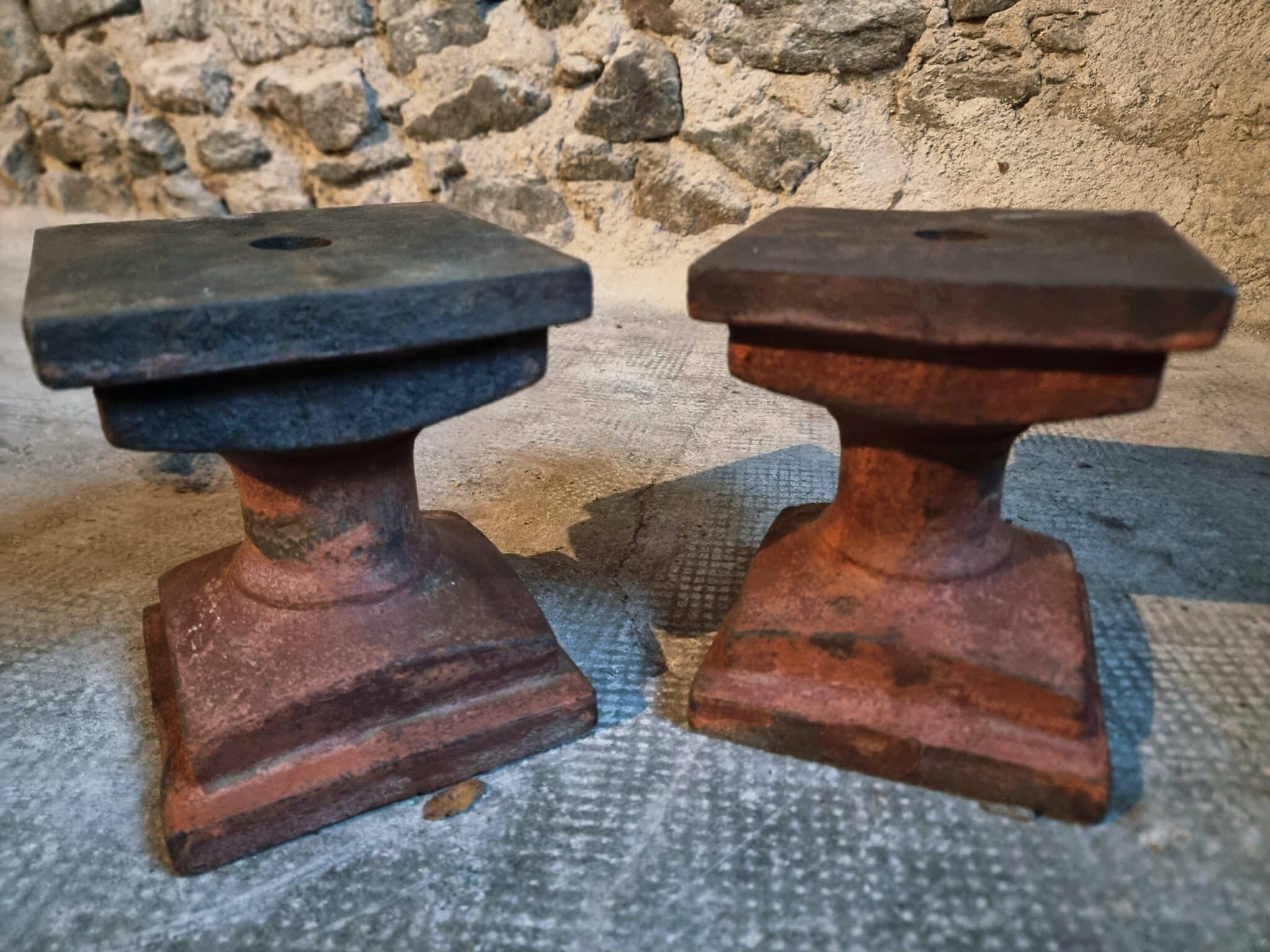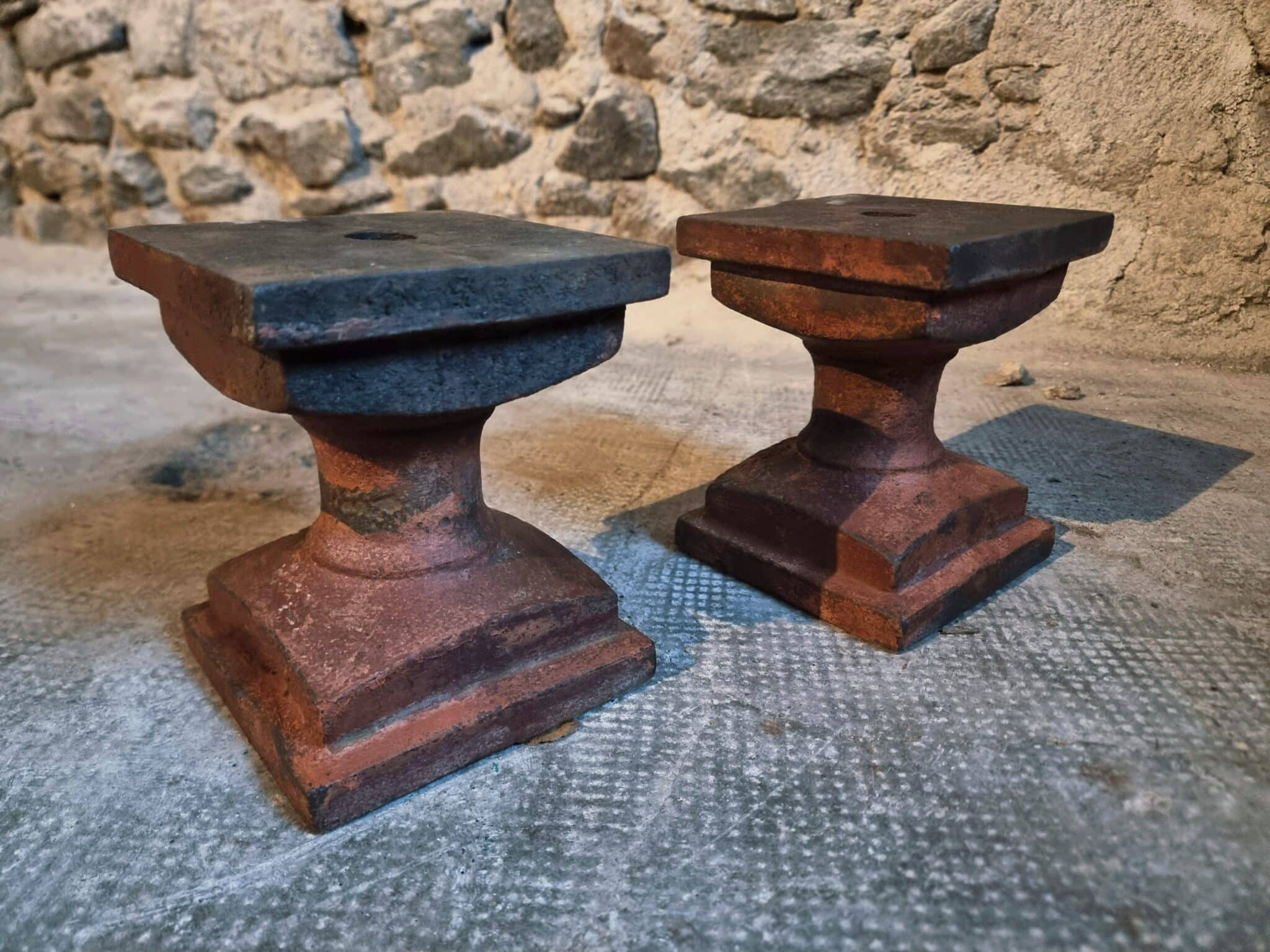 A striking and versatile pair of heavy cast-iron bases — perfect as candlesticks, display stands, or decorative architectural elements.