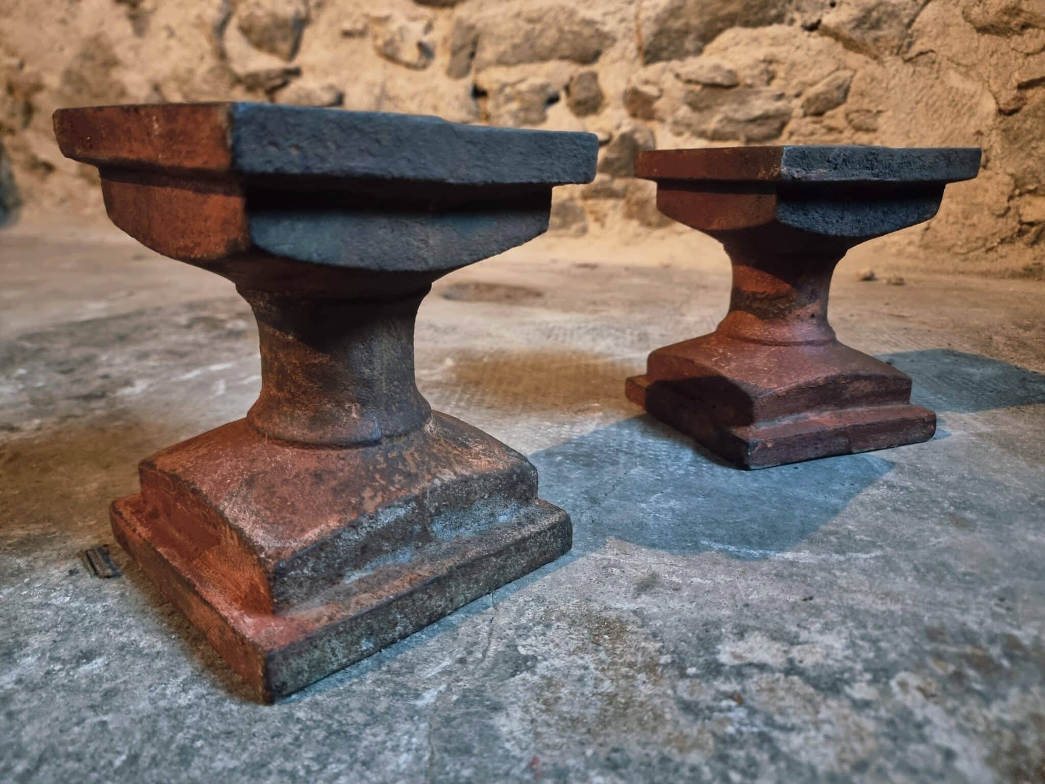 This pair of antique cast-iron architectural bases originates from France and dates from the late 19th to early 20th century. Originally used as support blocks for small columns or industrial fixtures, they feature a beautifully aged, authentic patina.