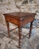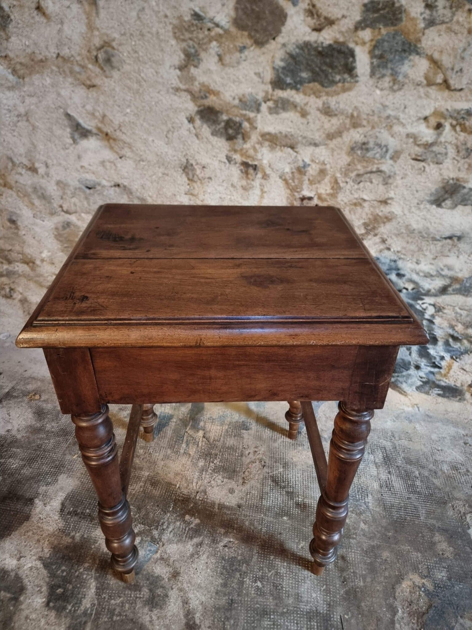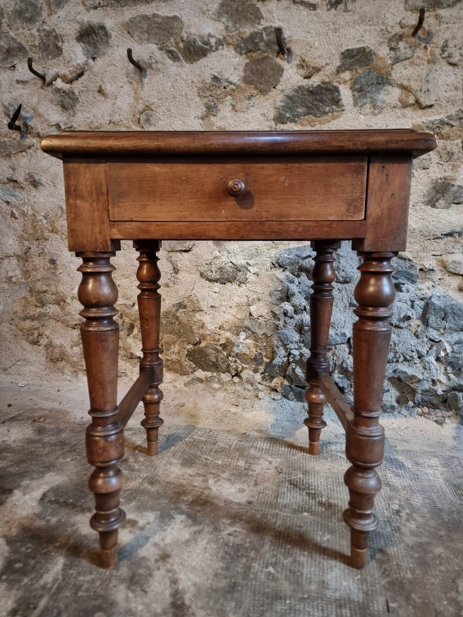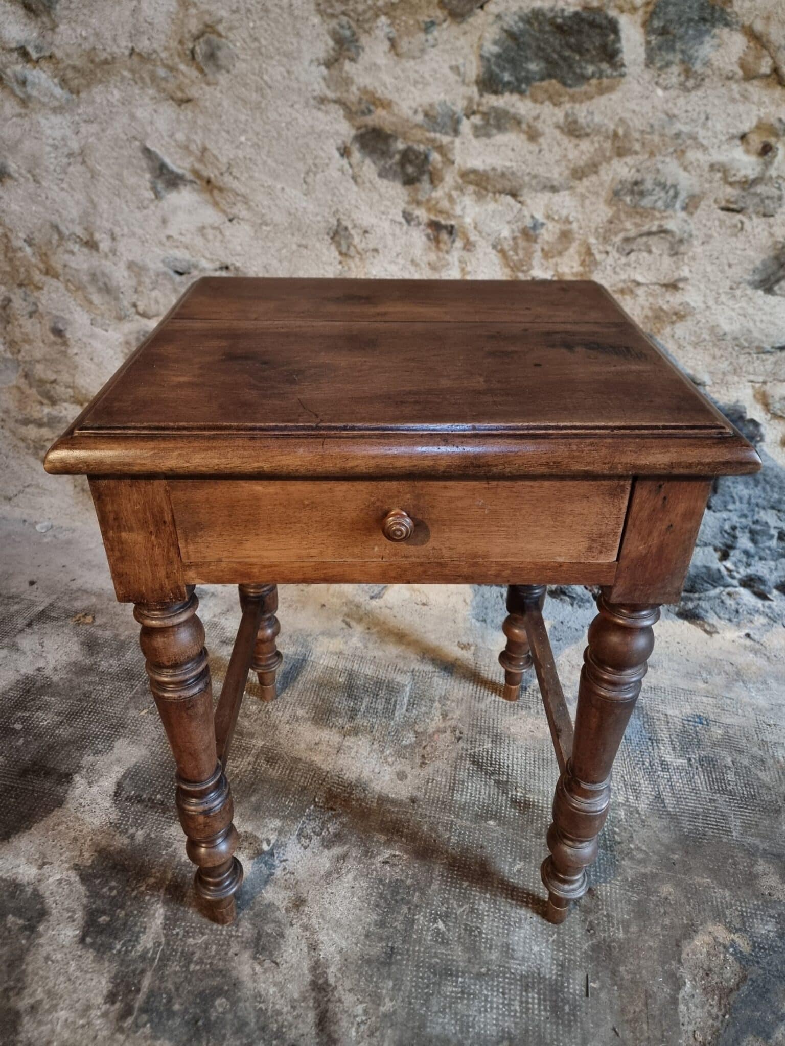 This beautiful solid walnut table features a single drawer with its original wooden knob, and turned legs joined by stretchers for extra stability and elegance.