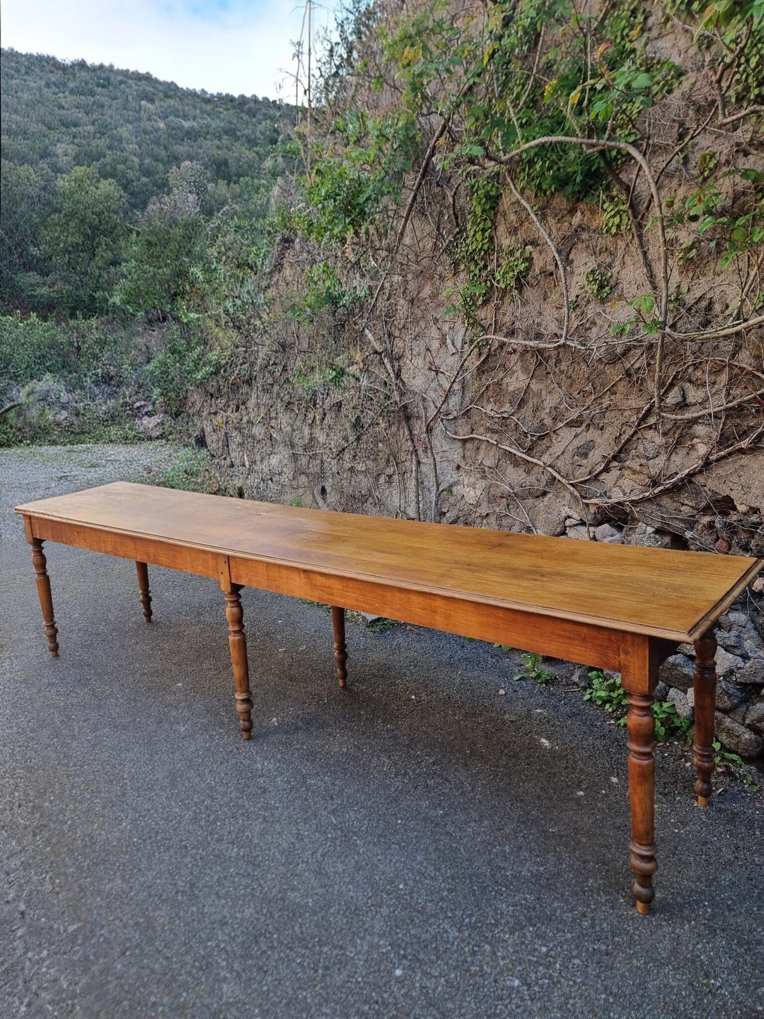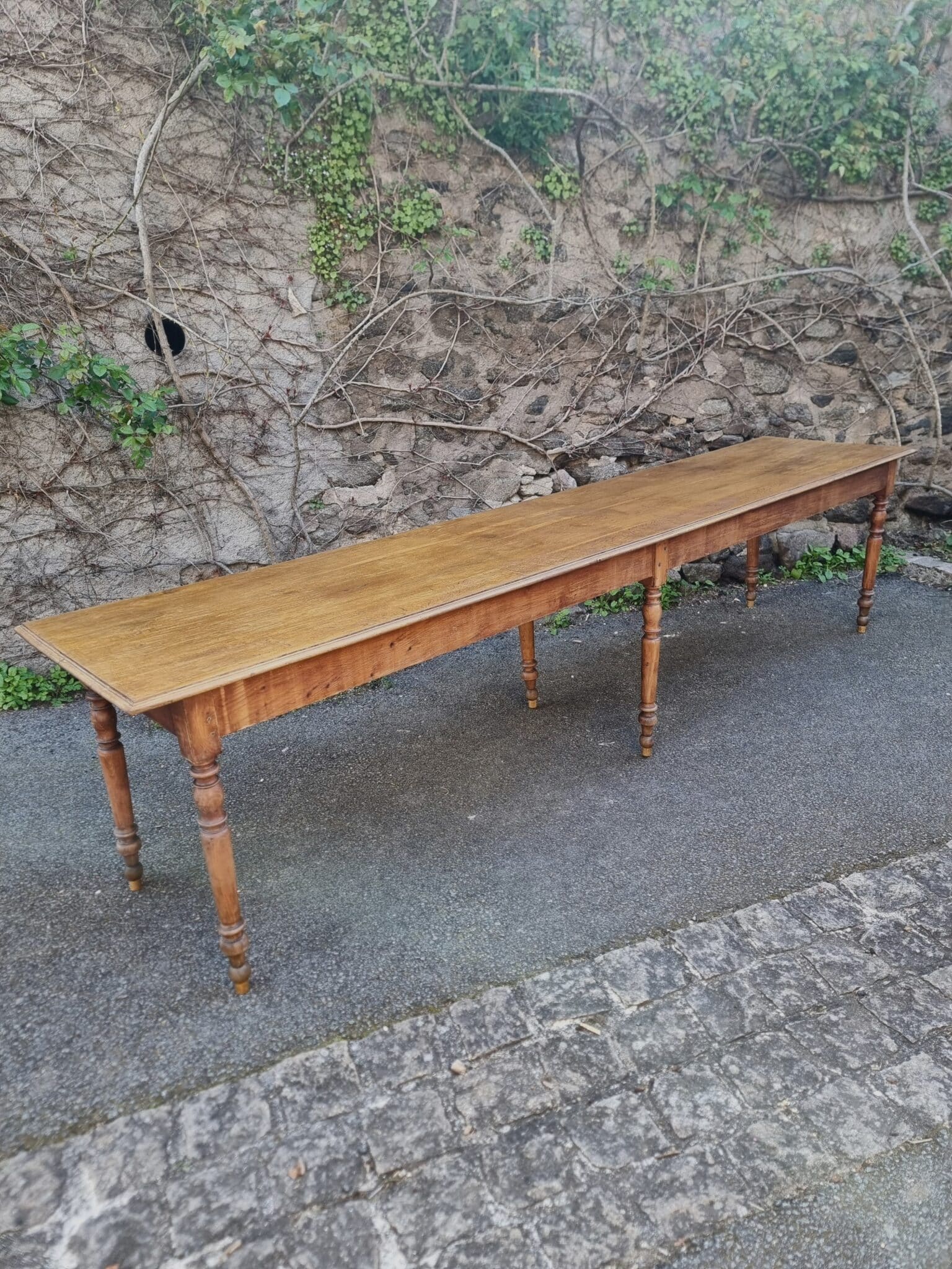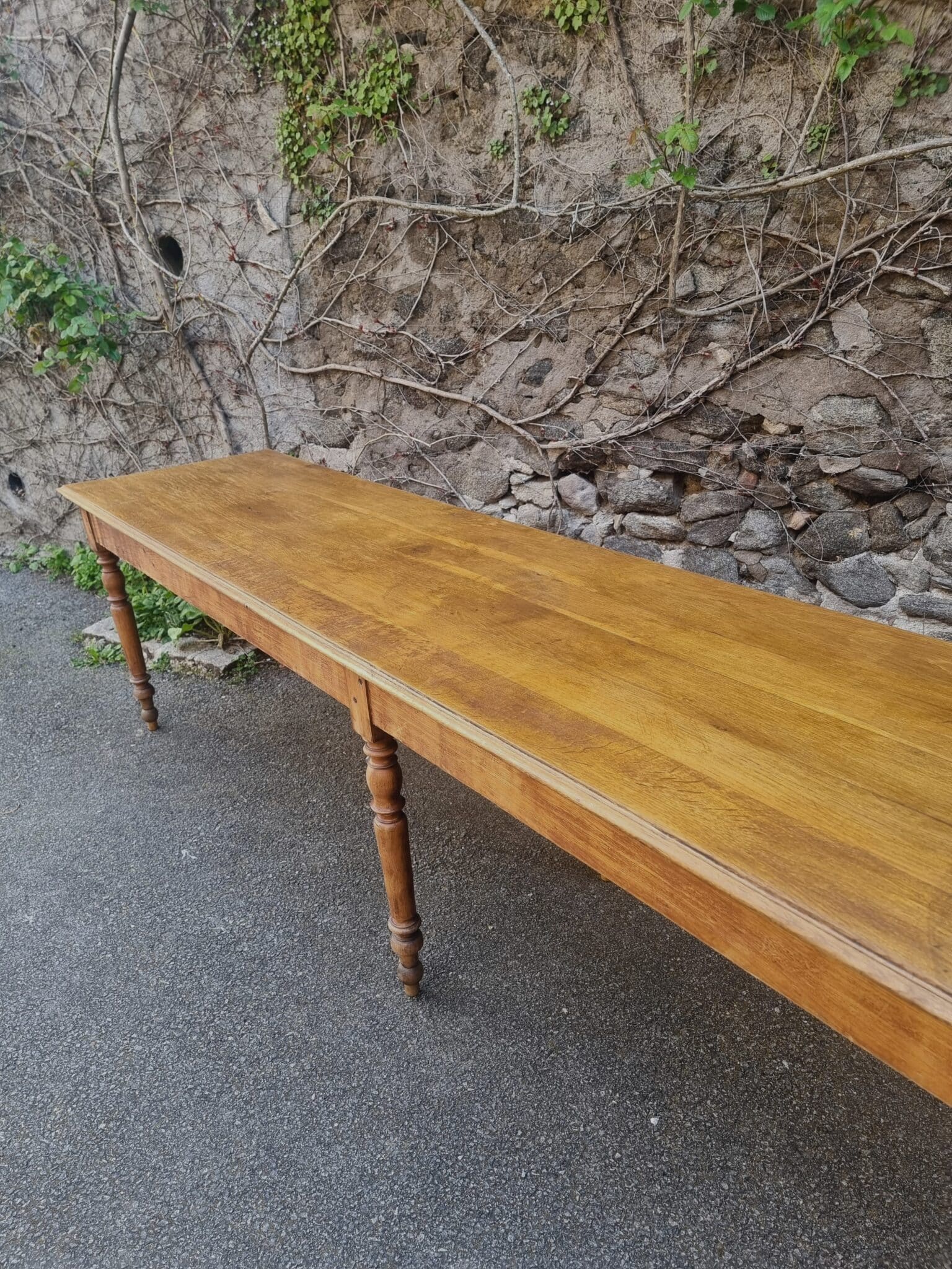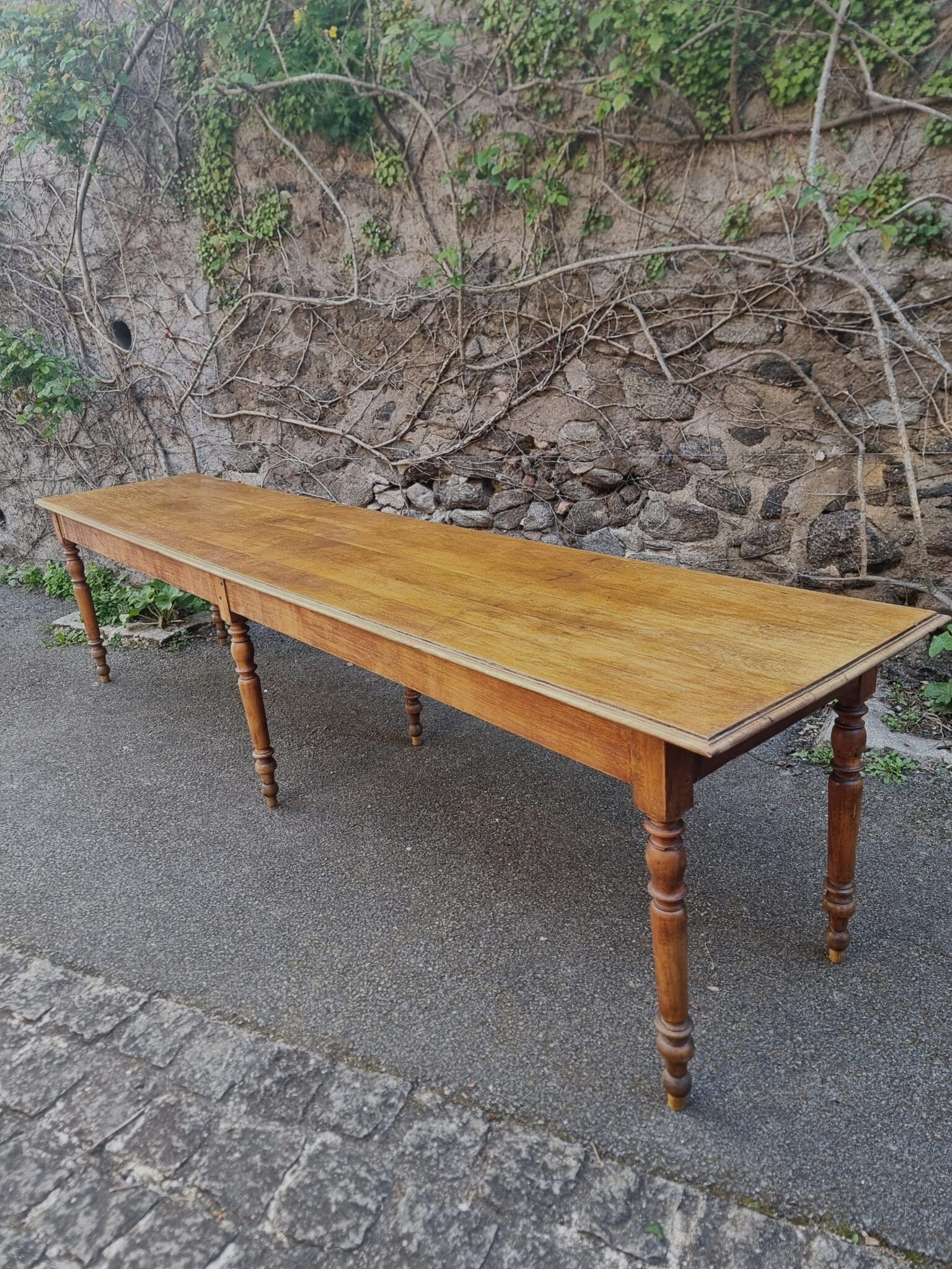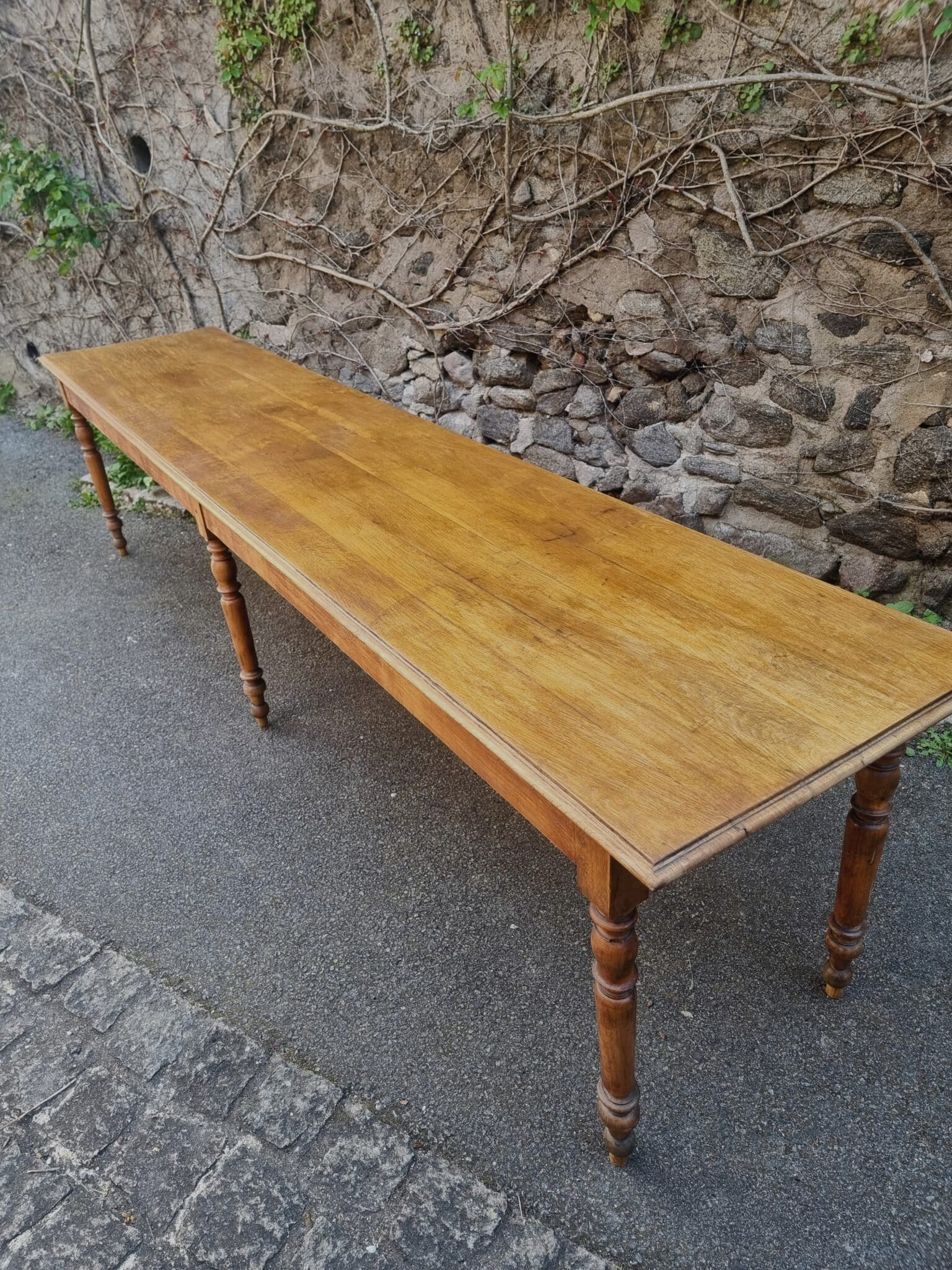 The table features a solid oak top combined with turned beech legs and pine side rails. The six-leg construction ensures excellent stability, even at its substantial length of over three meters.