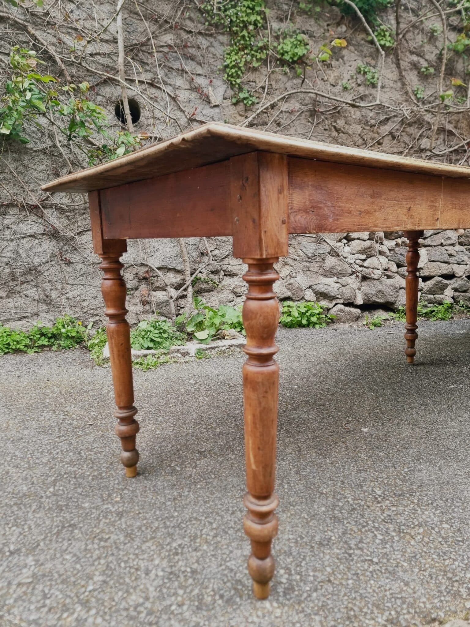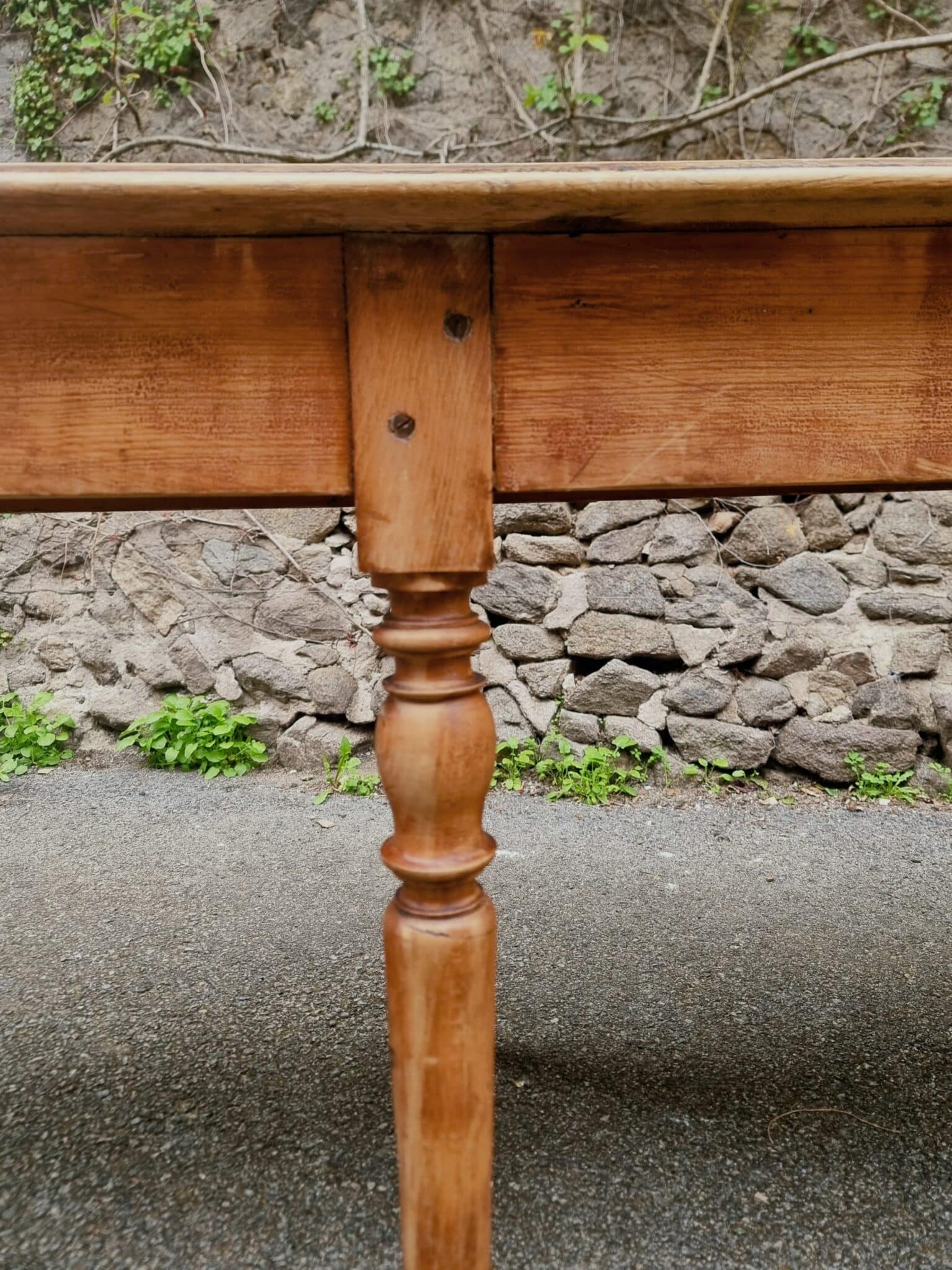 Its warm tones and naturally developed patina give the piece an authentic and timeless character. The elegant turned legs add a refined touch while maintaining a rustic, functional aesthetic.