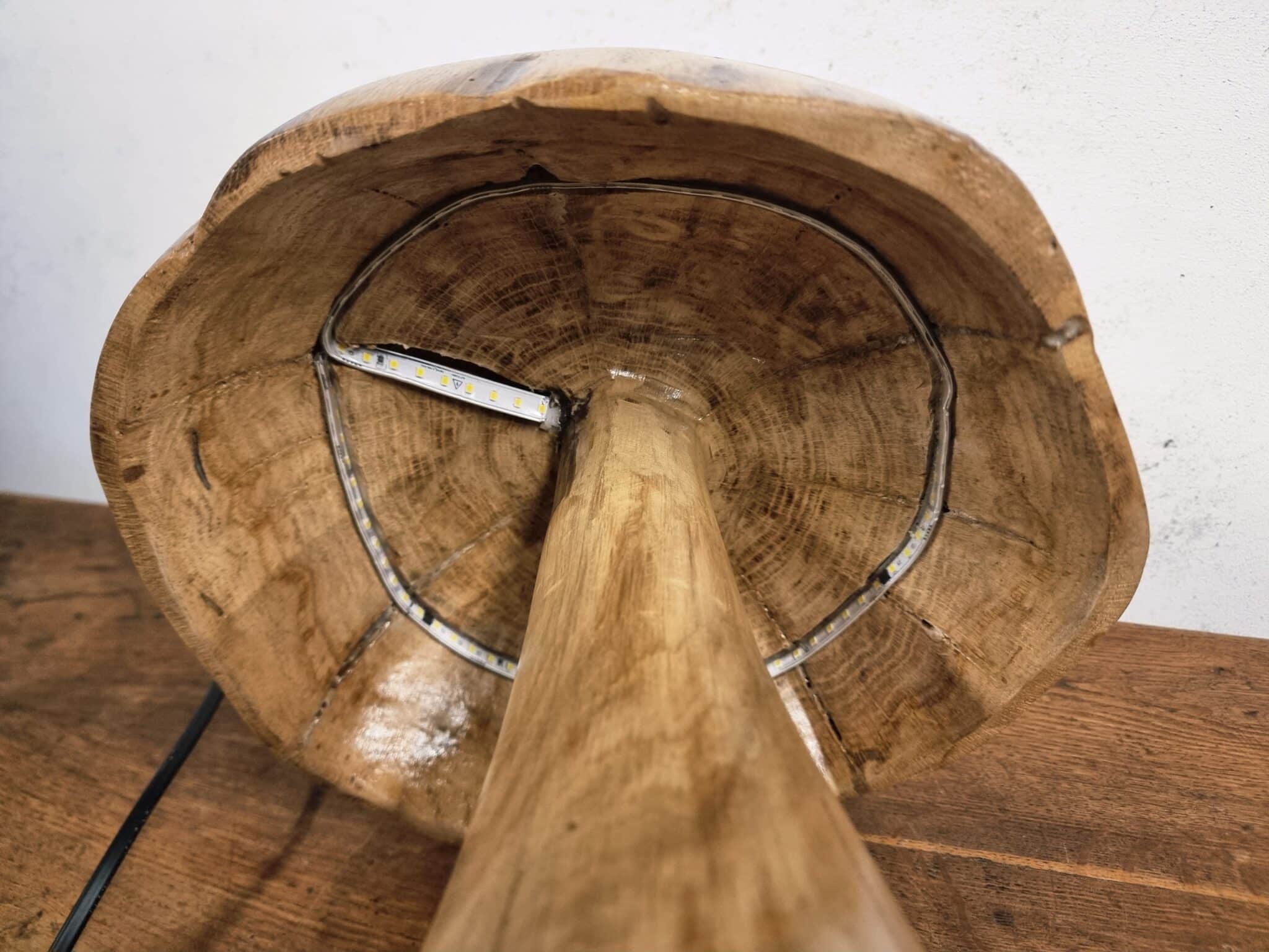 This table lamp is handcrafted from a single piece of solid oak wood by a local furniture maker and artist in the Allier region, France. The mushroom-shaped, sculptural form emphasizes the natural grain and character of the wood.