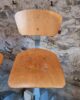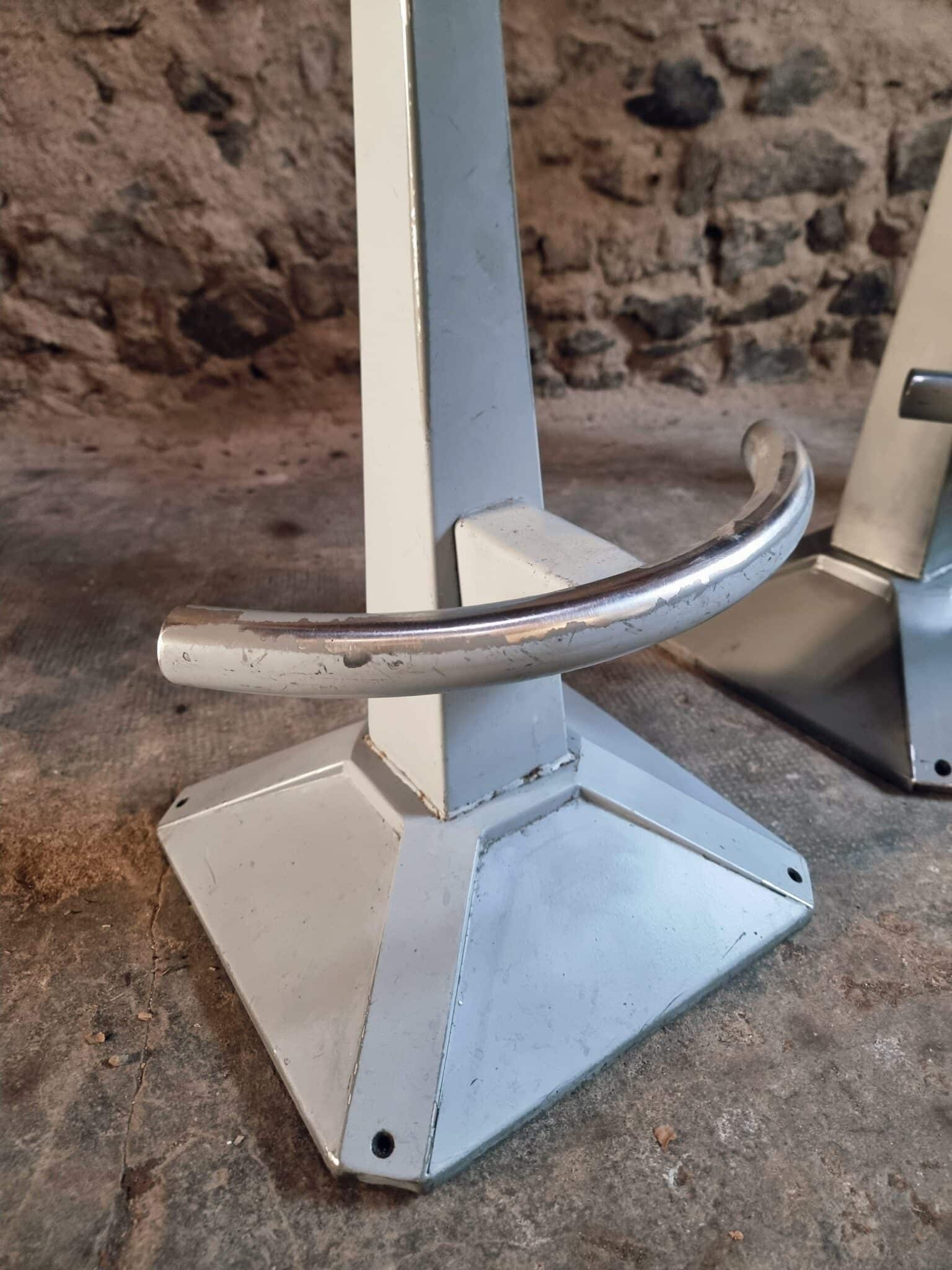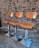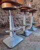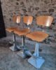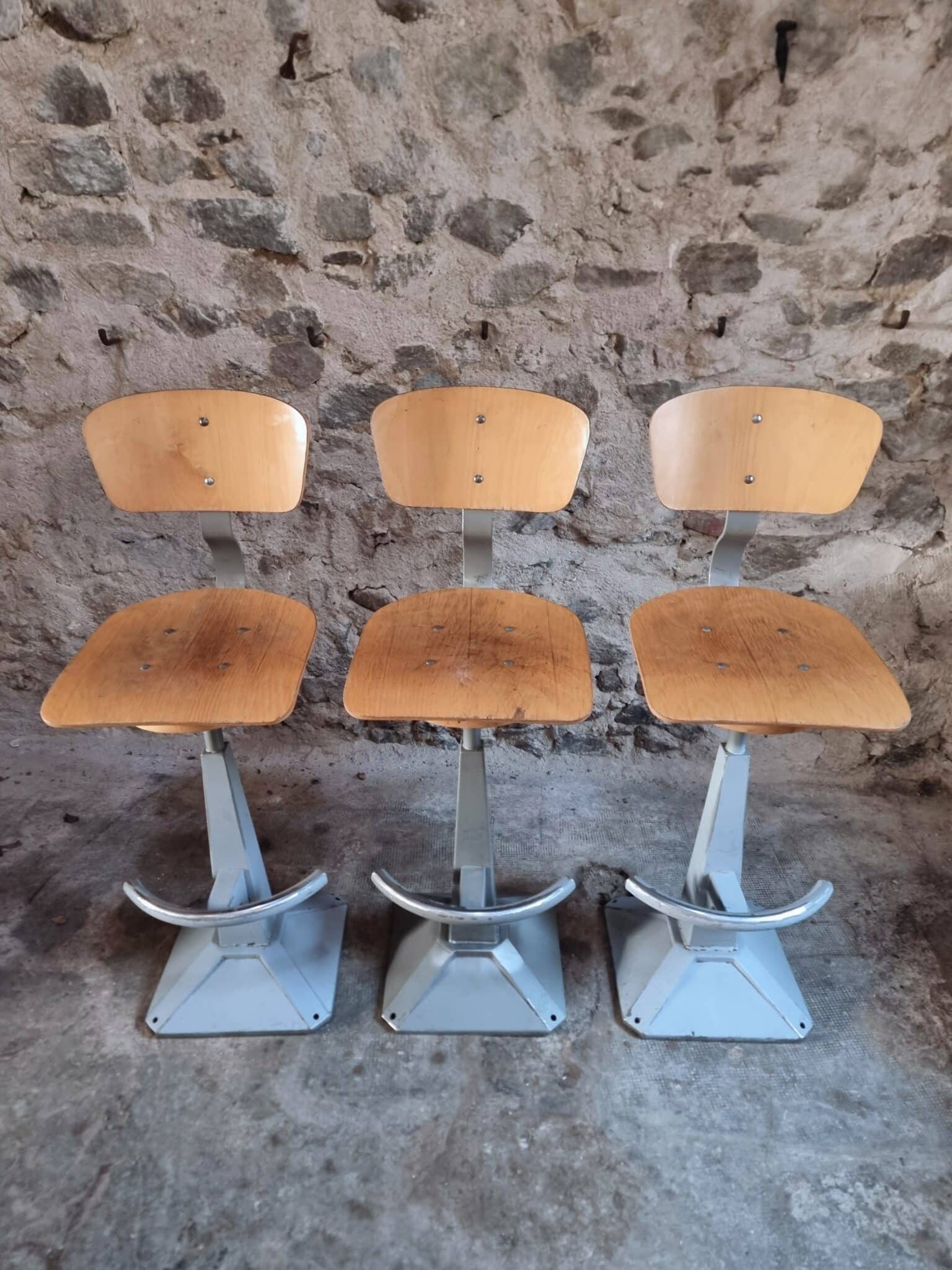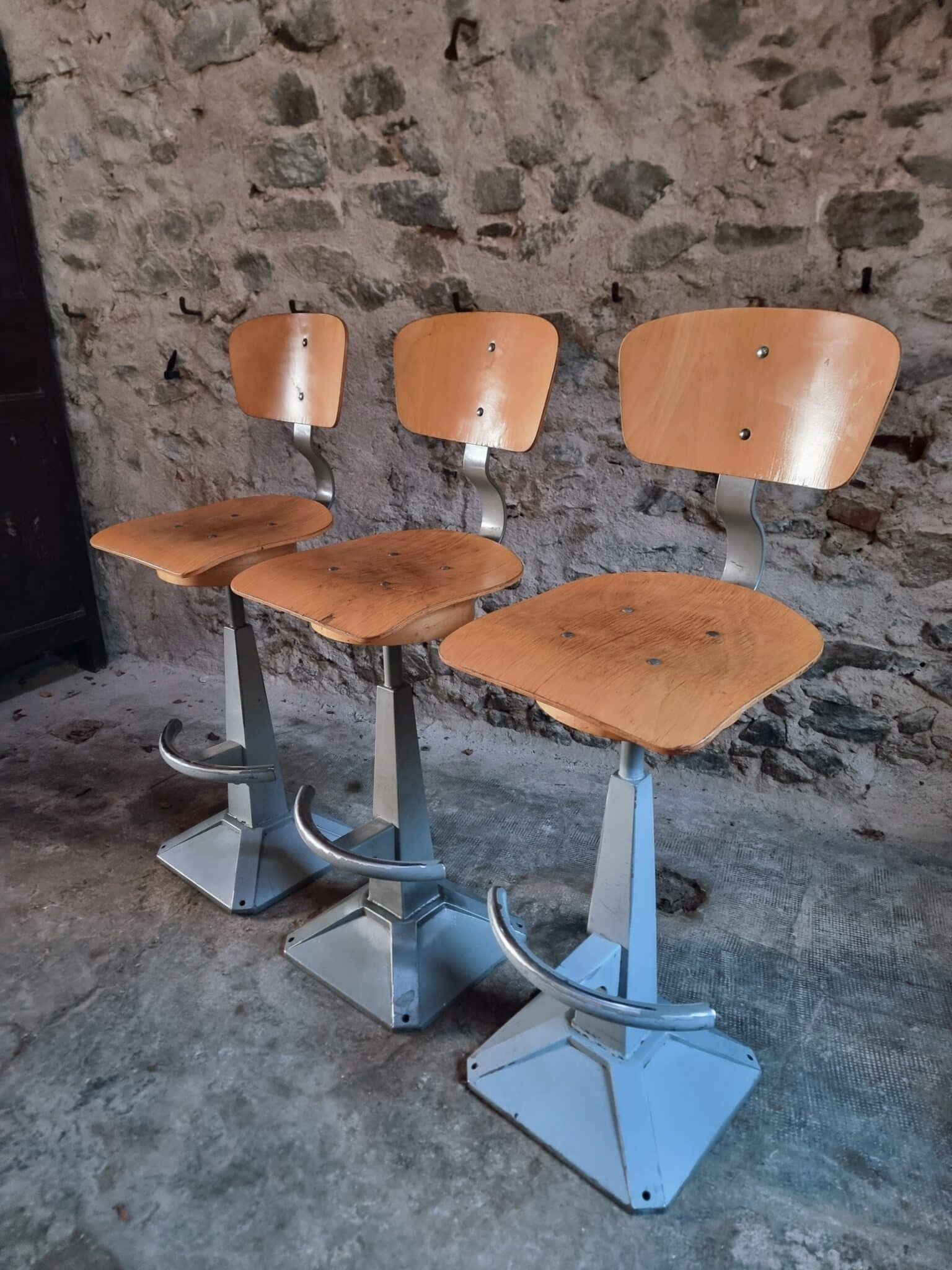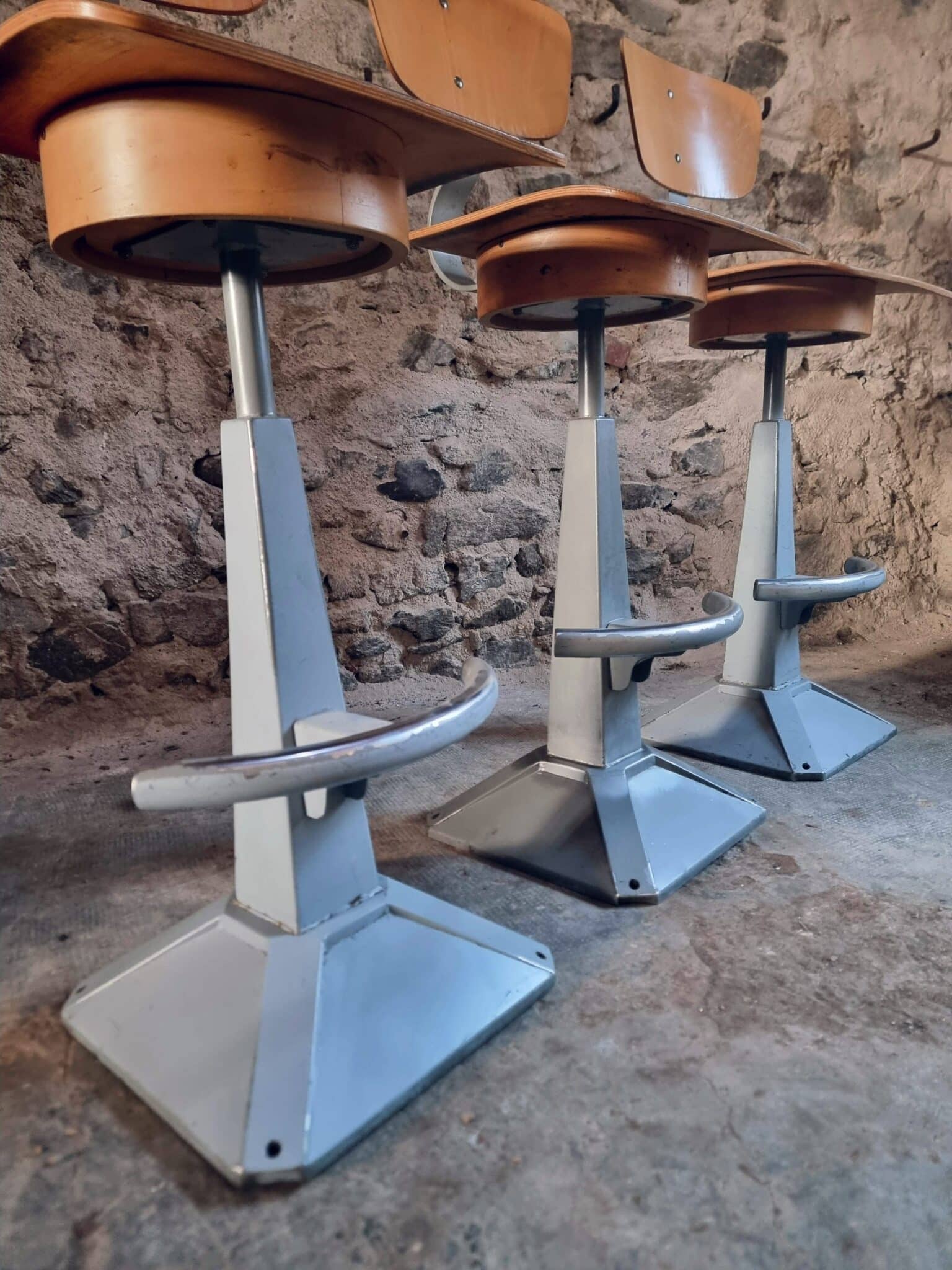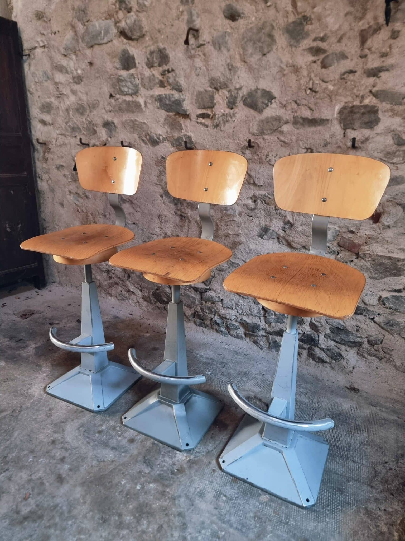 This set of three industrial swivel bar stools consists of mid-century workshop chairs with a functional and durable design. Originally intended for use in workshops or technical environments, the chairs combine practicality with a characteristic industrial appearance.