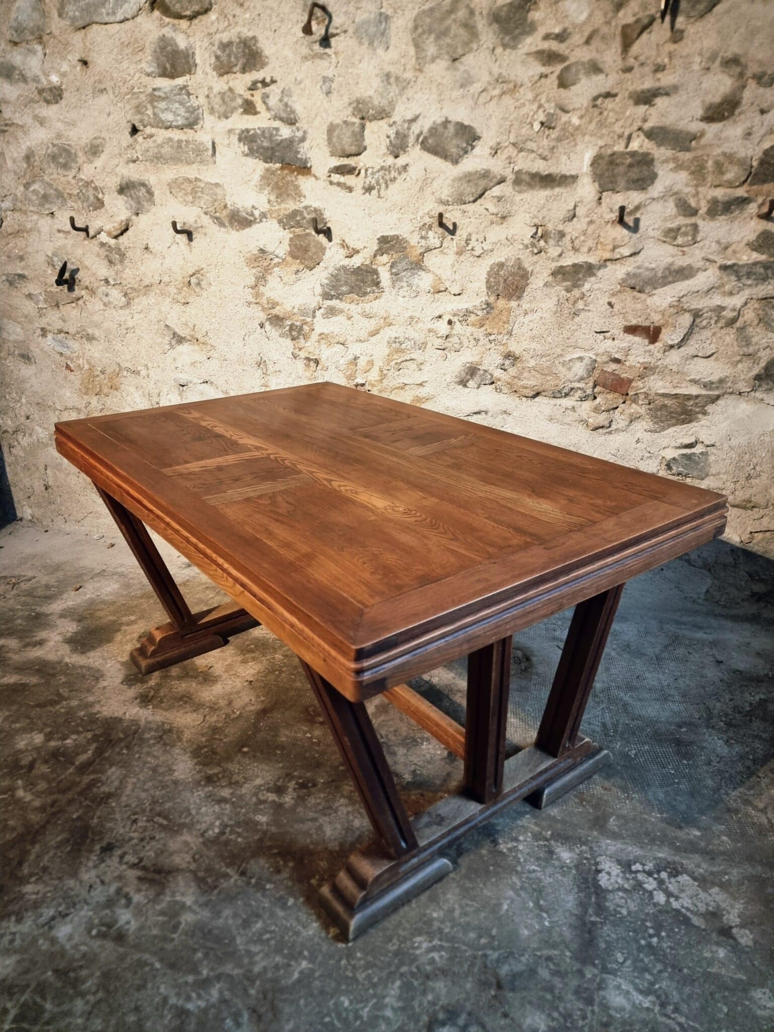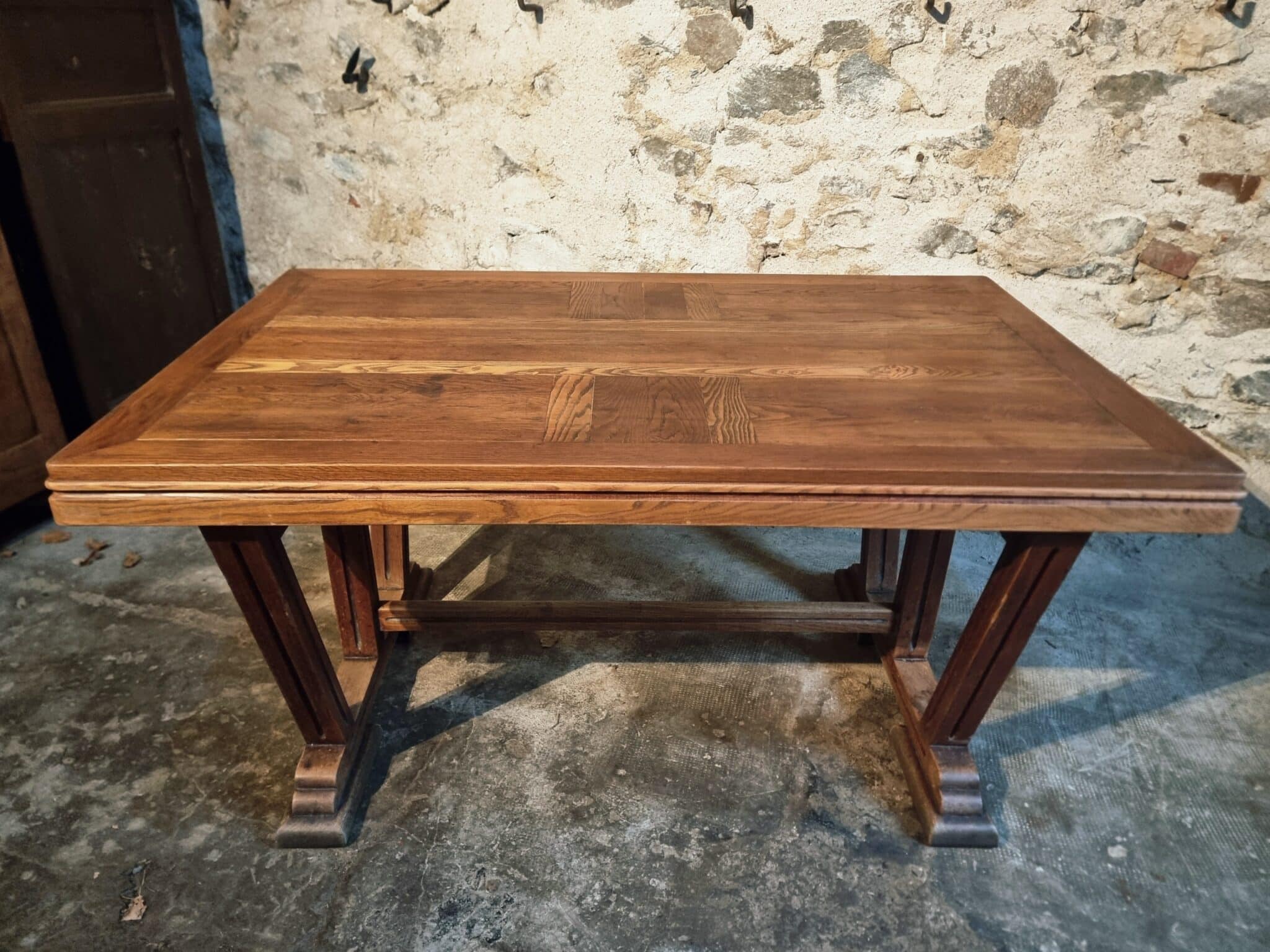 Vintage French dining table in the Arts & Crafts style, crafted from solid oak and dating from the 1930s–1940s.
