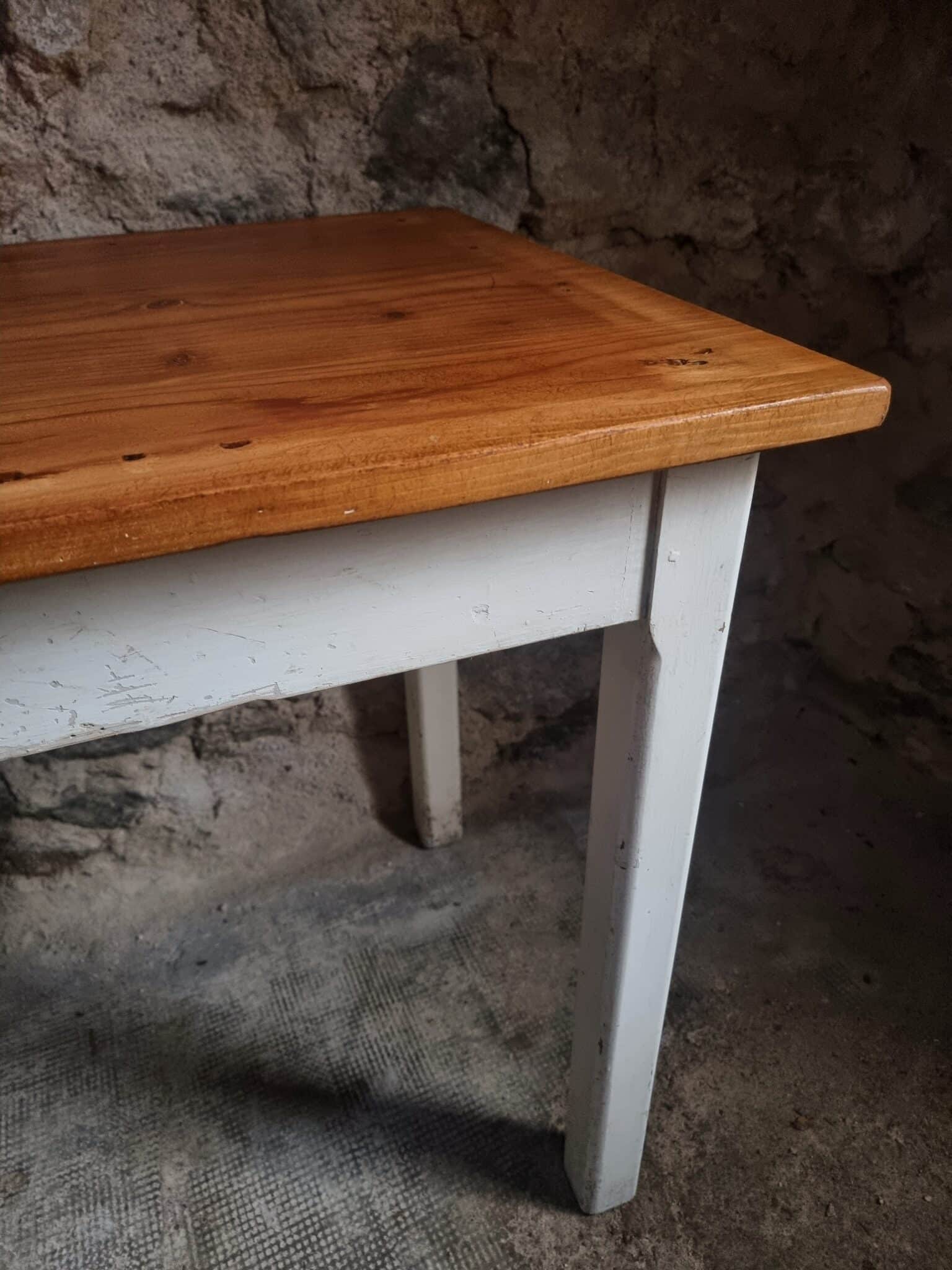 It features a solid pine tabletop with a warm, natural tone and beech wood legs painted in an off-white finish.