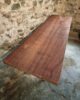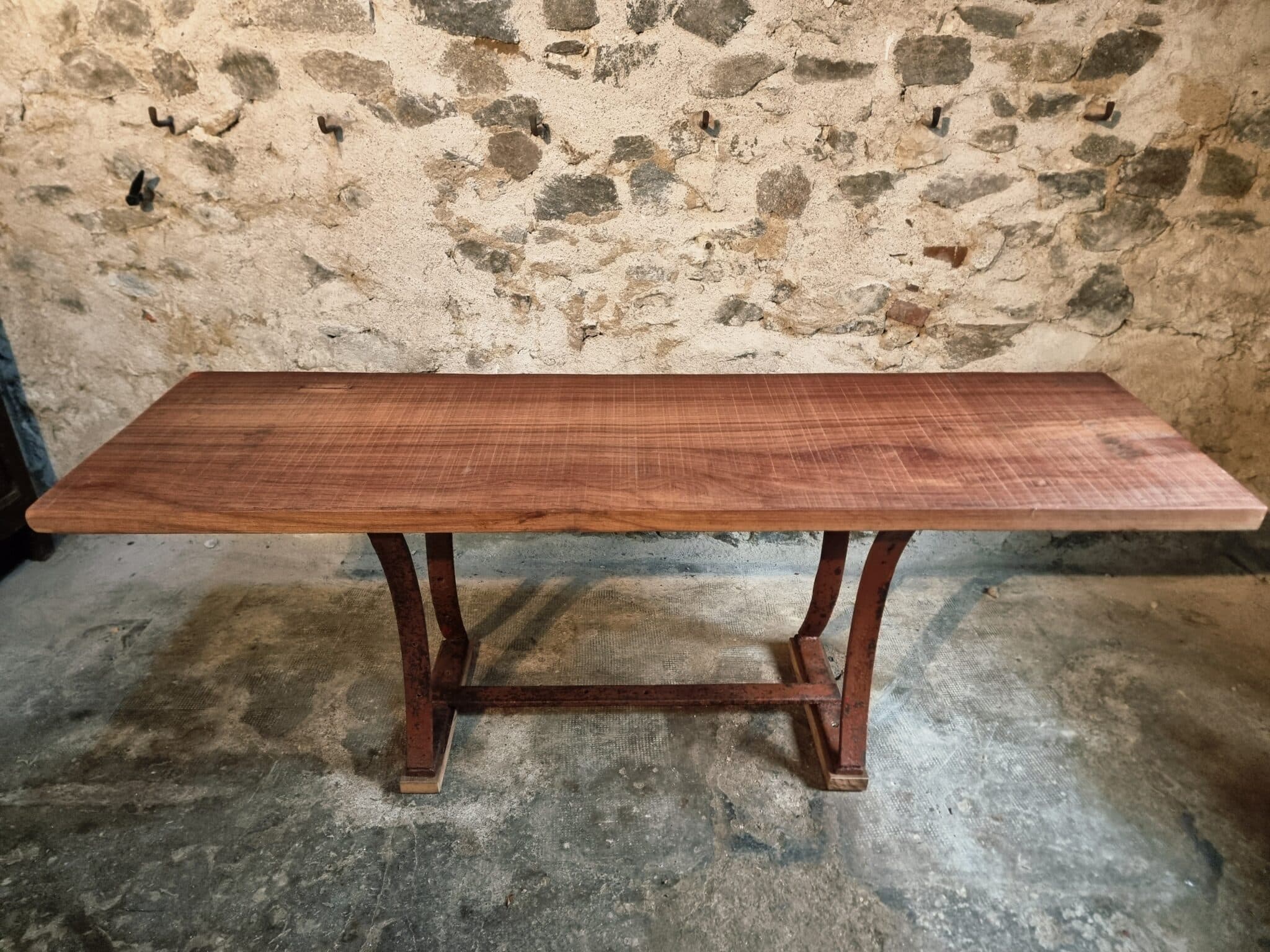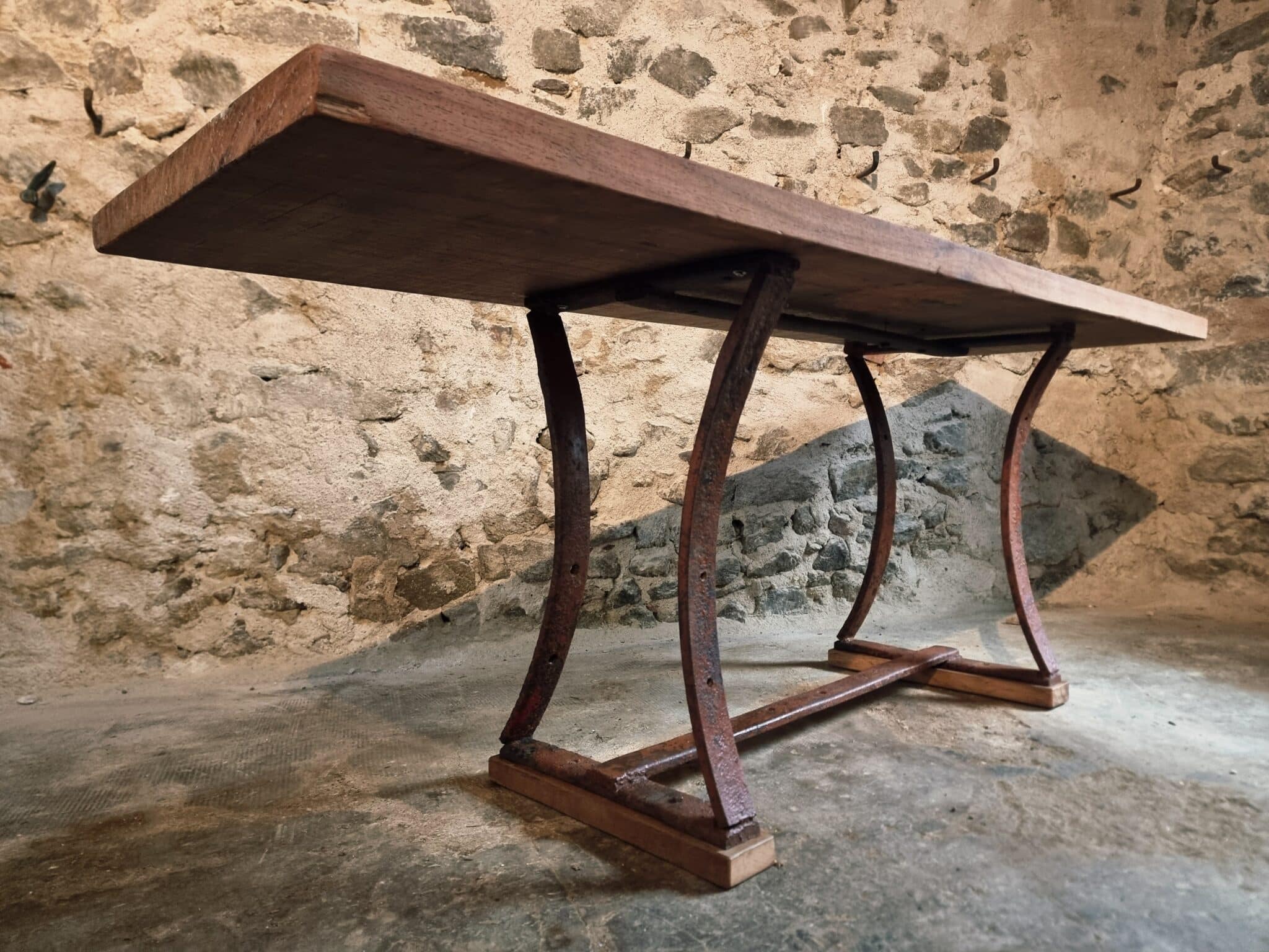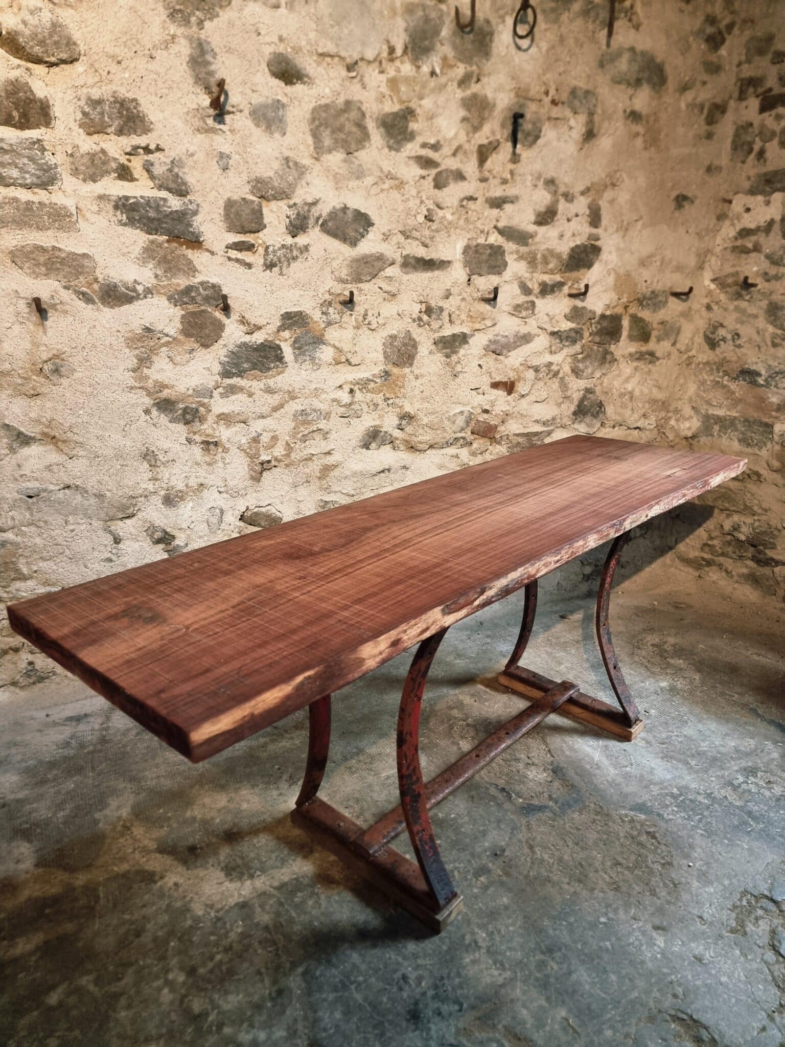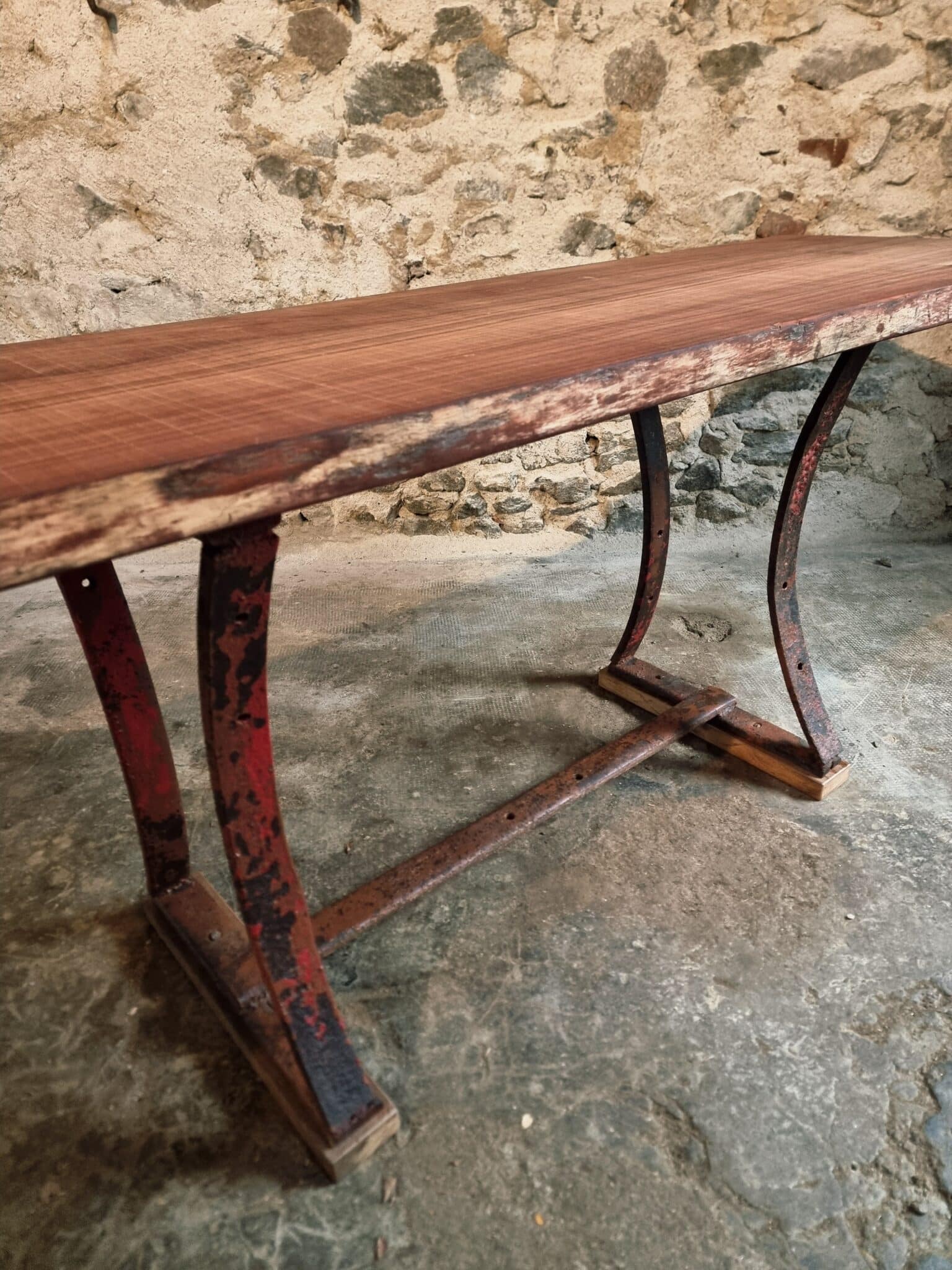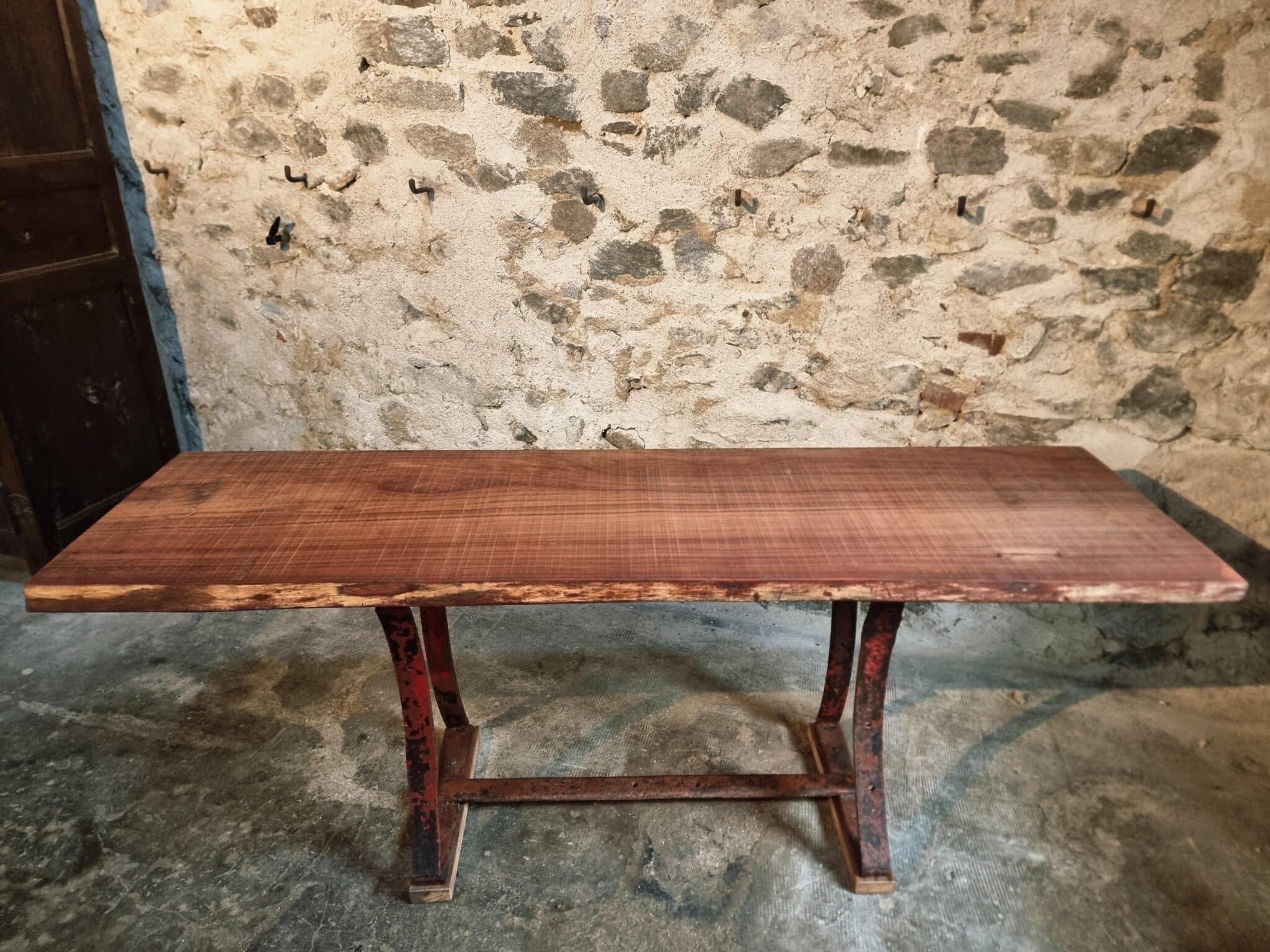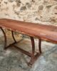 This vintage industrial table features a primitive iron base paired with a solid hardwood slab top measuring 5 cm thick. The natural grain, live-edge character and substantial weight of the wood create a striking contrast with the raw, aged metal frame.