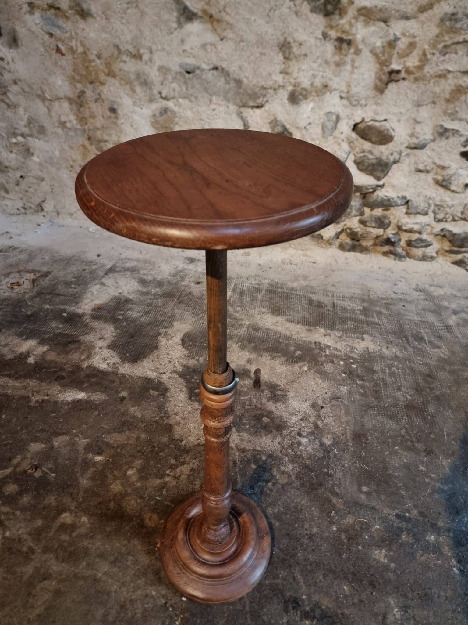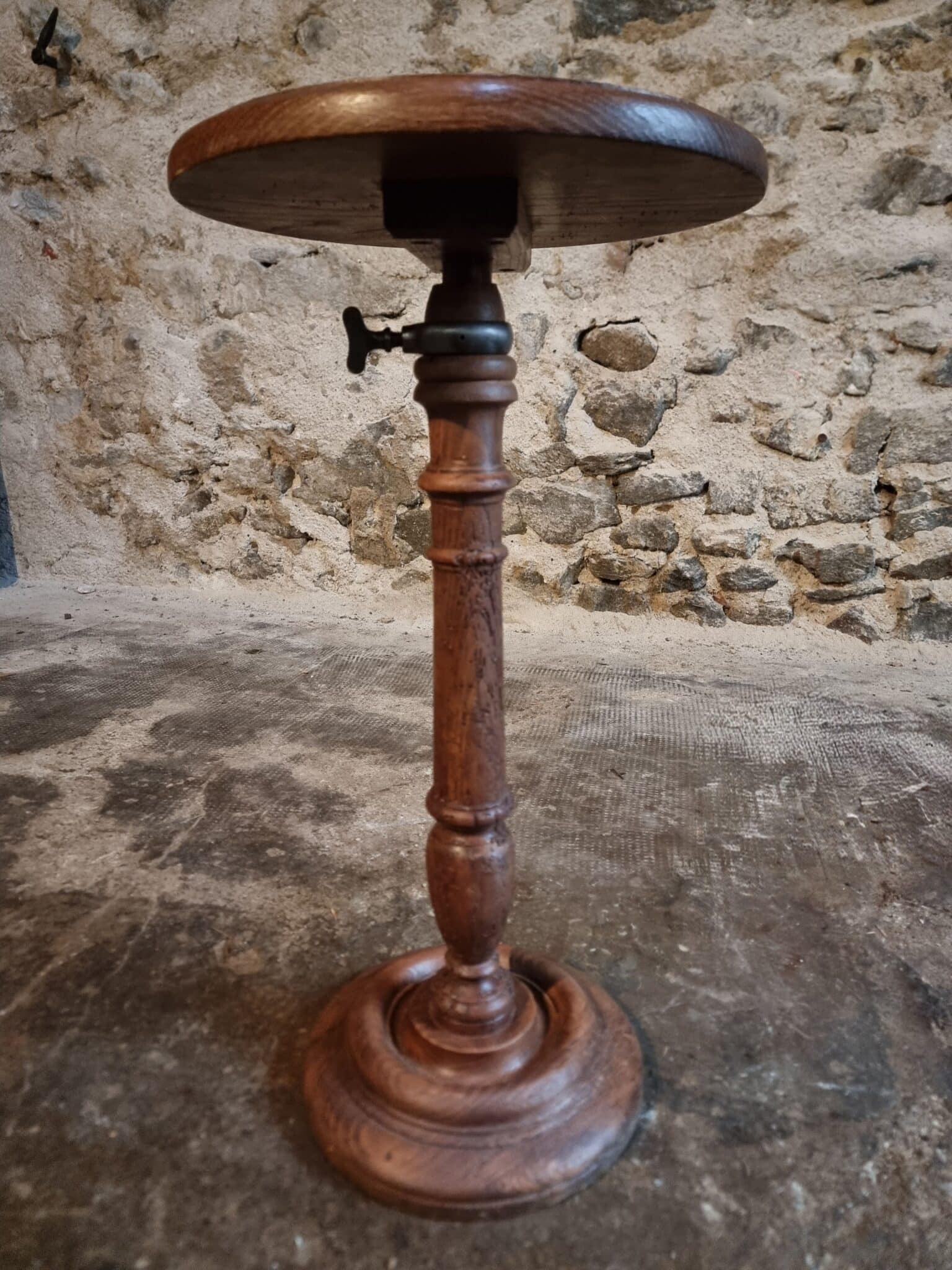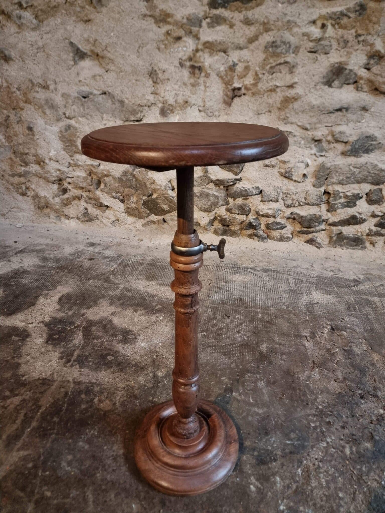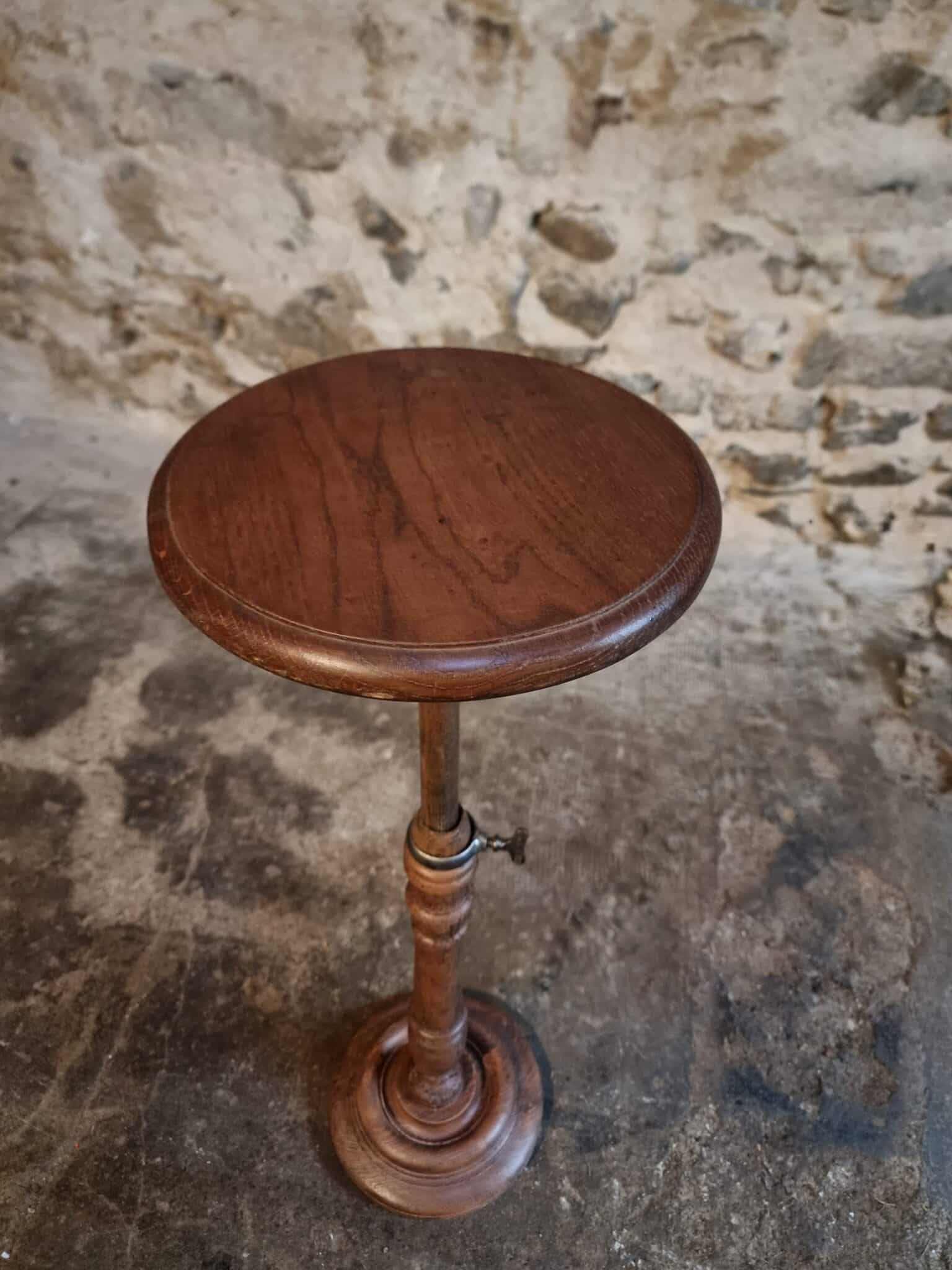 The round top rests on a finely turned oak pedestal with a sculpted circular base, showcasing the refined craftsmanship of early 20th-century French design. The height is adjustable, allowing the piece to serve a variety of functions.