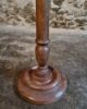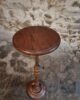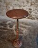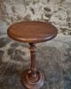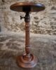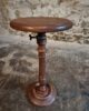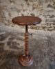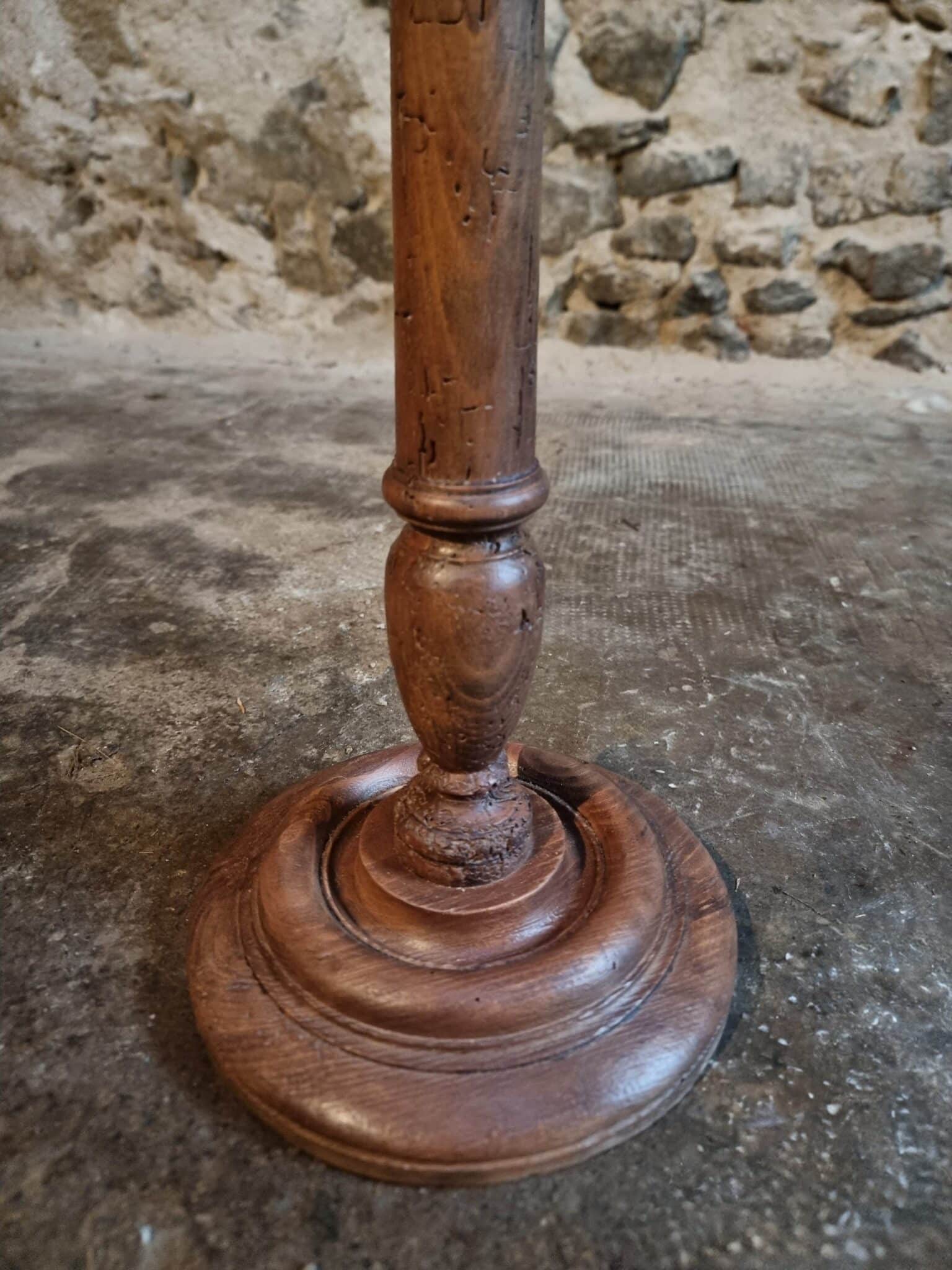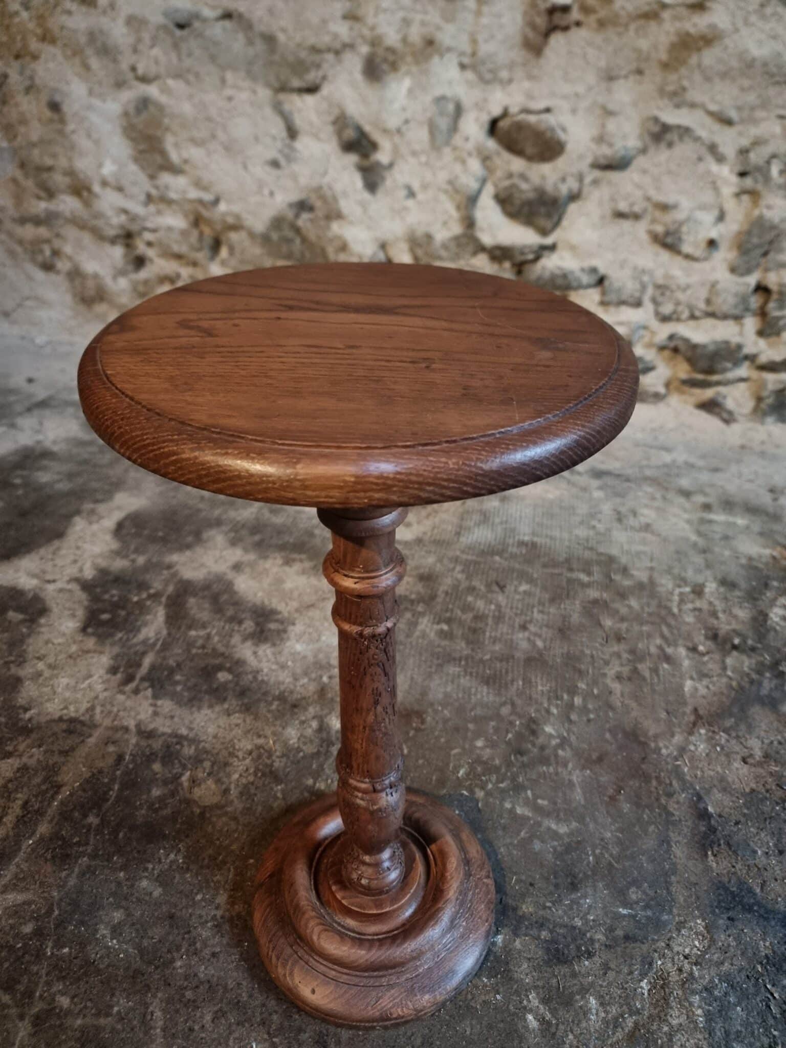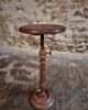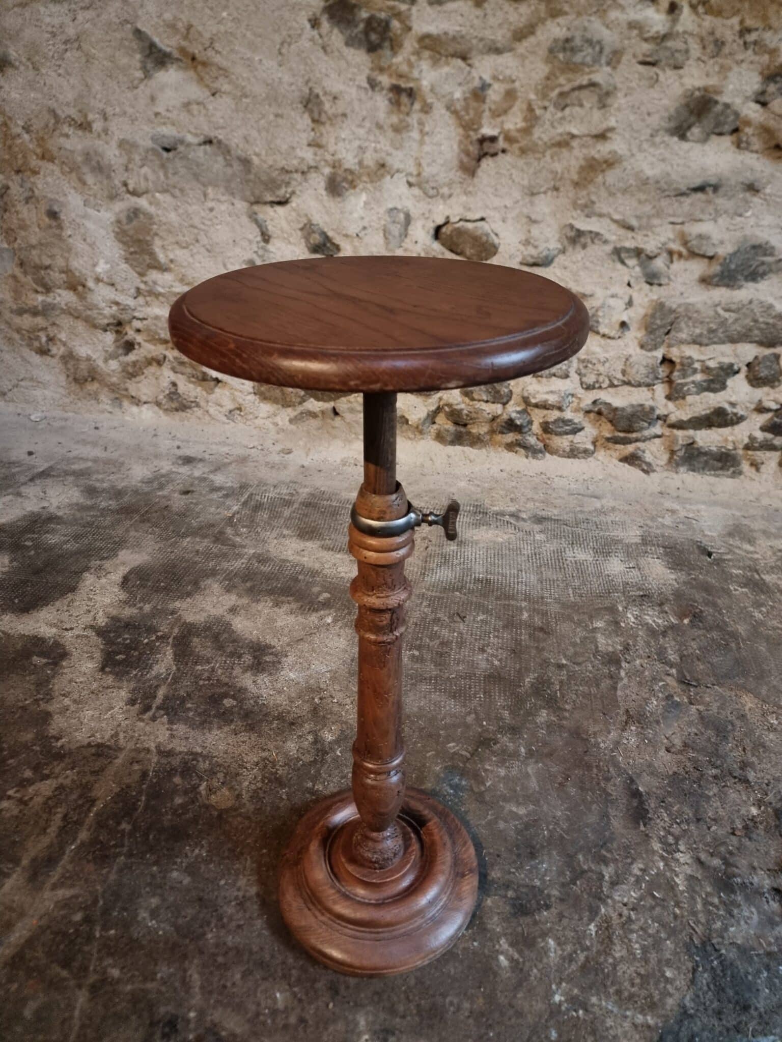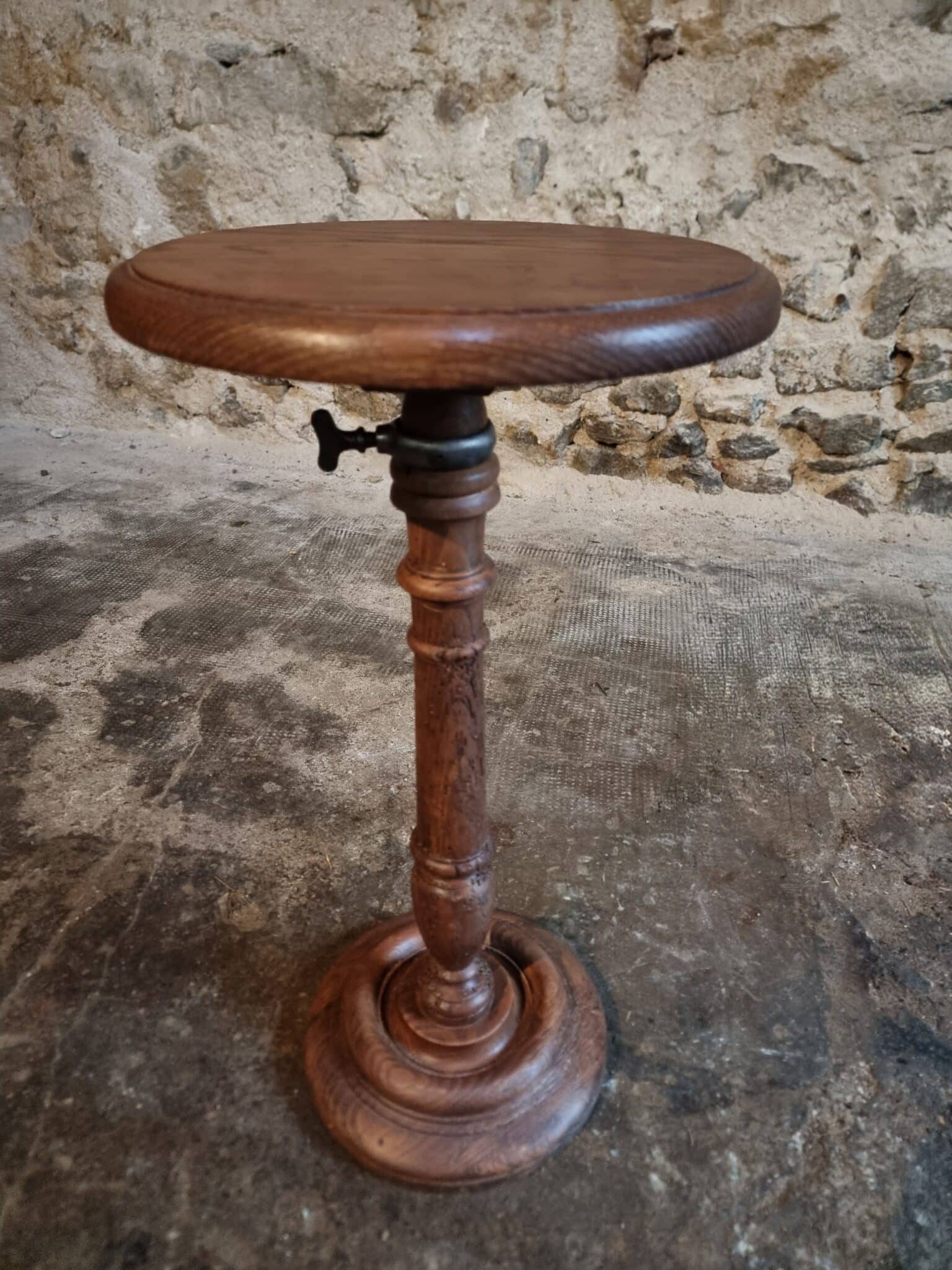 The round top rests on a finely turned oak pedestal with a sculpted circular base, showcasing the refined craftsmanship of early 20th-century French design. The height is adjustable, allowing the piece to serve a variety of functions.