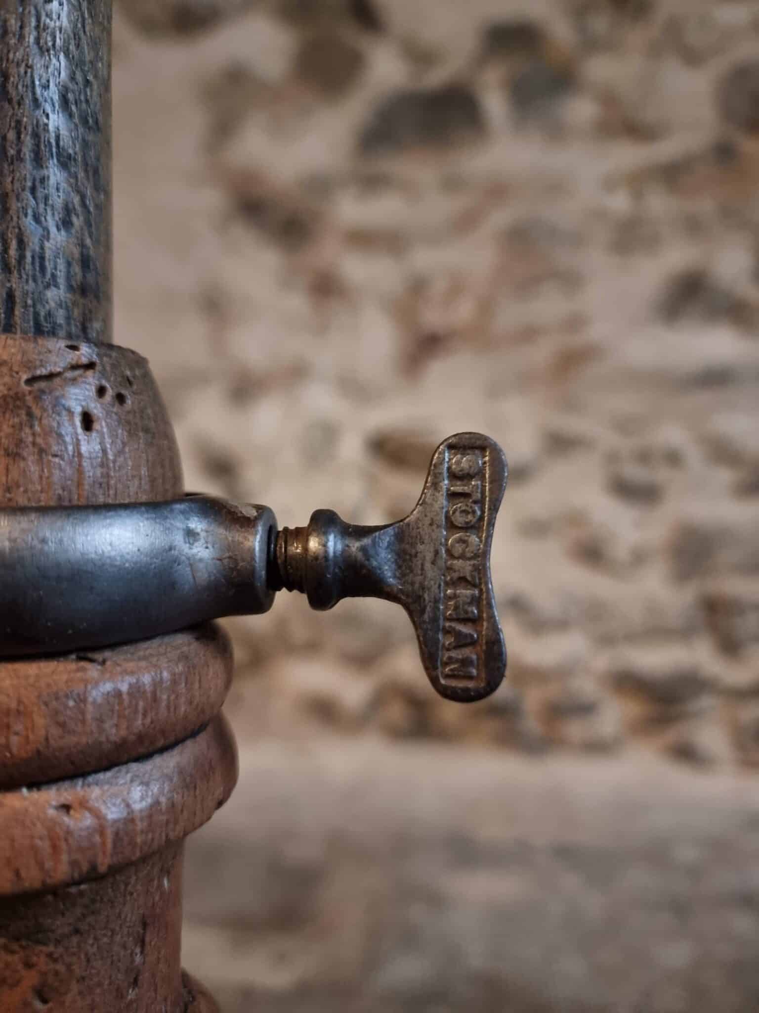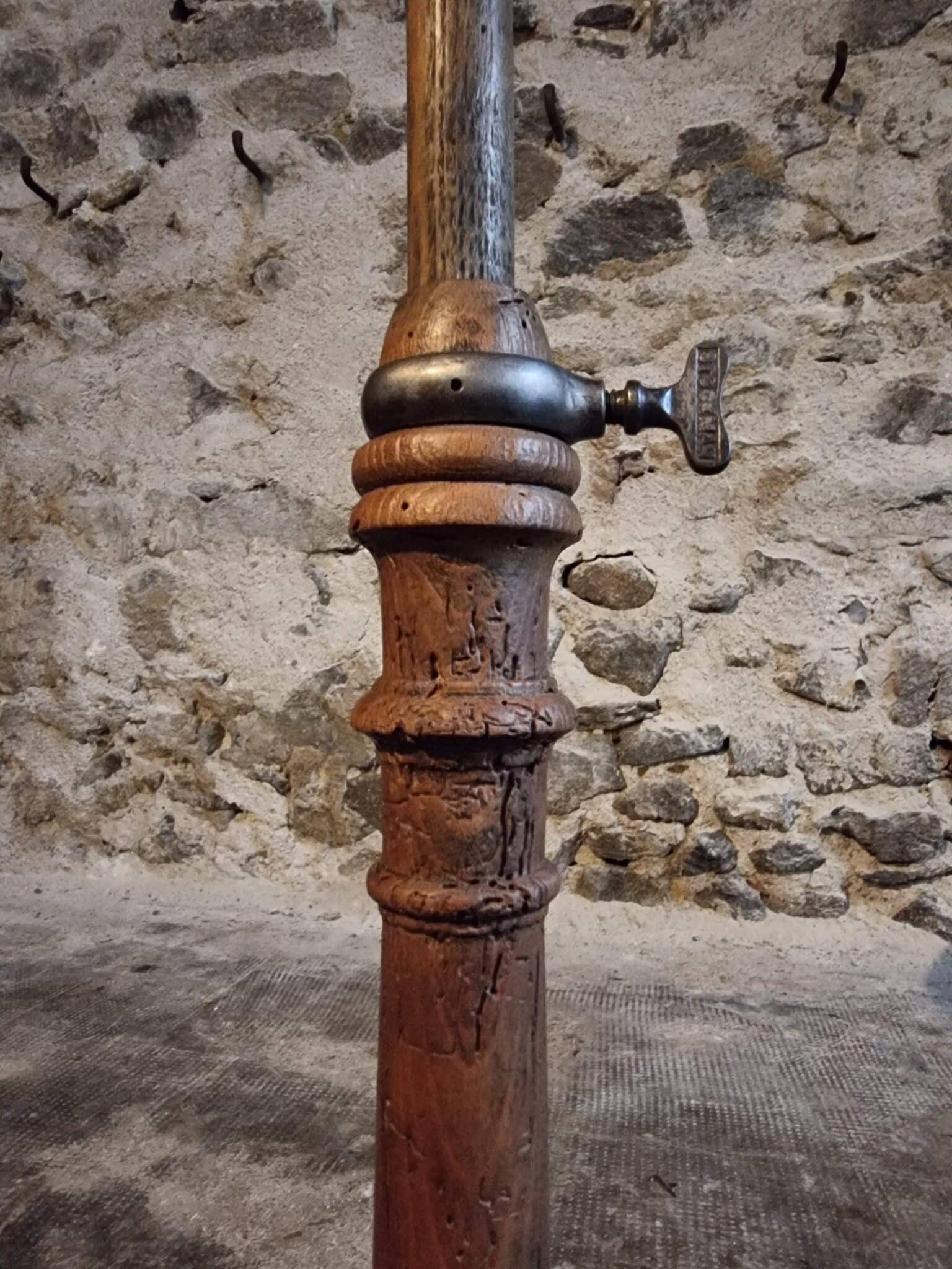 Made from solid oak, it features a beautifully aged natural patina and an original cast-iron adjustment screw stamped Stockman Paris.