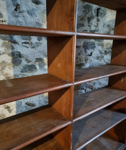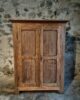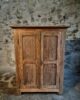 It features two hinged doors, both of which can be locked, opening to an interior fitted with fixed wooden shelves, offering generous storage space. The interior and exterior show natural wear and patina consistent with age and use, adding to the piece’s historical character.