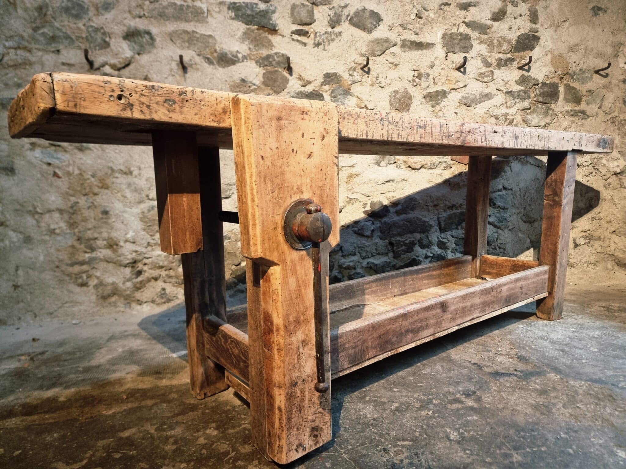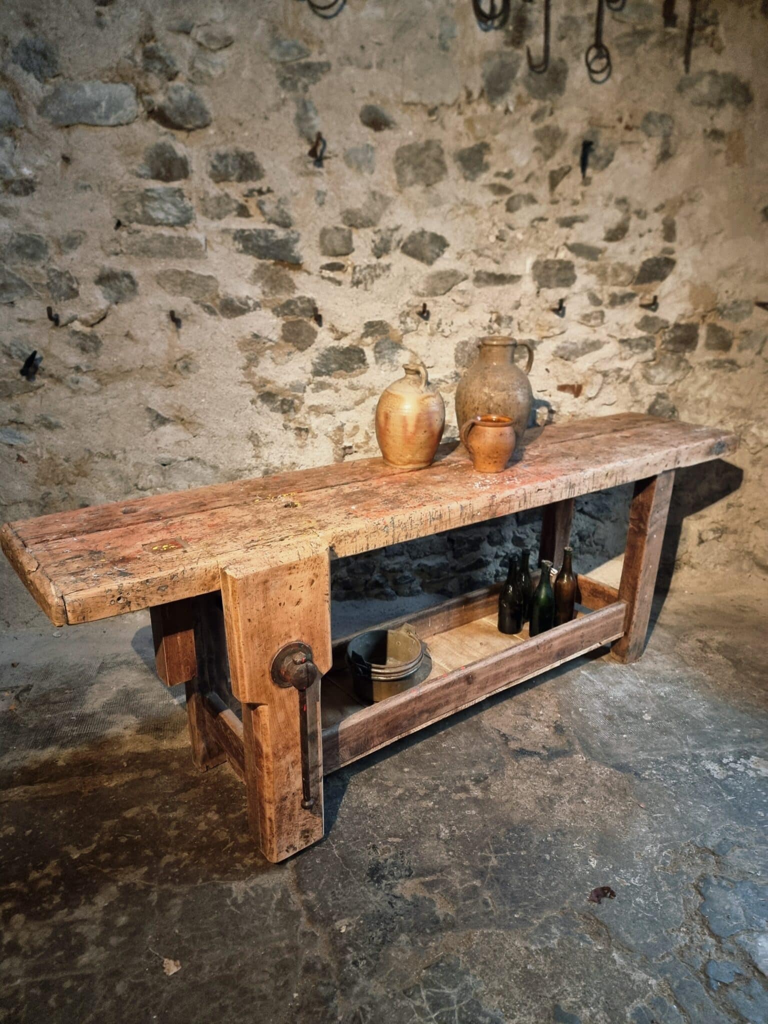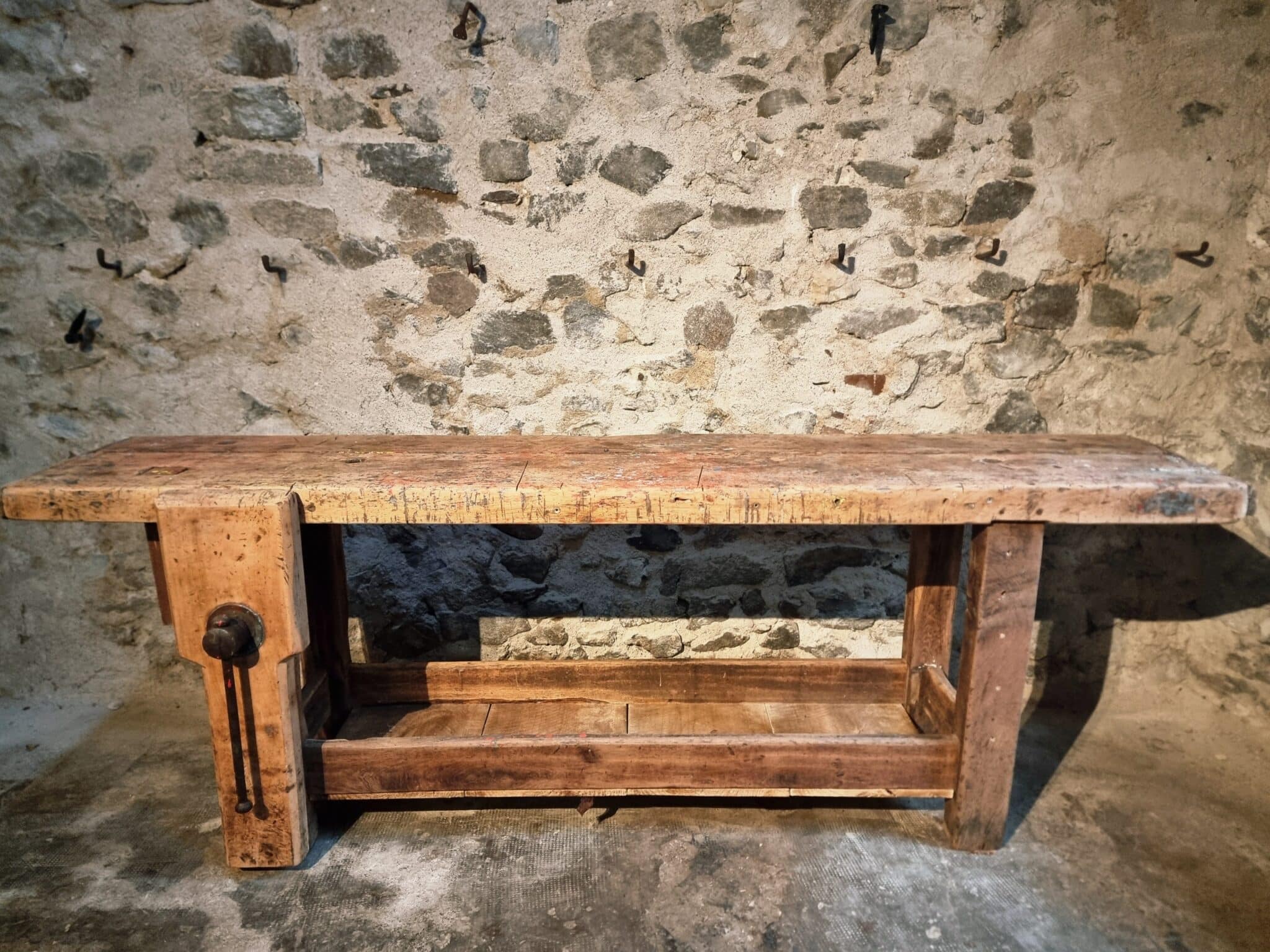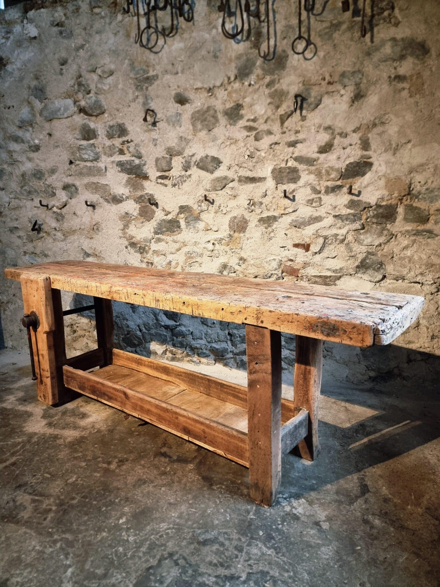 Impressive antique French carpenter’s workbench dating from around 1900, beautifully aged with the authentic patina of over a century of use.