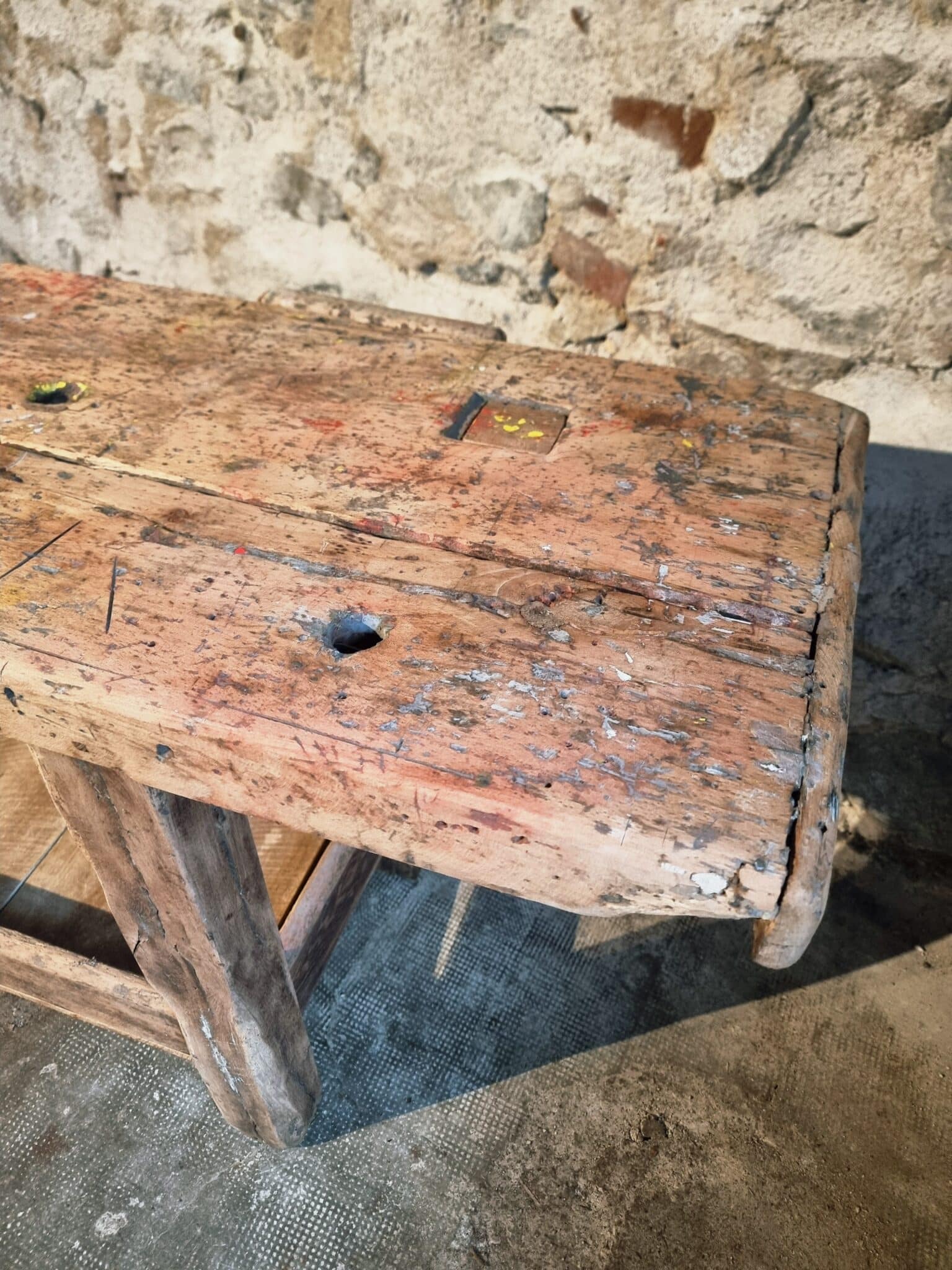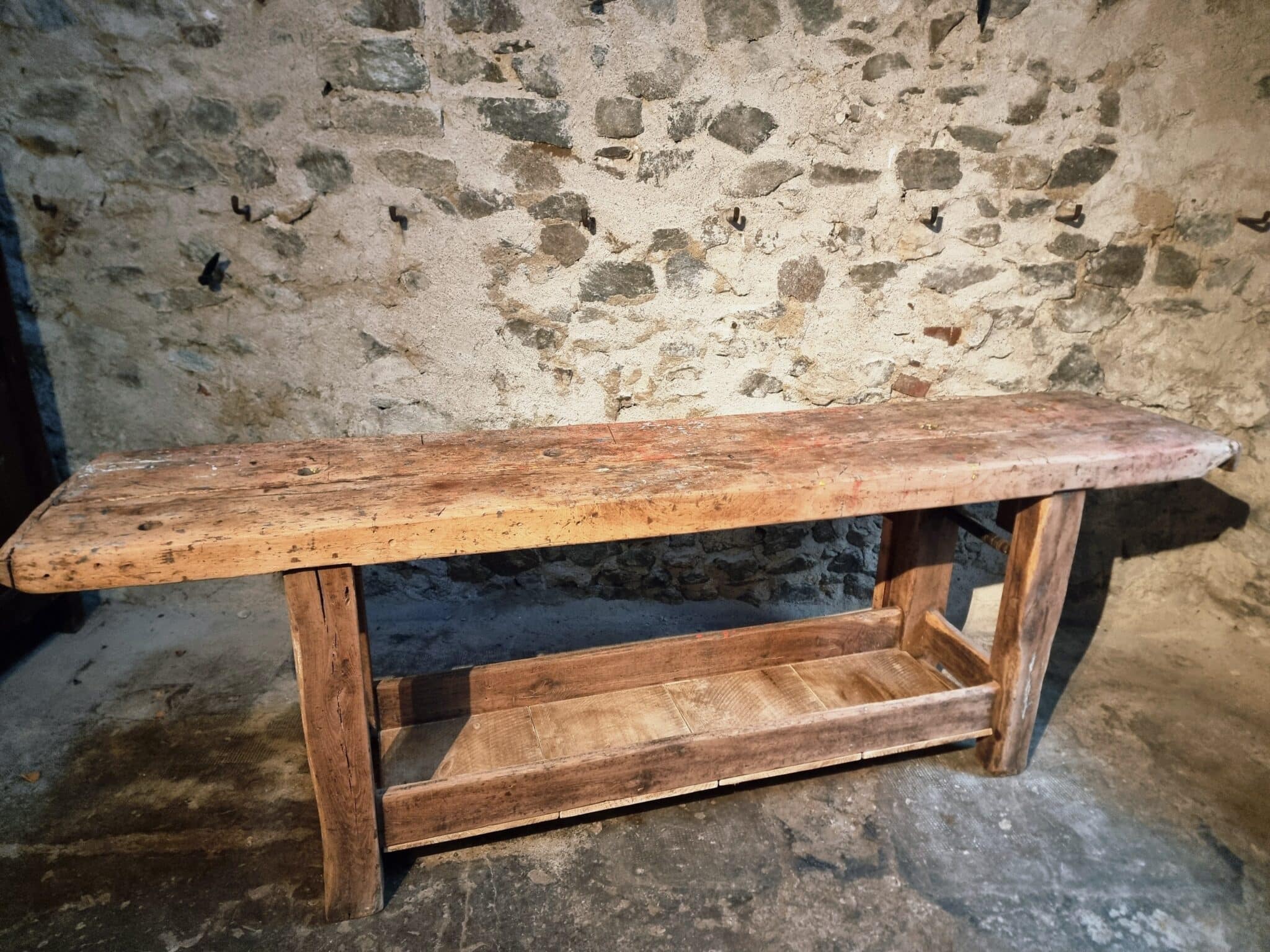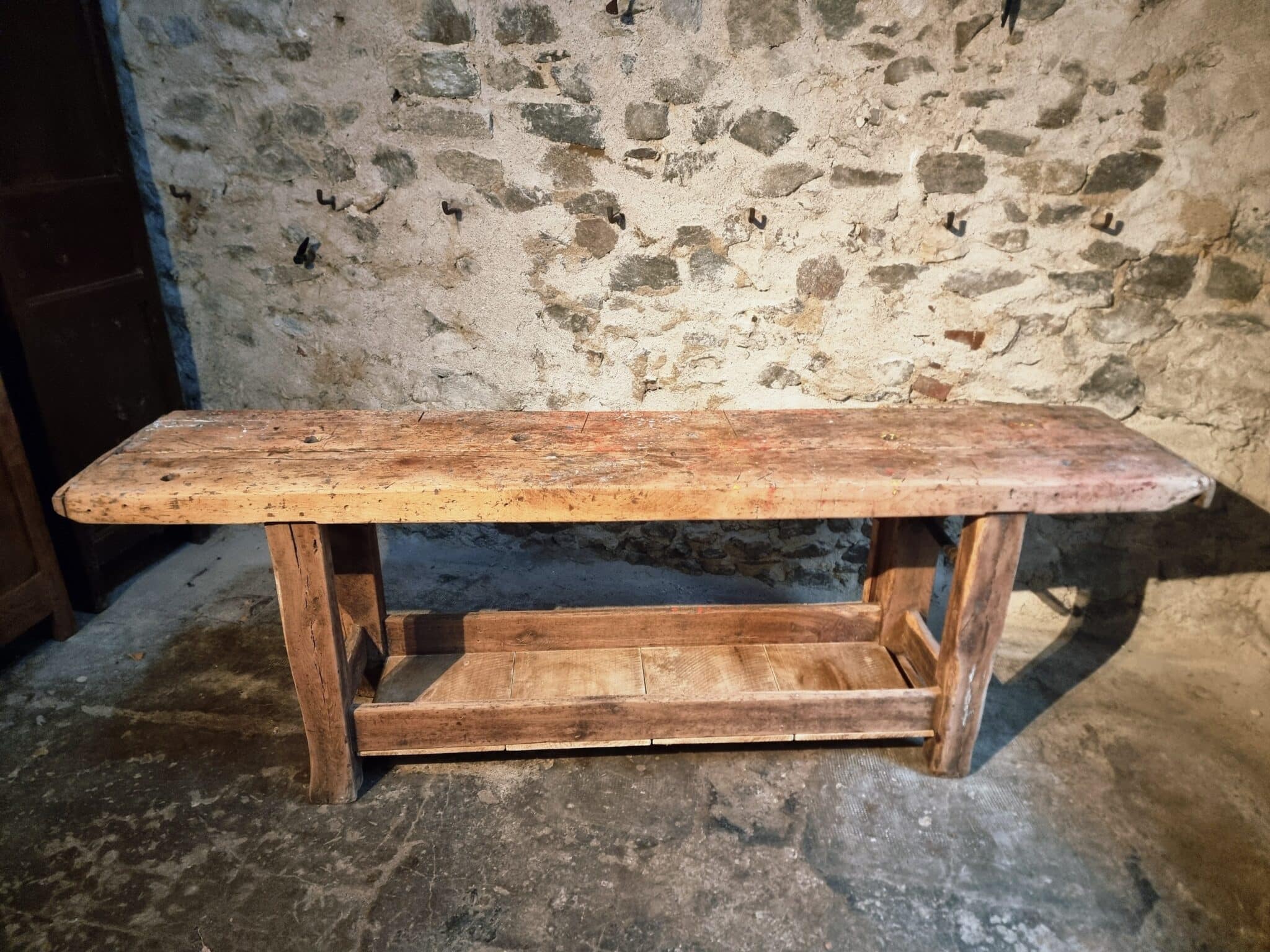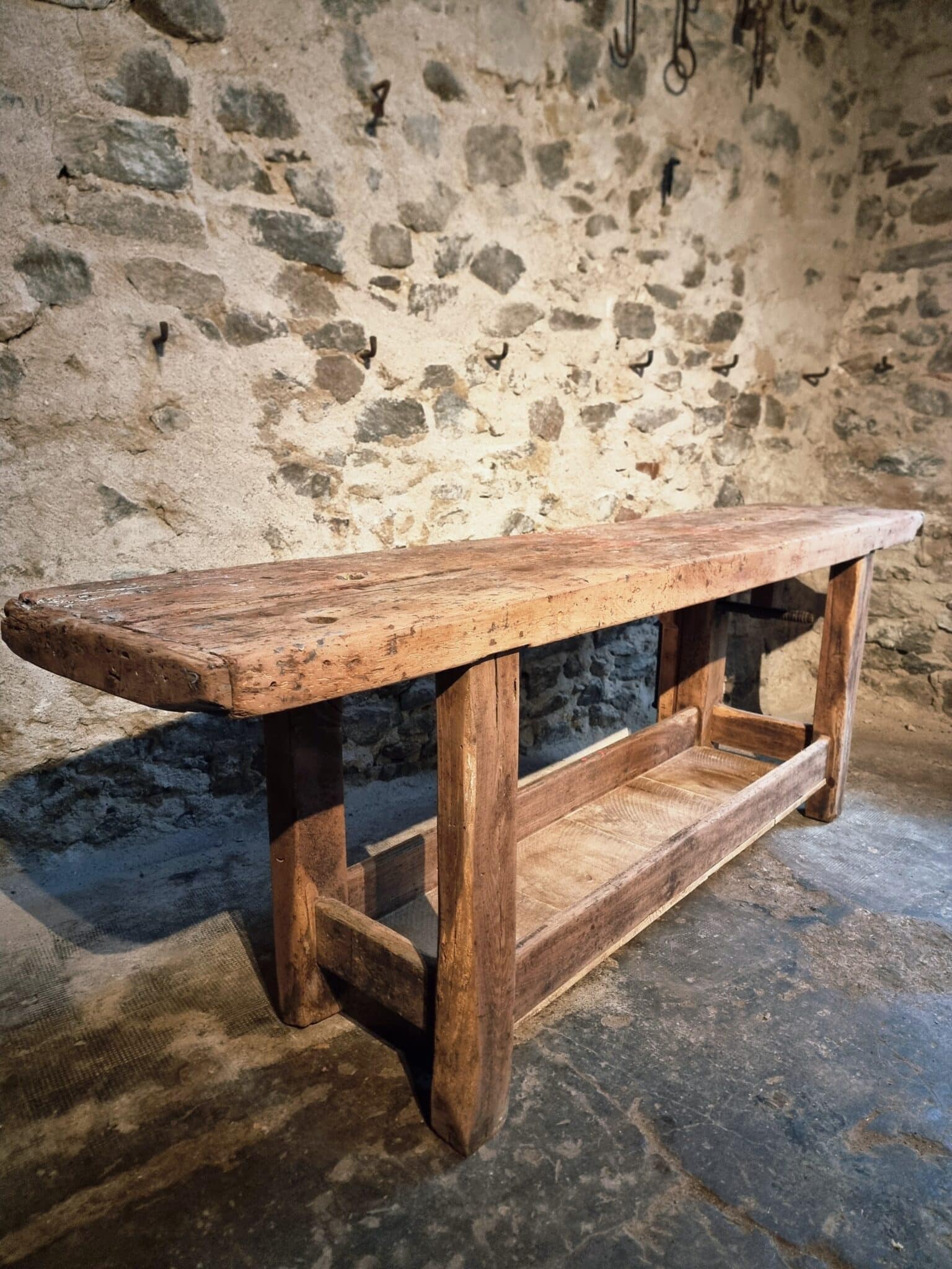 Impressive antique French carpenter’s workbench dating from around 1900, beautifully aged with the authentic patina of over a century of use.