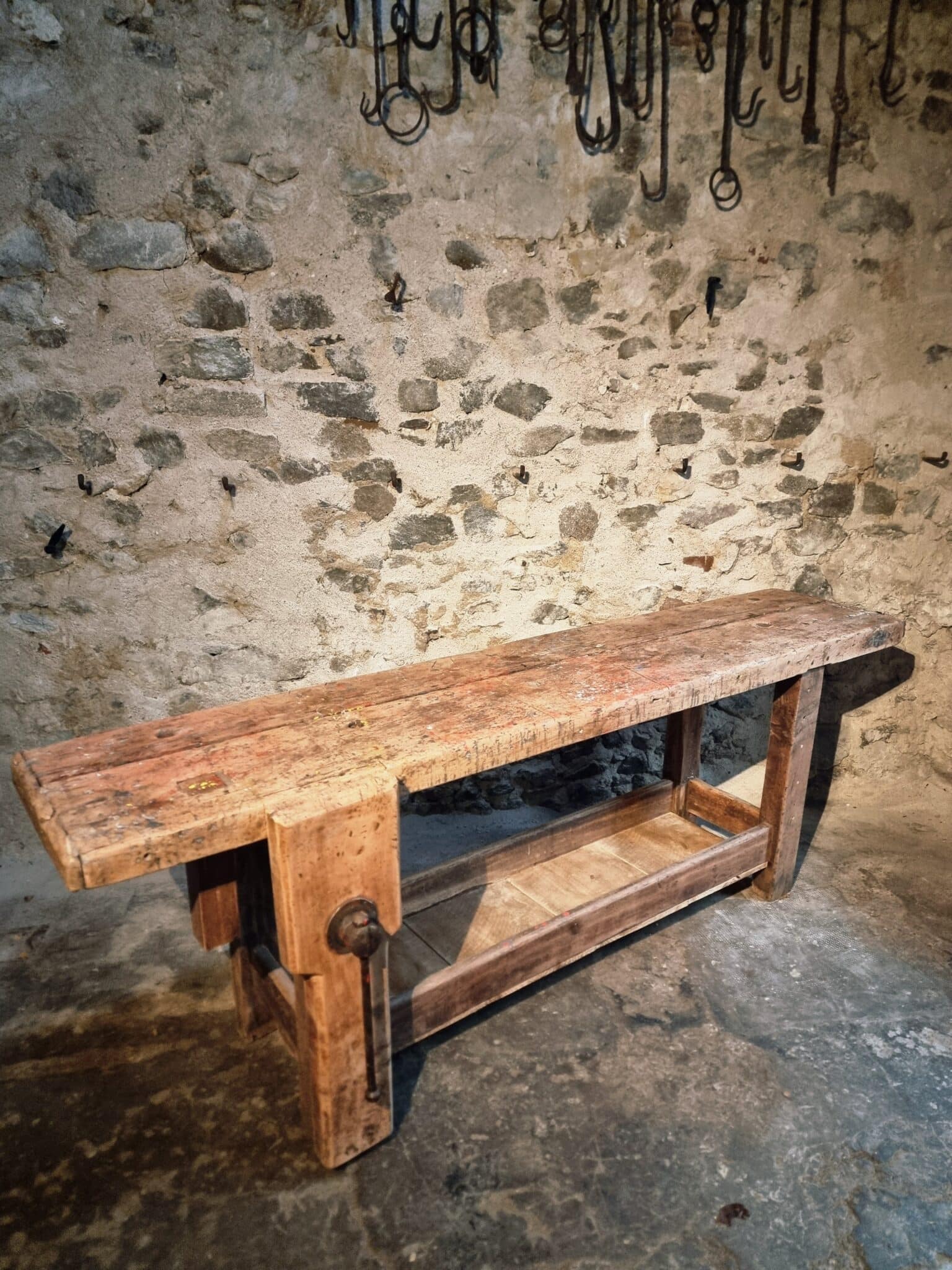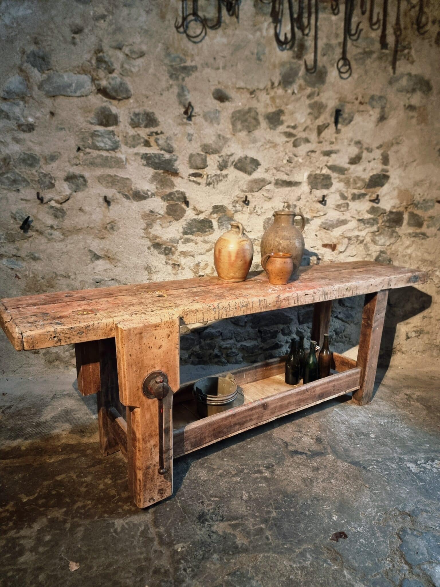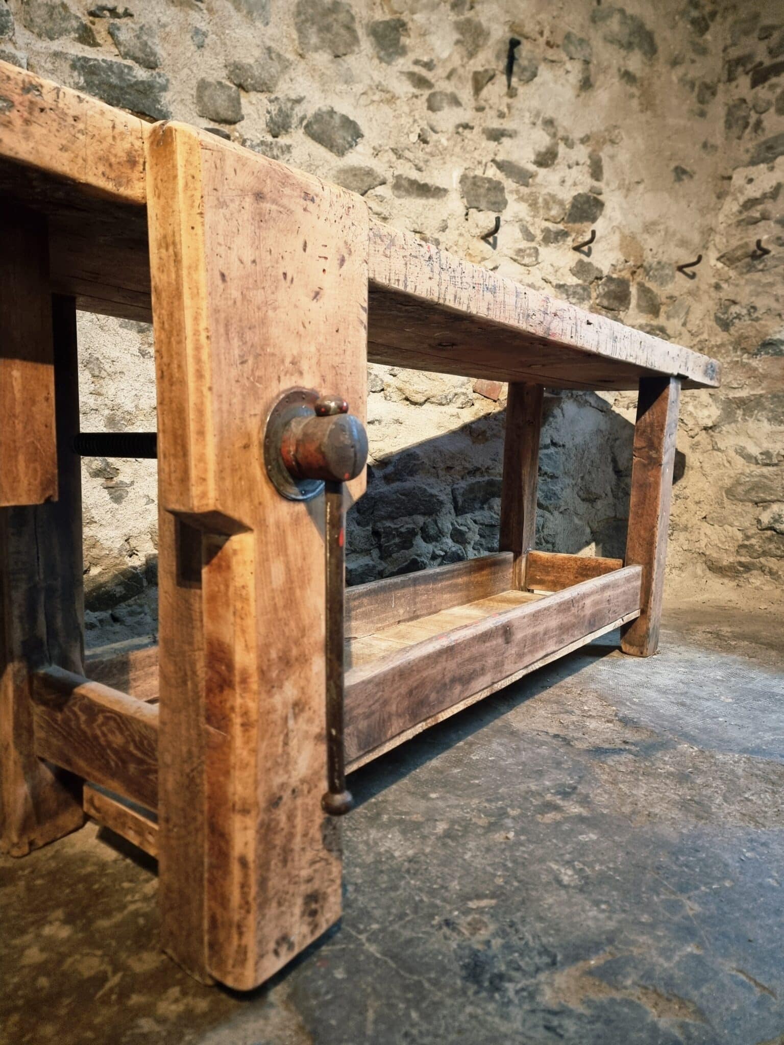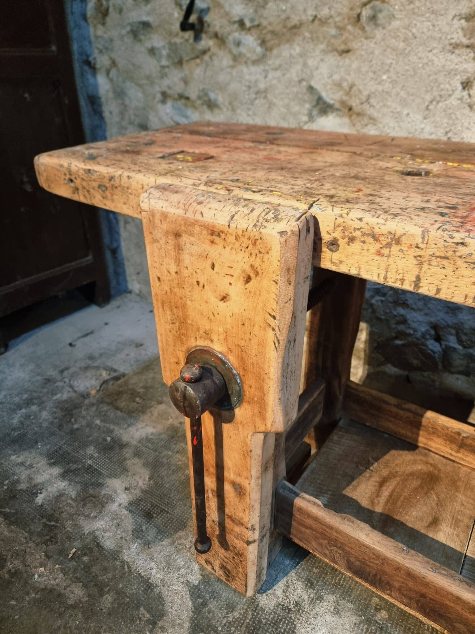 This solid piece combines the durability of oak for the base, beech for the thick worktop and vice, and poplar for the lower shelf, showcasing traditional French craftsmanship and practical design. The bench features its original wooden vice with a spindle depth of 11 cm, providing both visual character and functional appeal.