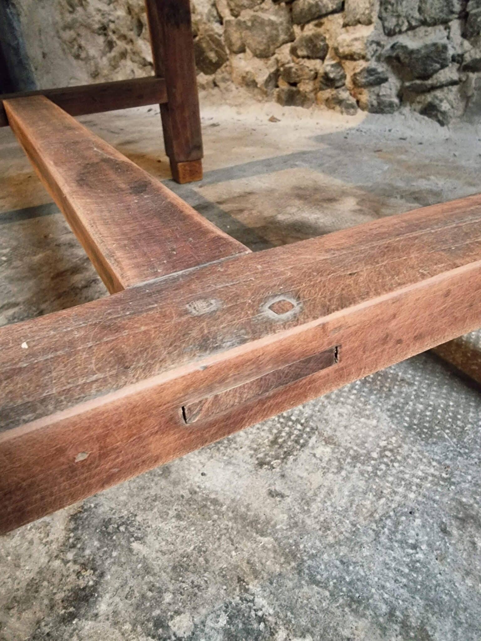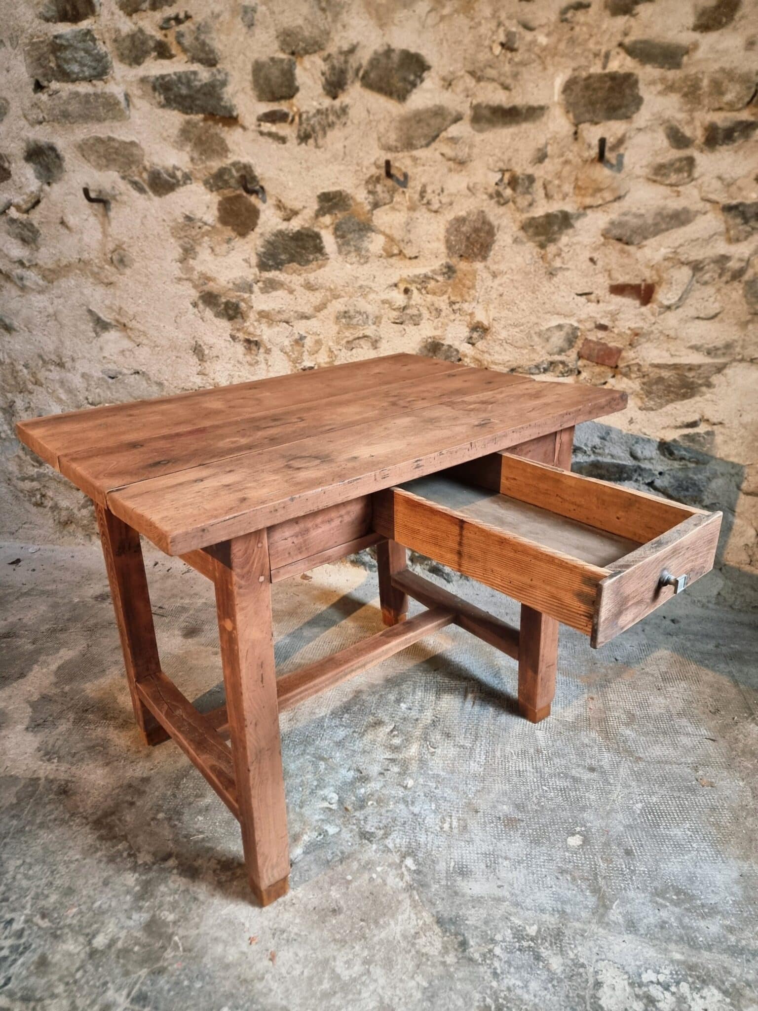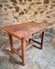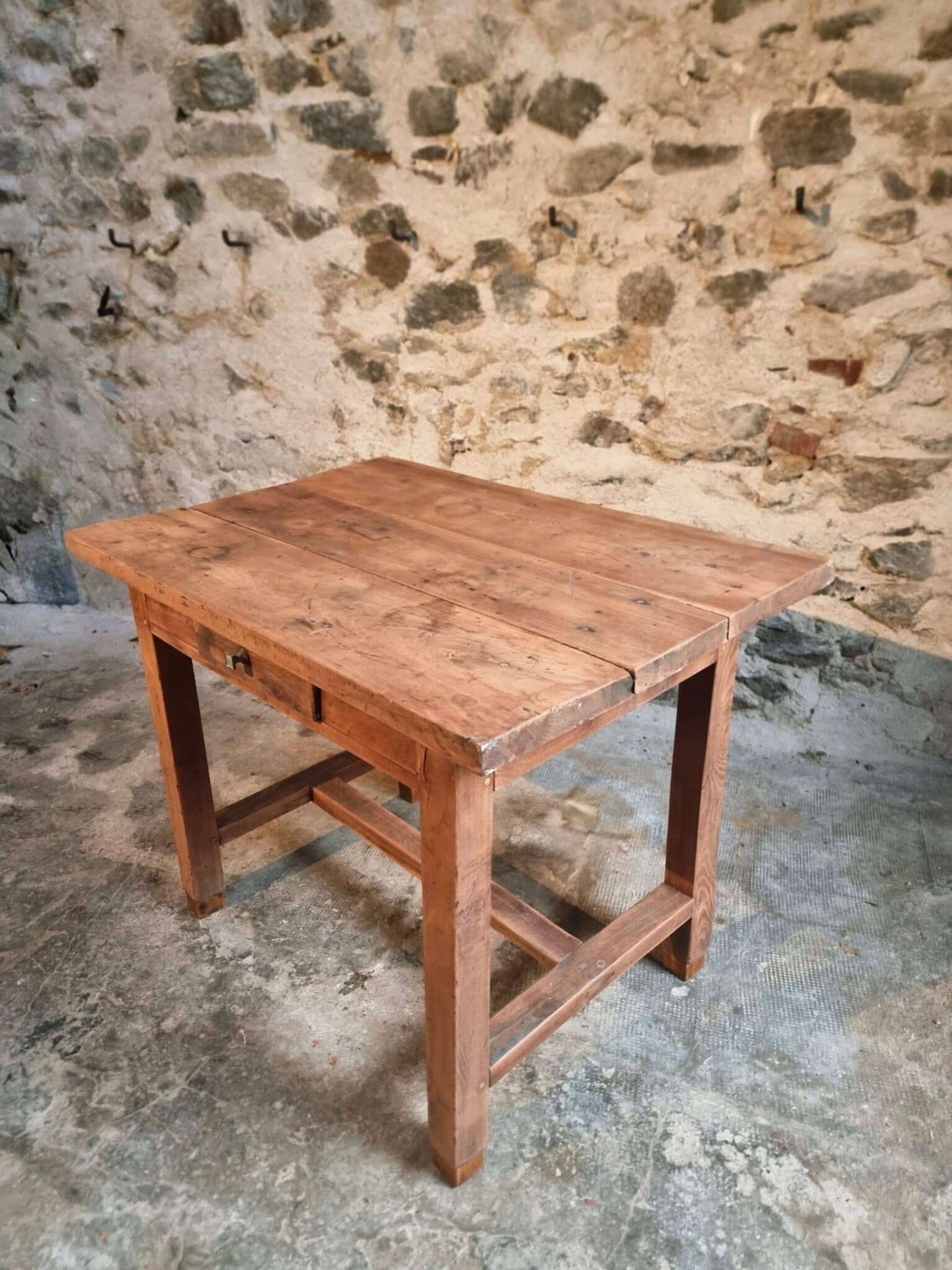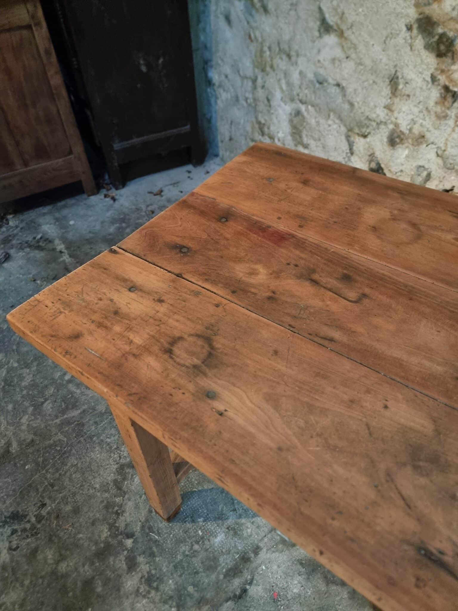 The table shows clear signs of age and use, consistent with its history and original purpose. These traces contribute to a warm patina and timeless appearance.