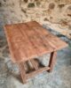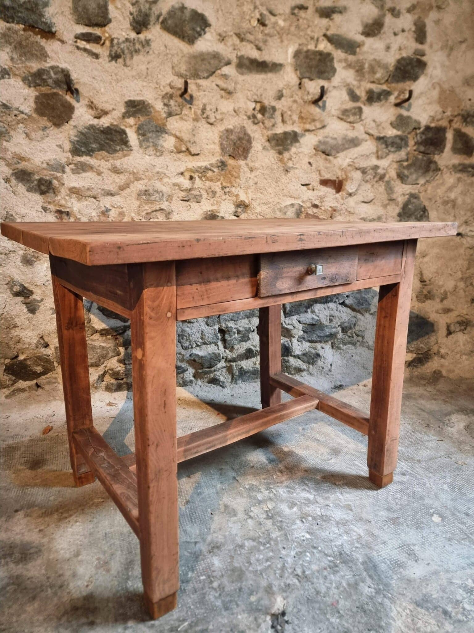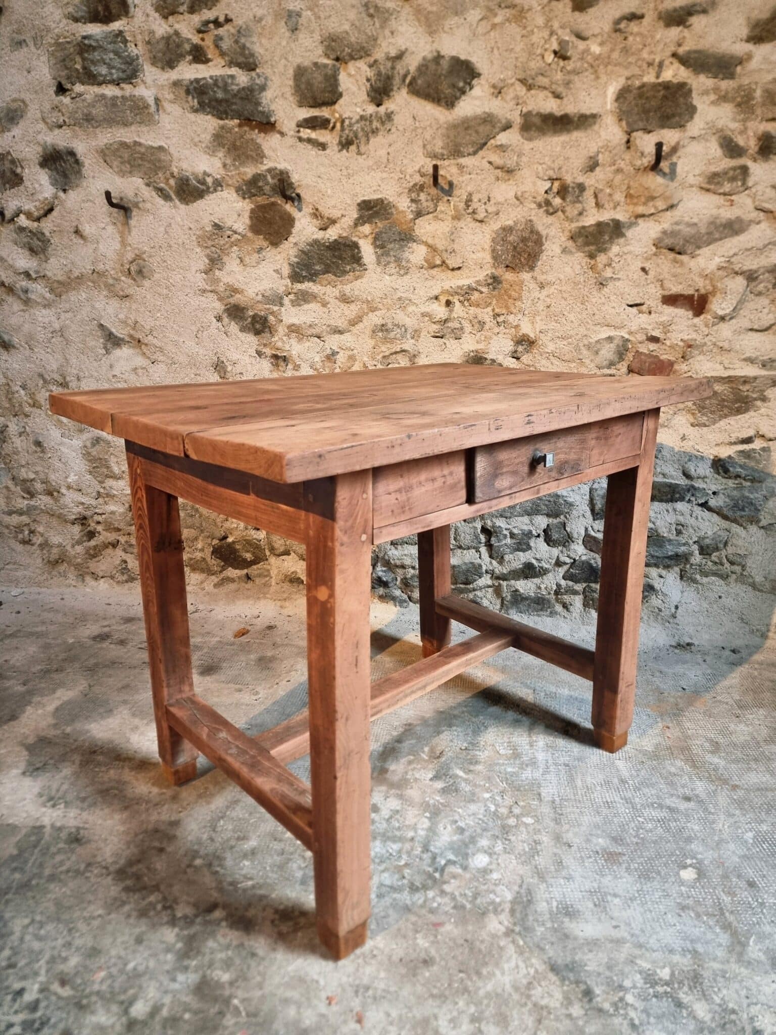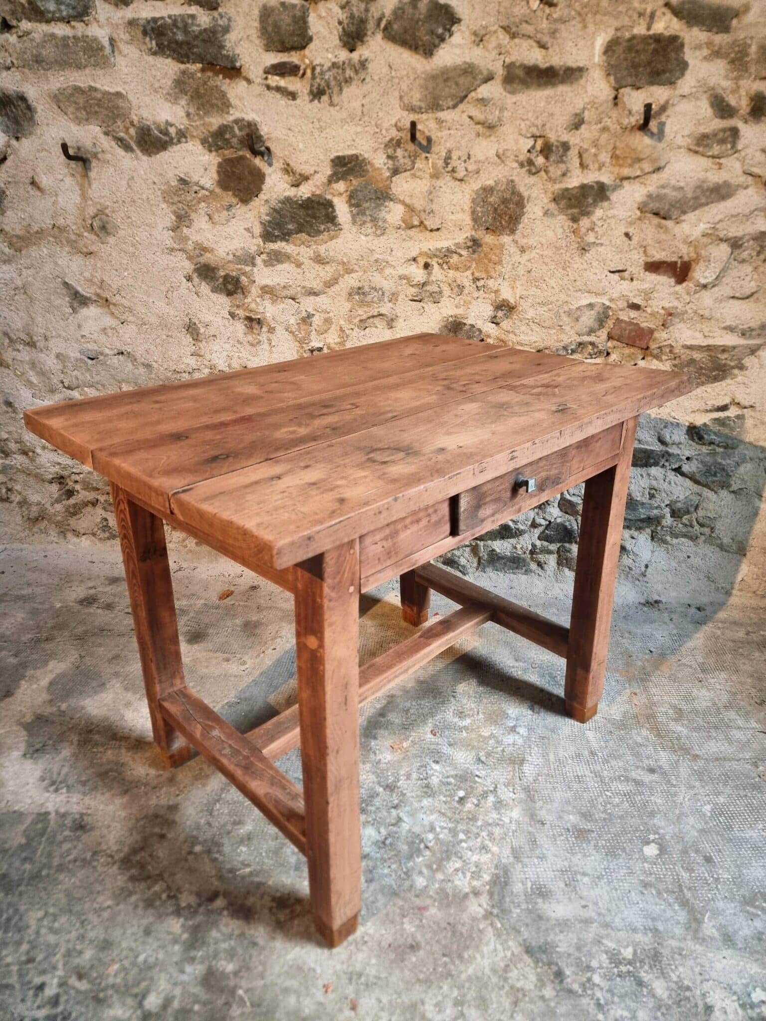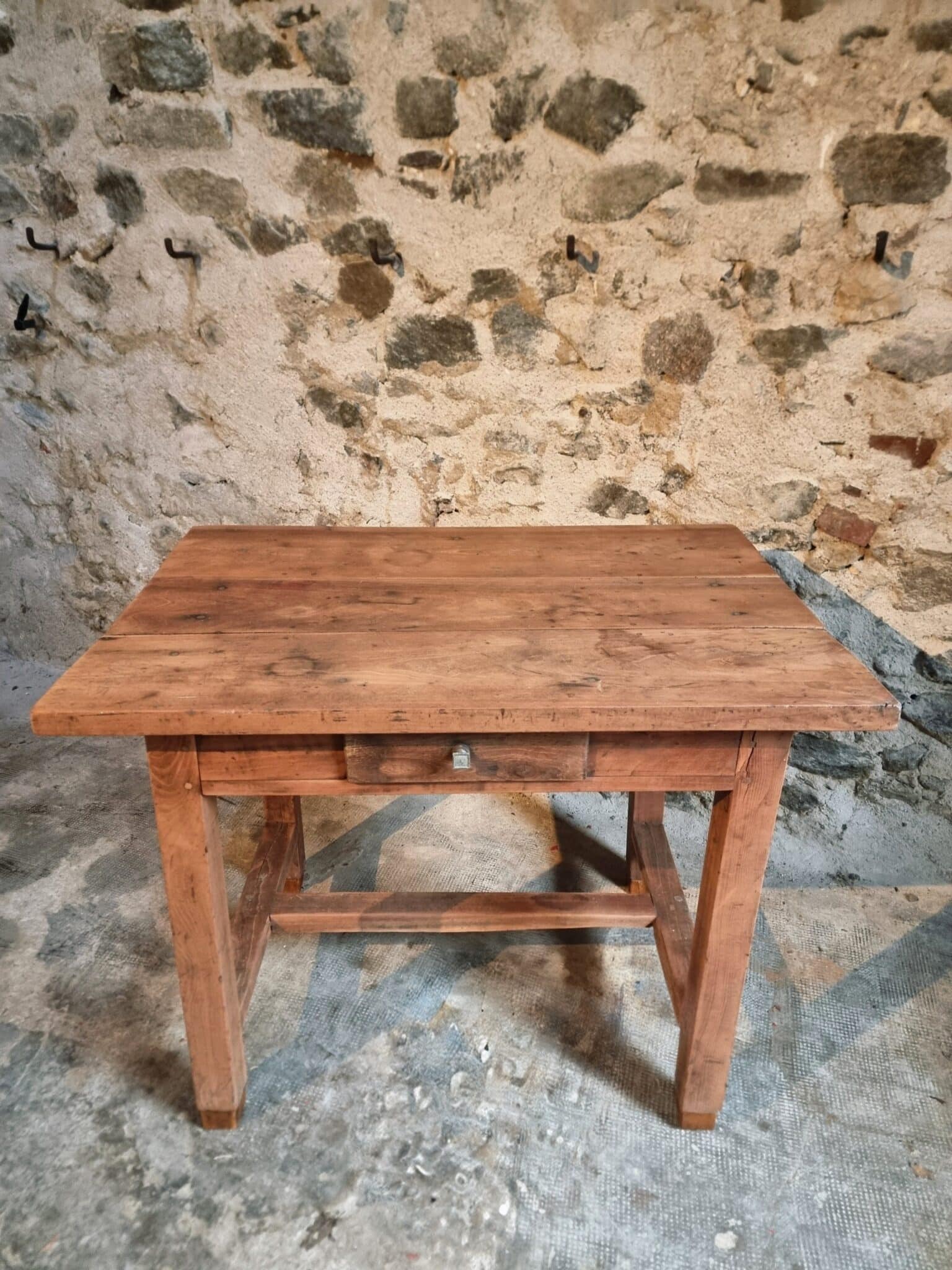The table shows clear signs of age and use, consistent with its history and original purpose. These traces contribute to a warm patina and timeless appearance.