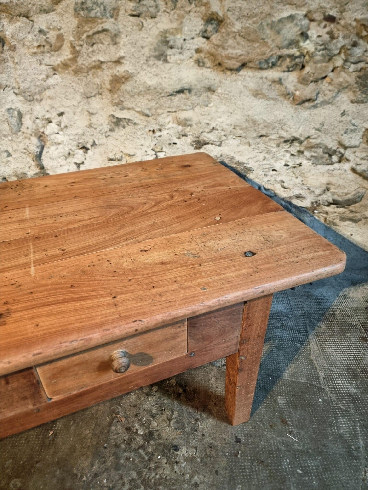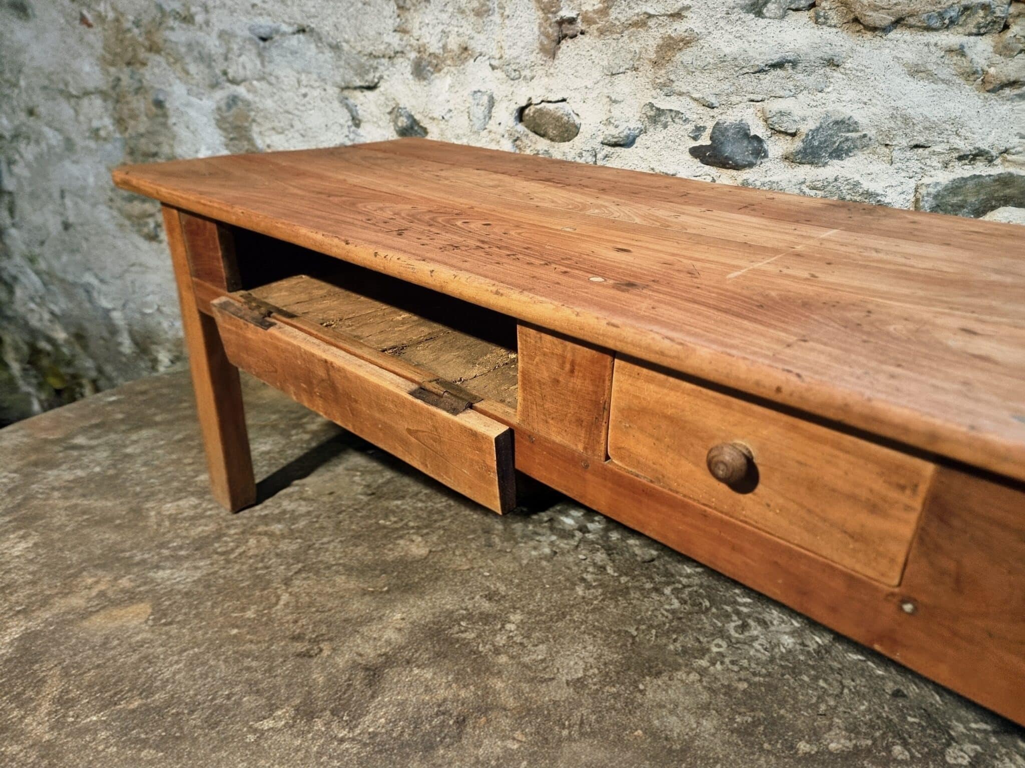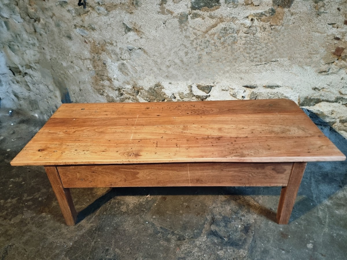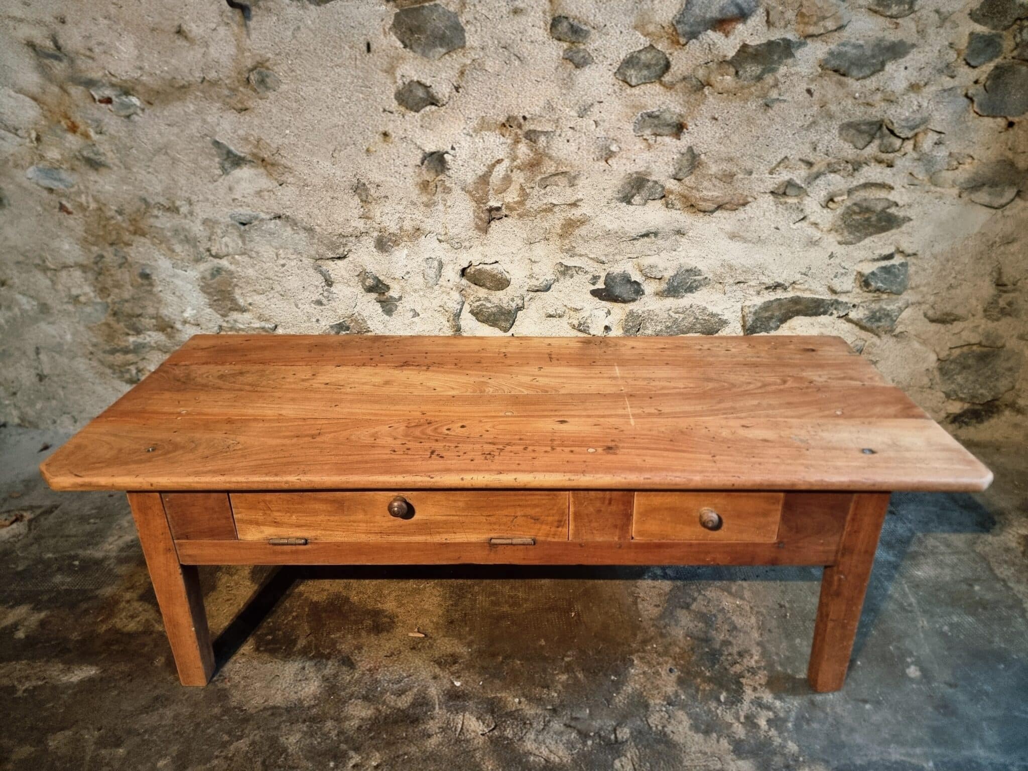 This antique coffee table originates from the Allier region of France and dates from around 1750–1800. Crafted from solid cherrywood, it was originally a farmhouse table and retains all the authentic charm and character of rural 18th-century craftsmanship.