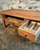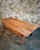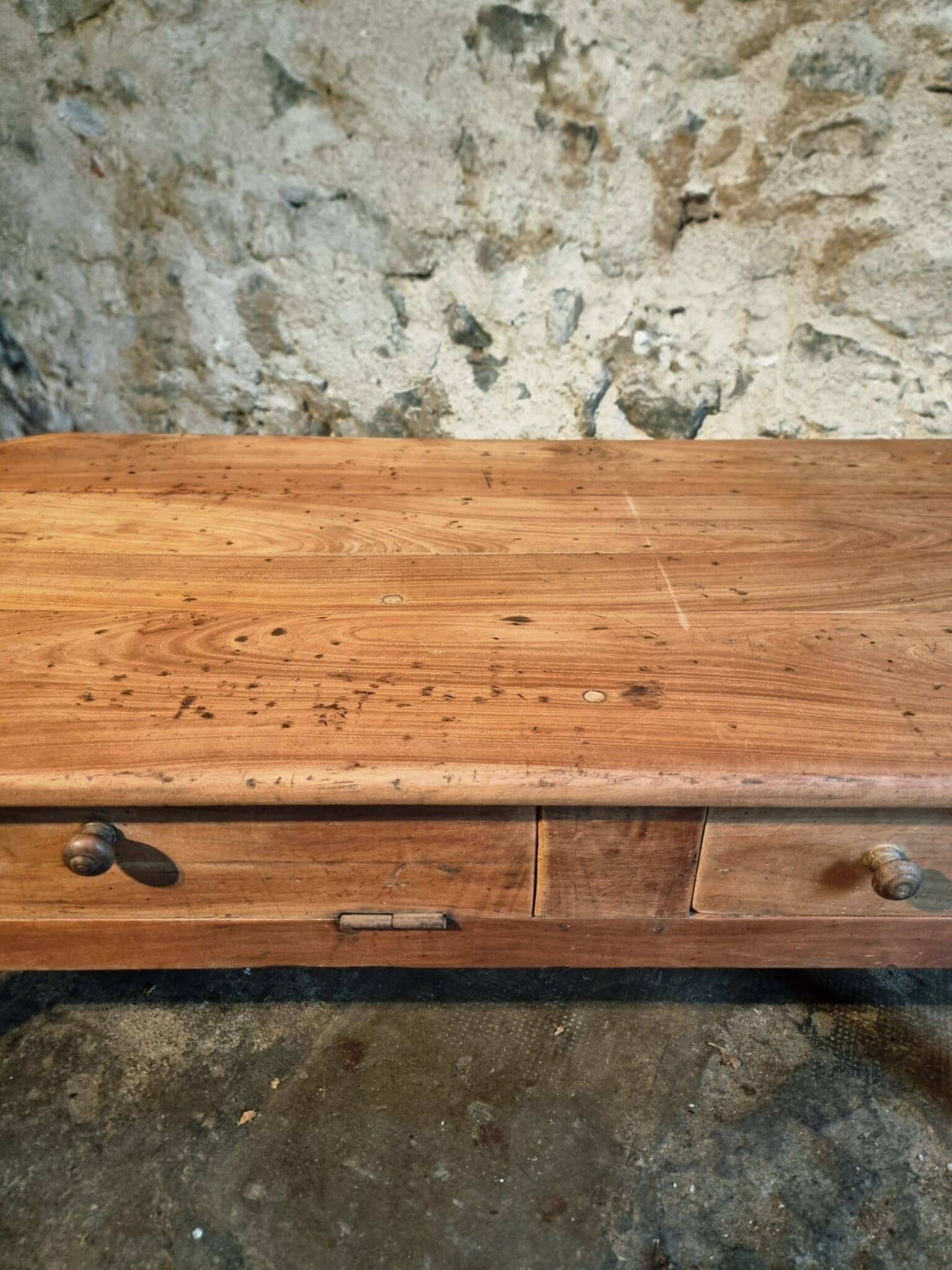 The table features a warm, beautifully aged patina that accentuates the natural cherrywood grain. It includes one drawer and one flip-down compartment, offering both visual appeal and practical storage. The solid, honest construction and simple lines reflect the rustic elegance typical of provincial French furniture.