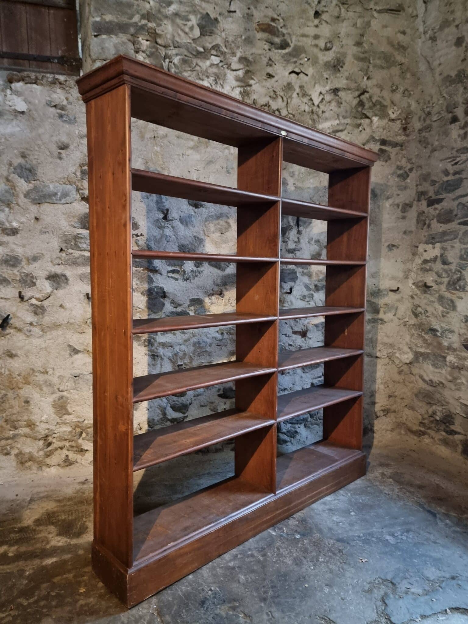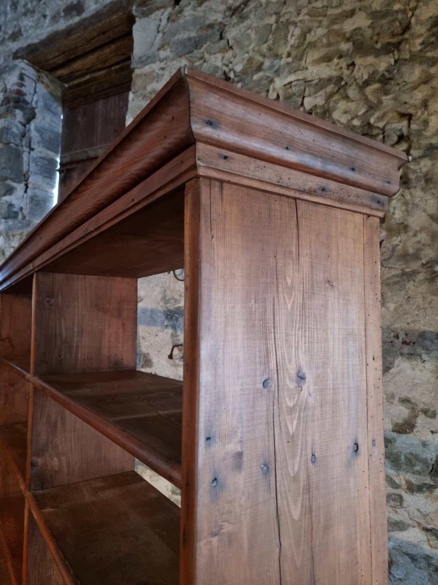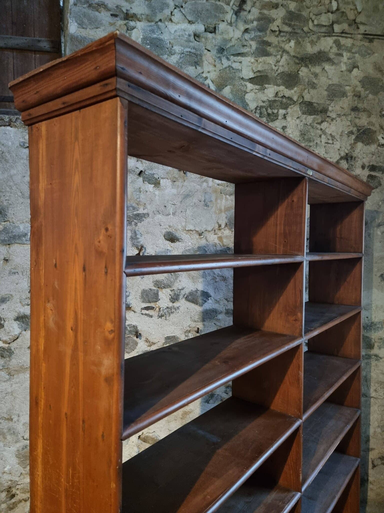 Large antique French open shelving unit, originally used as shop furniture, originating from a clothing store in Vichy, France. The piece dates from the 1930s and is constructed entirely from solid pine wood.