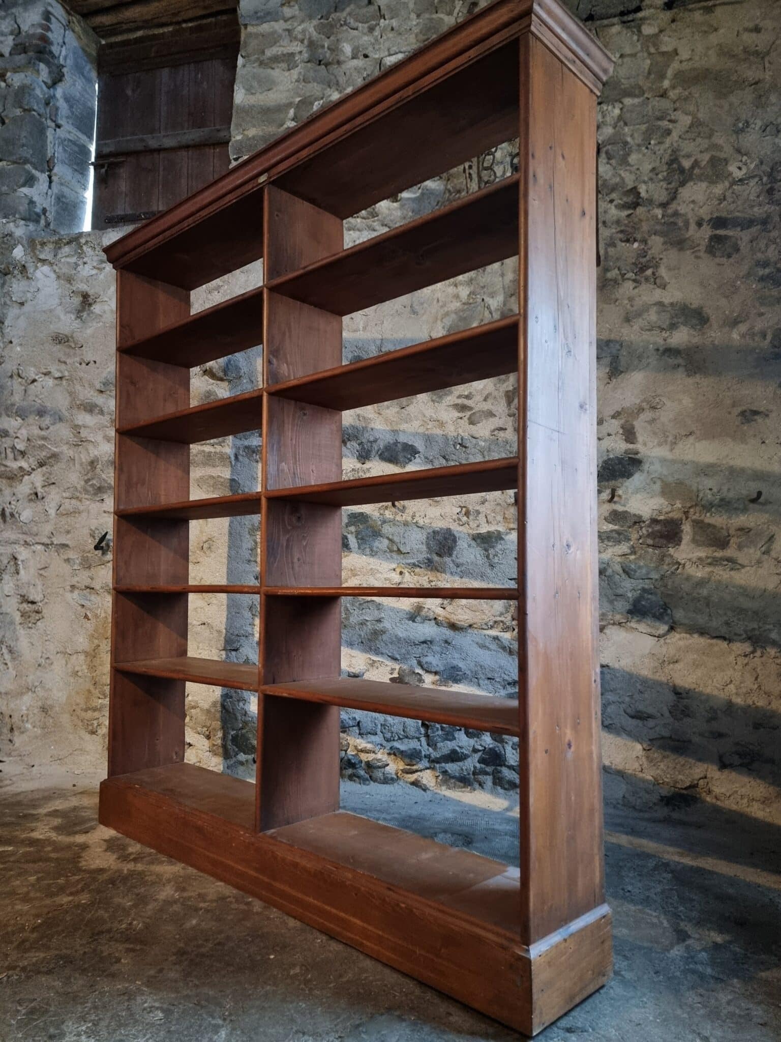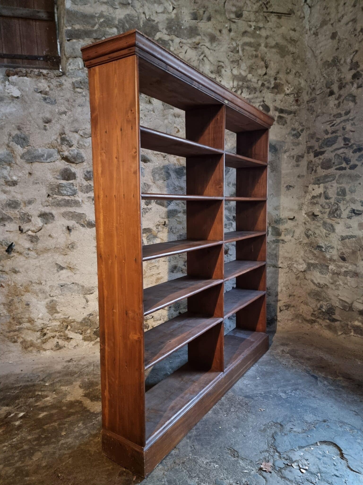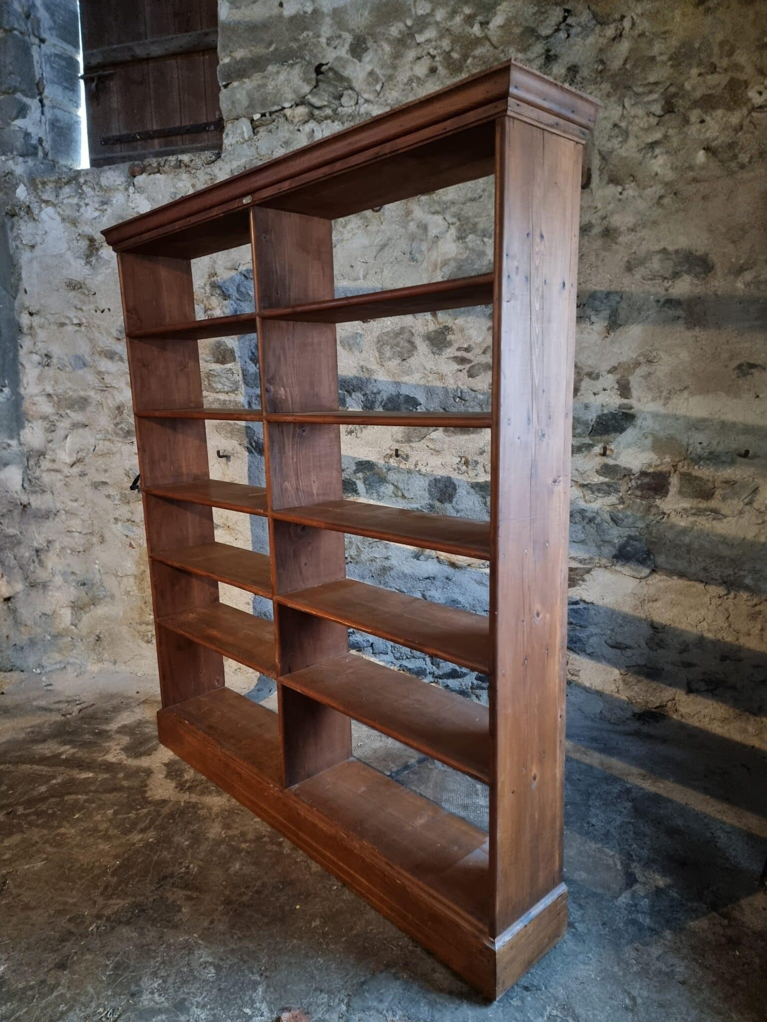 Large antique French open shelving unit, originally used as shop furniture, originating from a clothing store in Vichy, France. The piece dates from the 1930s and is constructed entirely from solid pine wood.