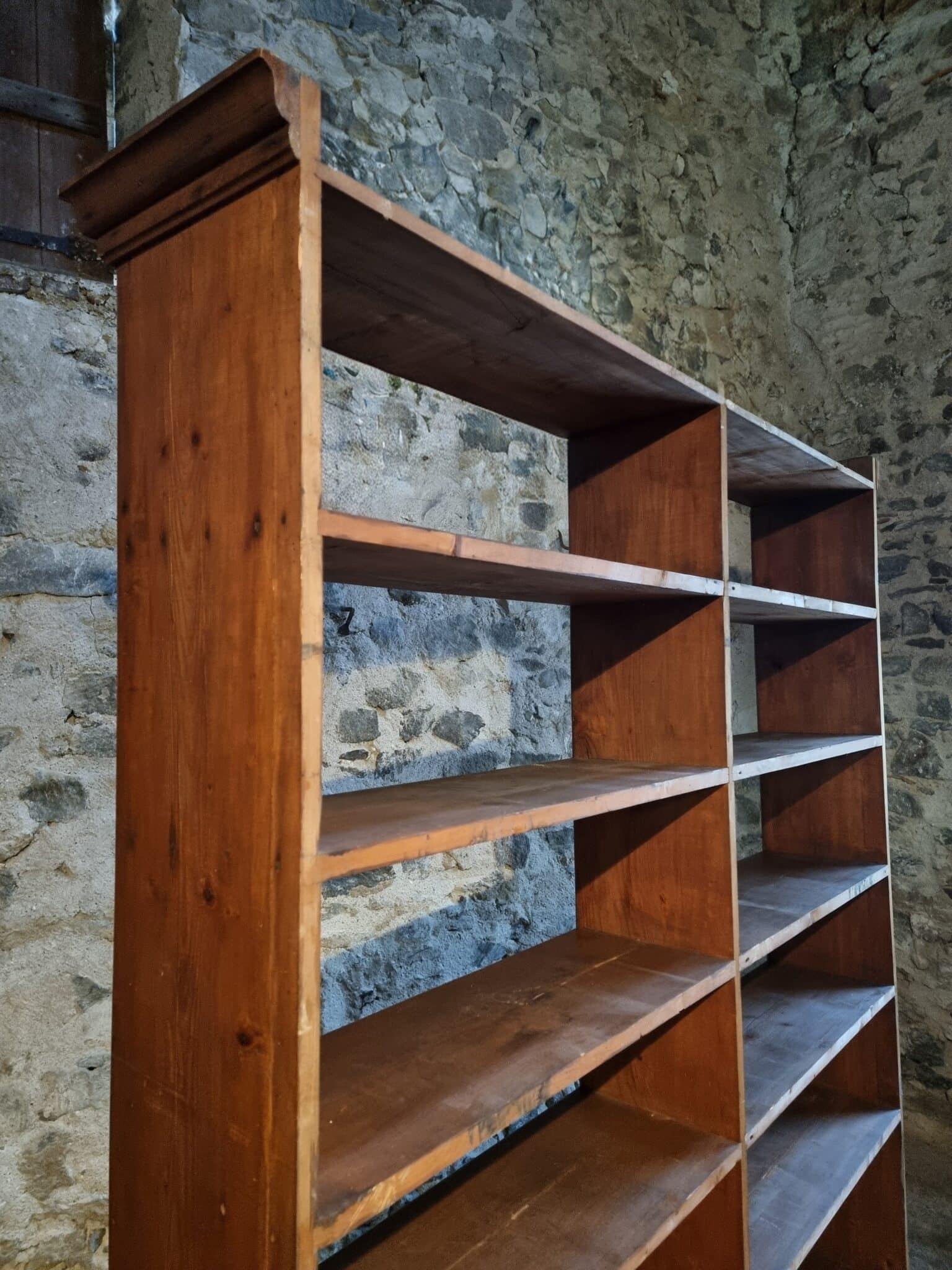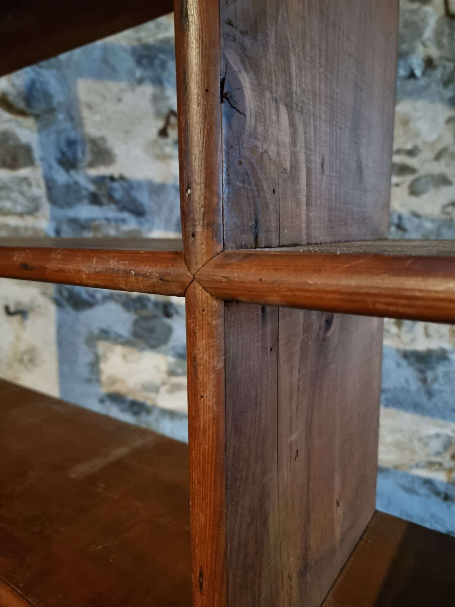 Good vintage condition. Structurally sound, with age-related wear and patina throughout. The shelving remains stable, with fixed shelves as originally constructed.
