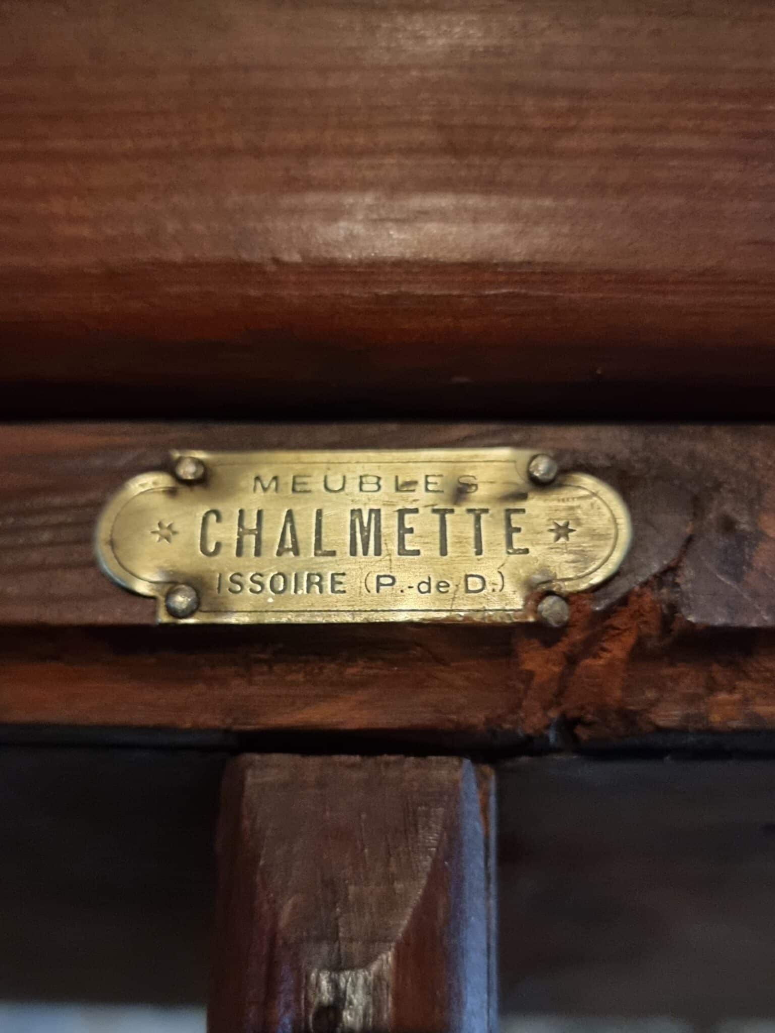 The shelving unit was manufactured by Chalmette, a French furniture maker based in Issoire (Puy-de-Dôme). During the early 20th century, Chalmette produced functional furniture and shop fittings for commercial and professional use. Their work is characterized by solid construction, practical proportions, and restrained detailing, prioritizing durability and usability over decoration.