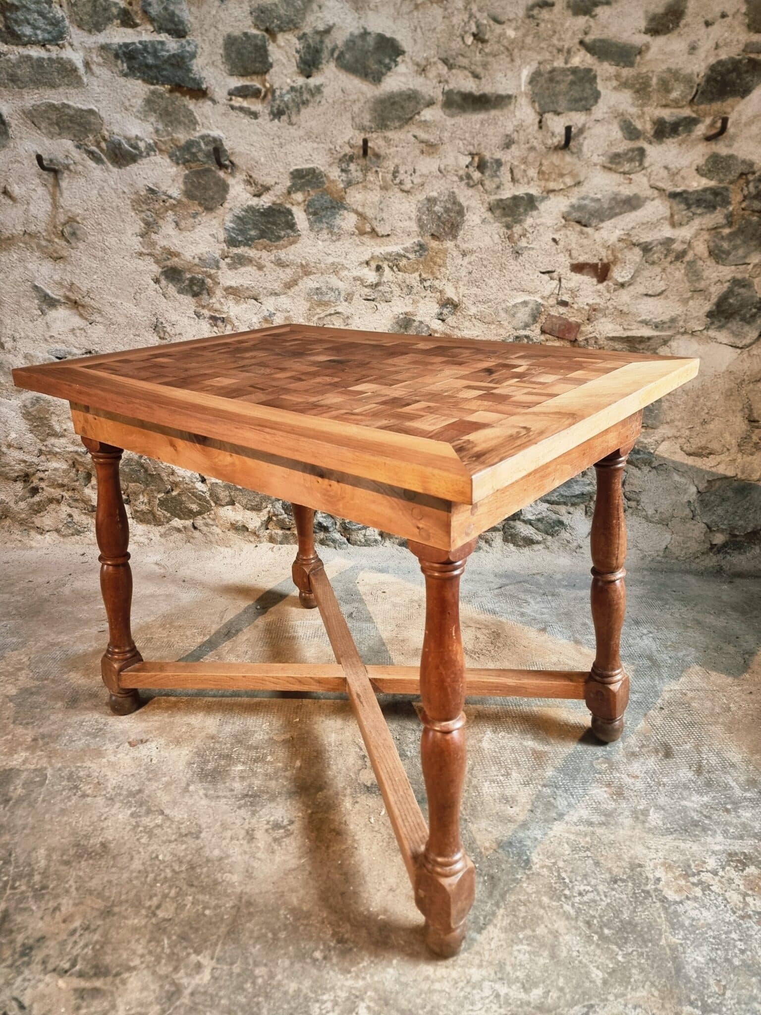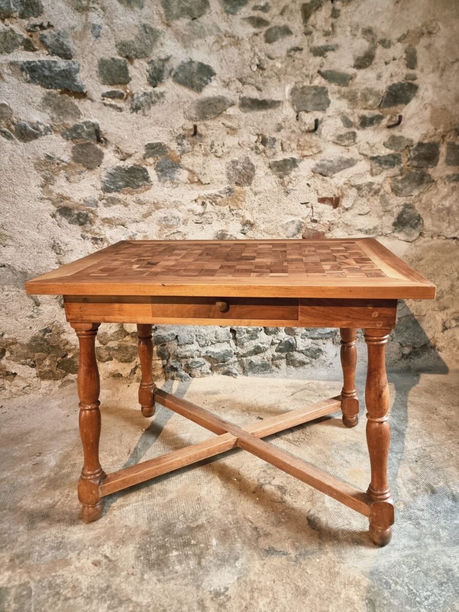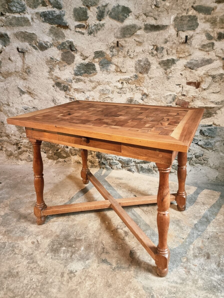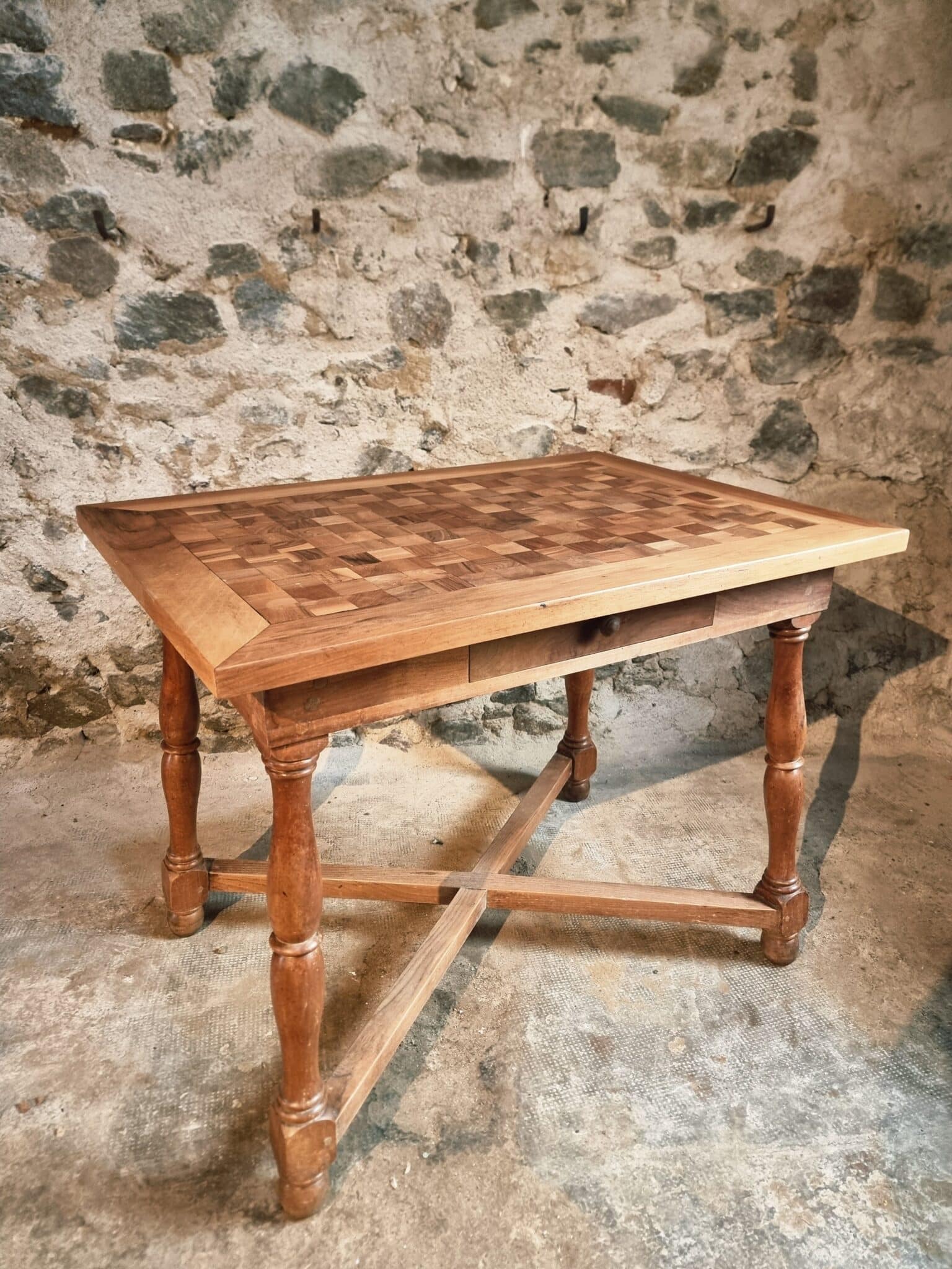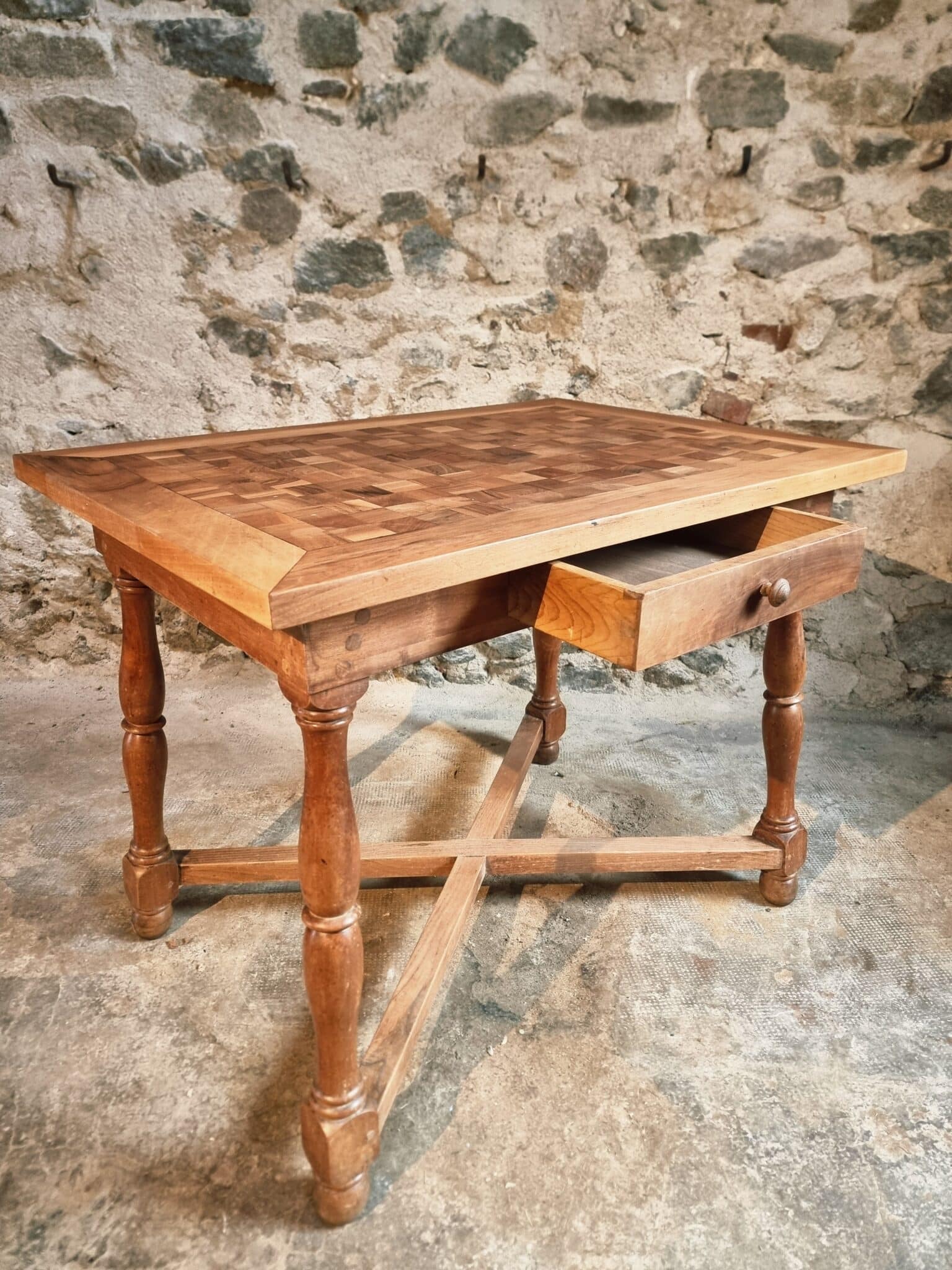 The design features a beautiful parquet-style top, turned legs connected by a sturdy H-stretcher, and a practical drawer with its original knob. With its refined lines and elegant proportions, this table offers both decorative charm and everyday functionality.