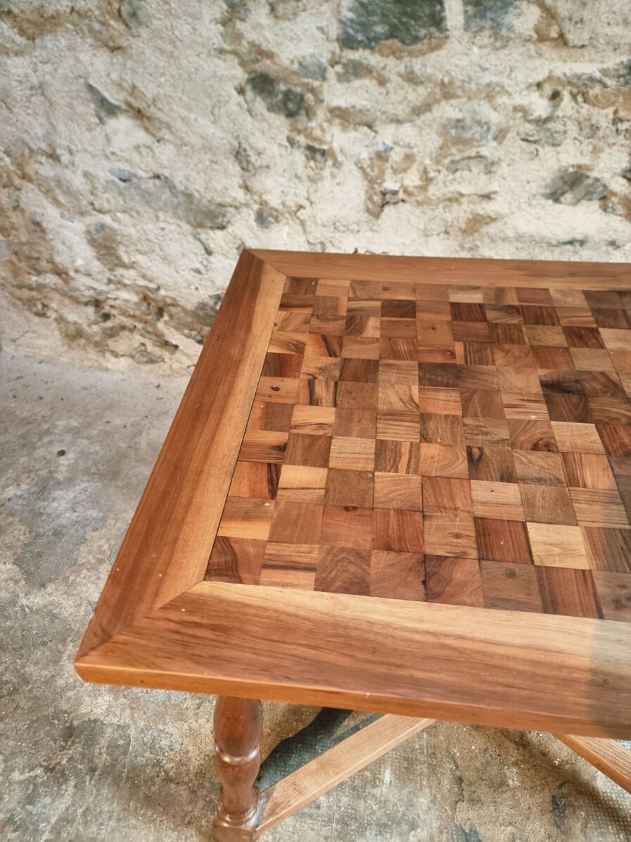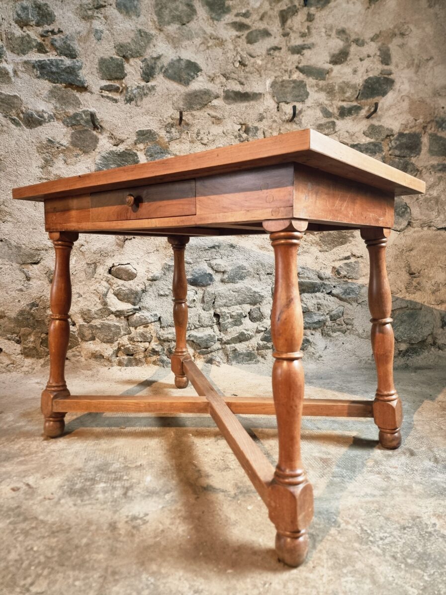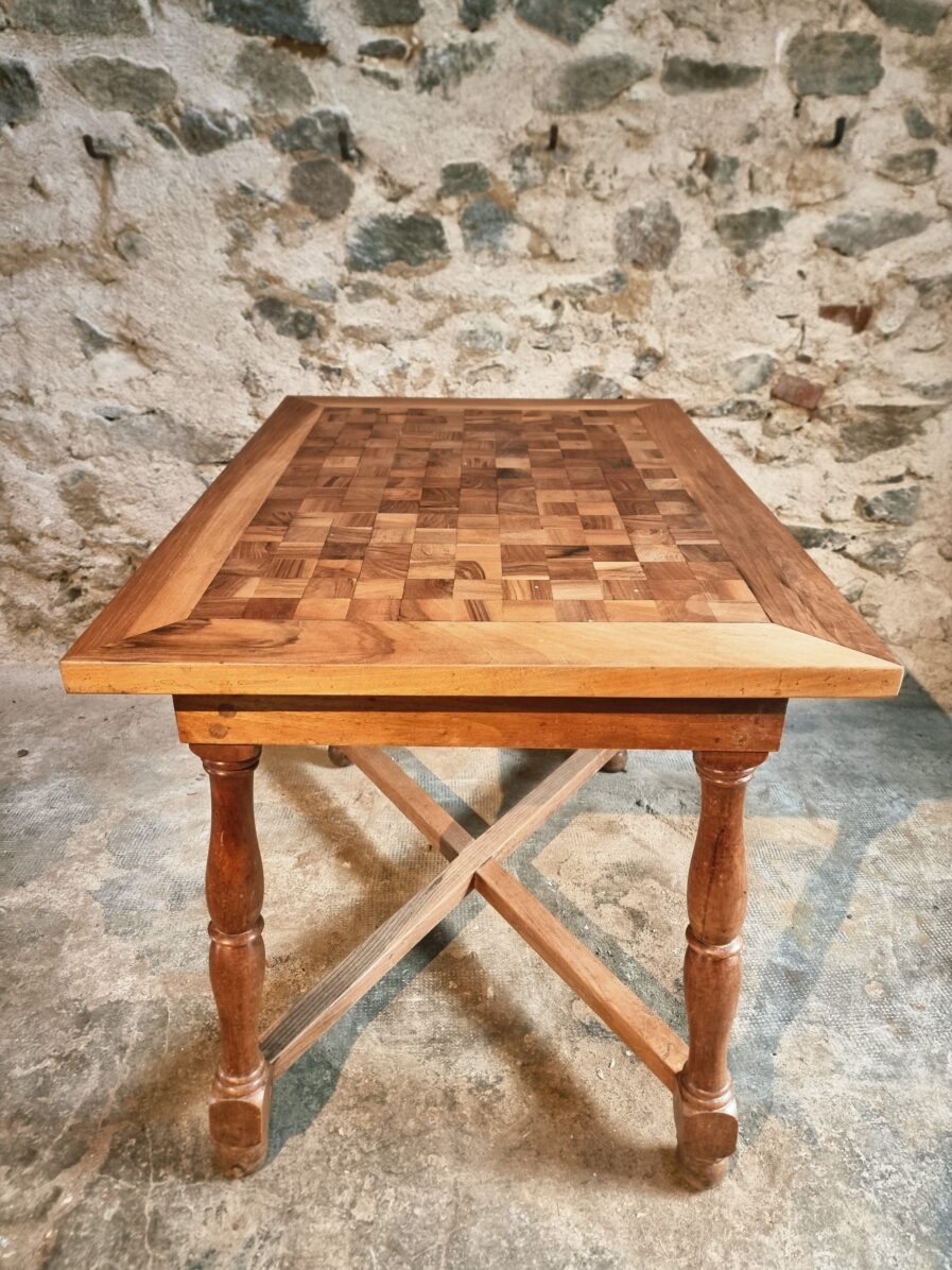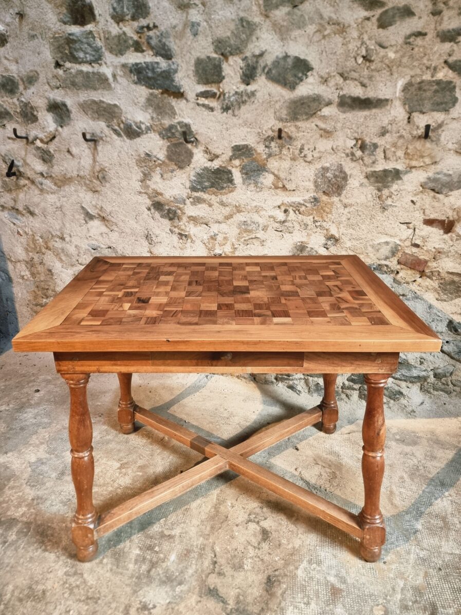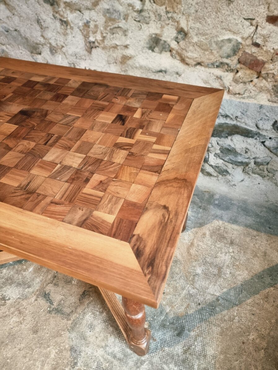 The design features a beautiful parquet-style top, turned legs connected by a sturdy H-stretcher, and a practical drawer with its original knob. With its refined lines and elegant proportions, this table offers both decorative charm and everyday functionality.