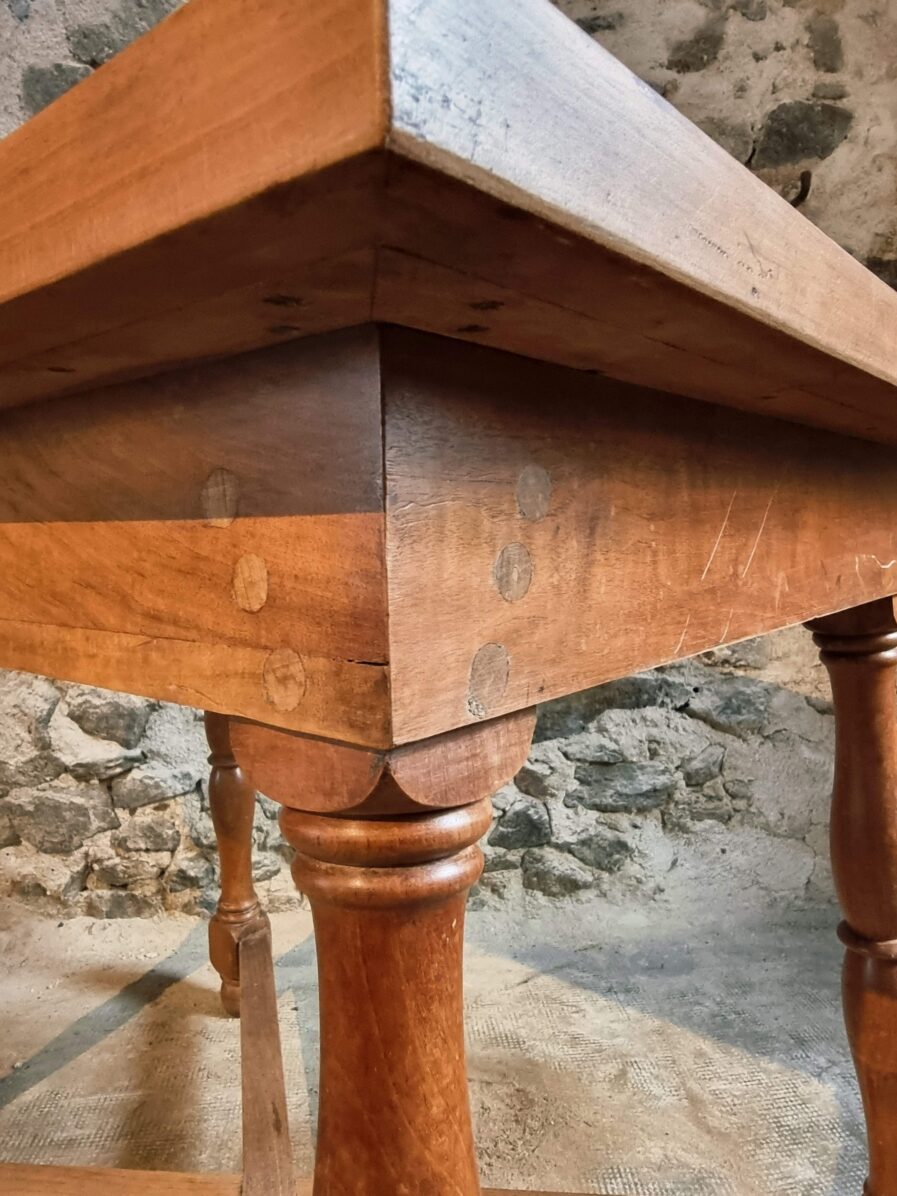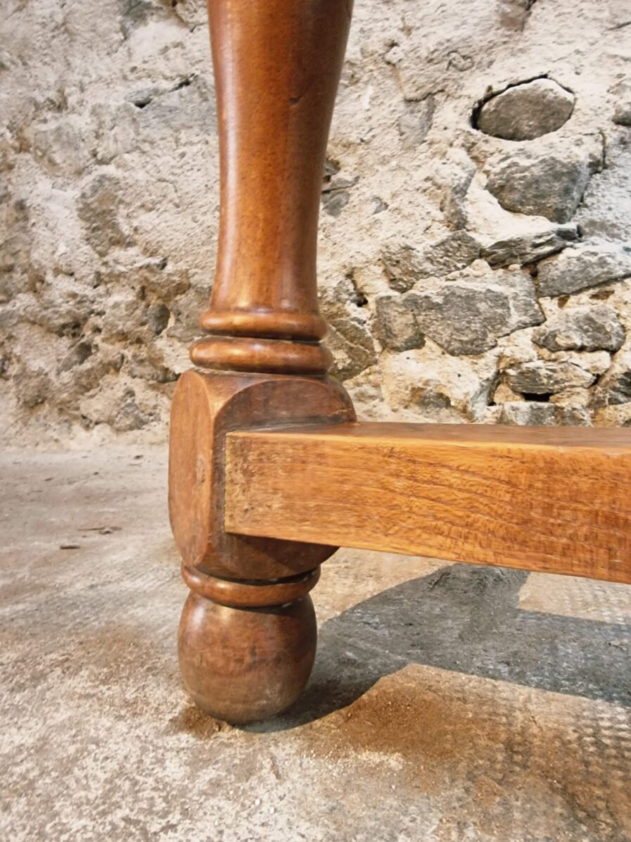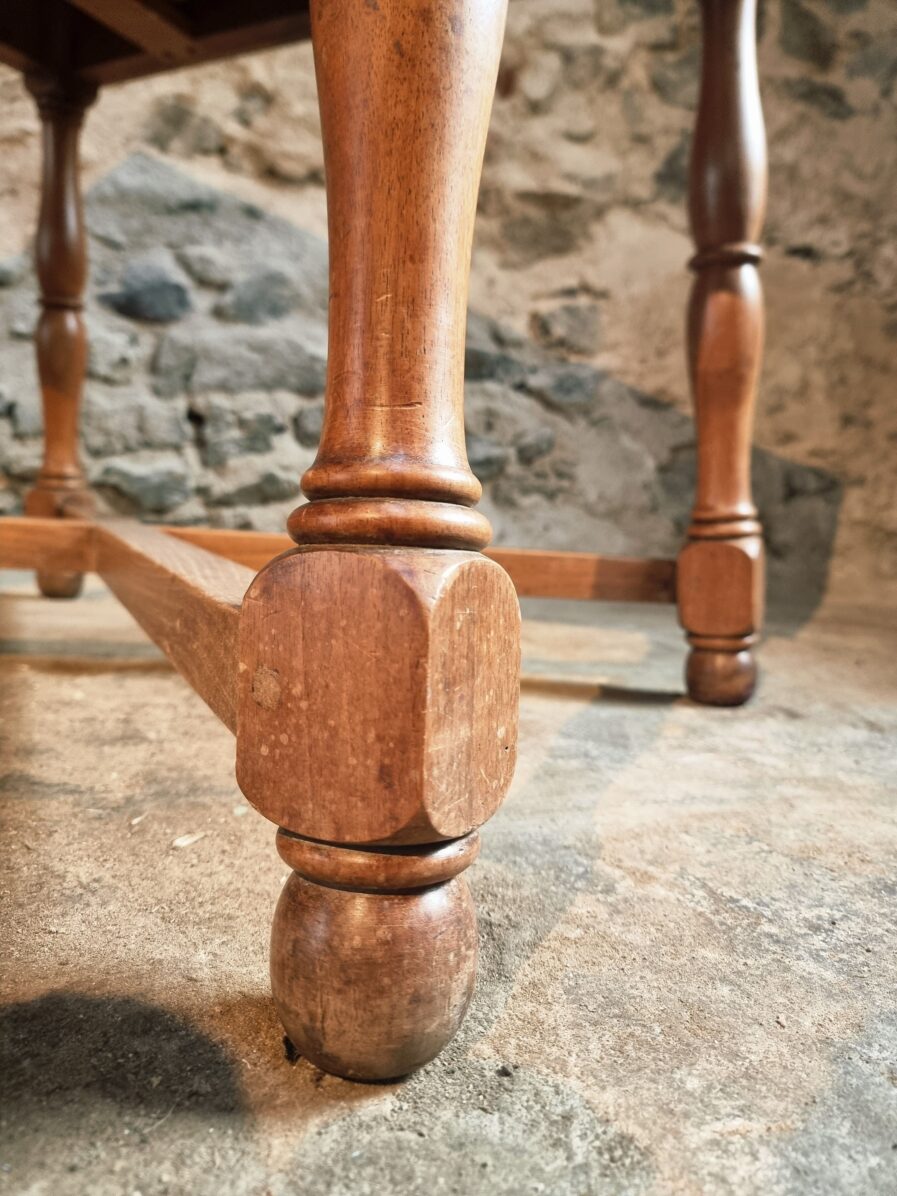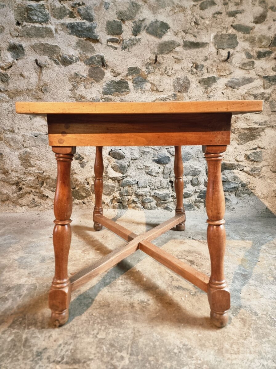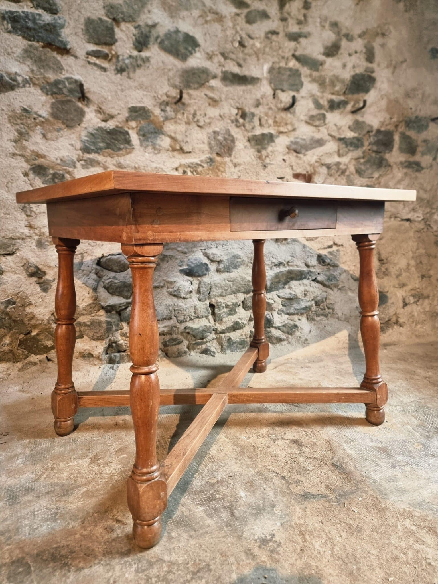 The design features a beautiful parquet-style top, turned legs connected by a sturdy H-stretcher, and a practical drawer with its original knob. With its refined lines and elegant proportions, this table offers both decorative charm and everyday functionality.
