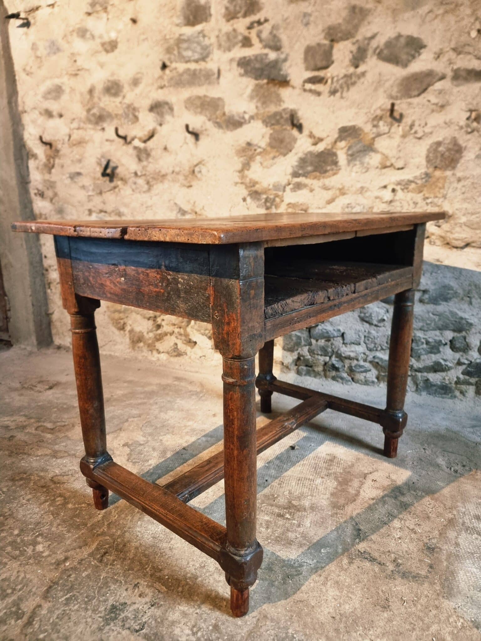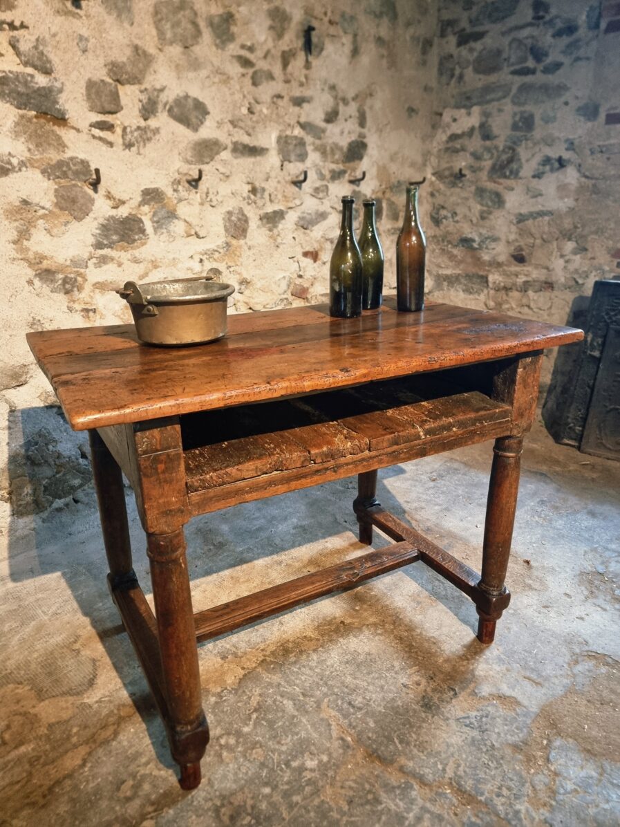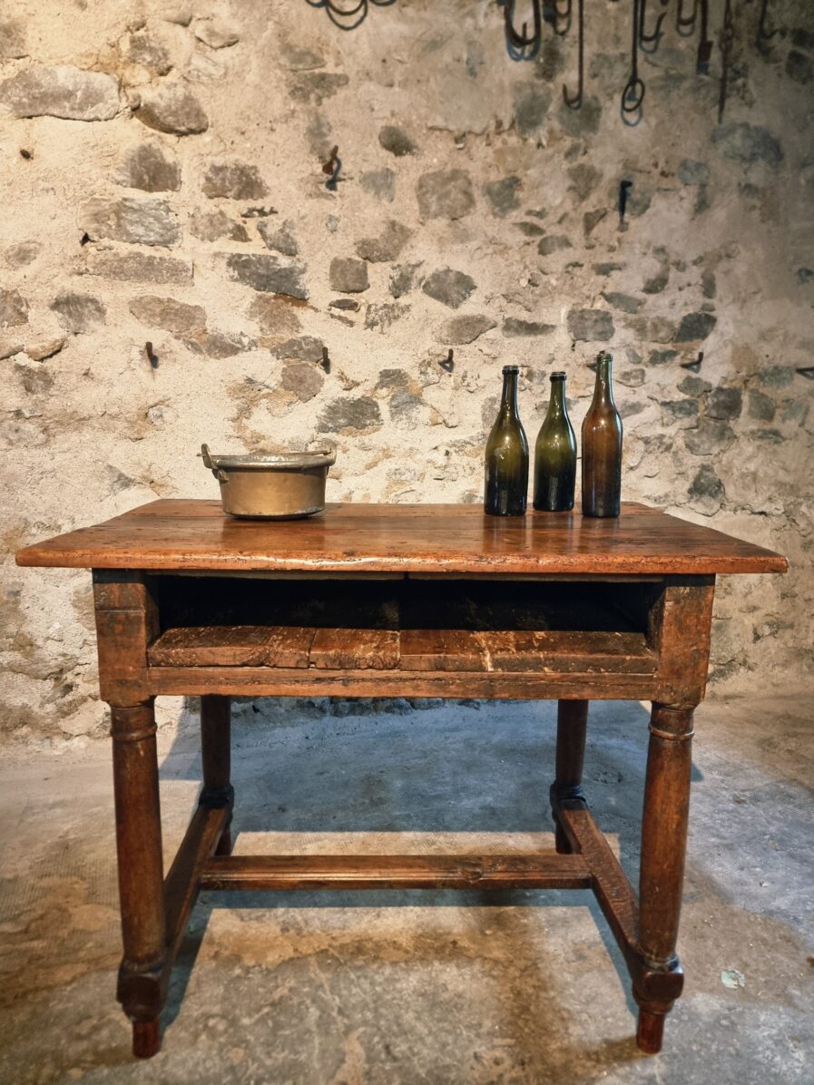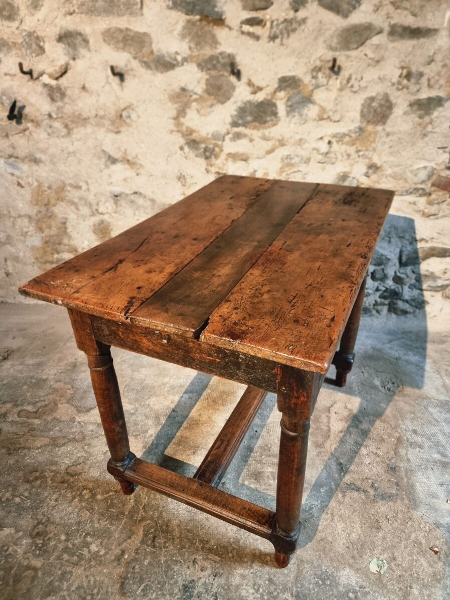 The tabletop is made of three walnut planks, rich in colour and patina, showing the marks of age and use that give it such character.