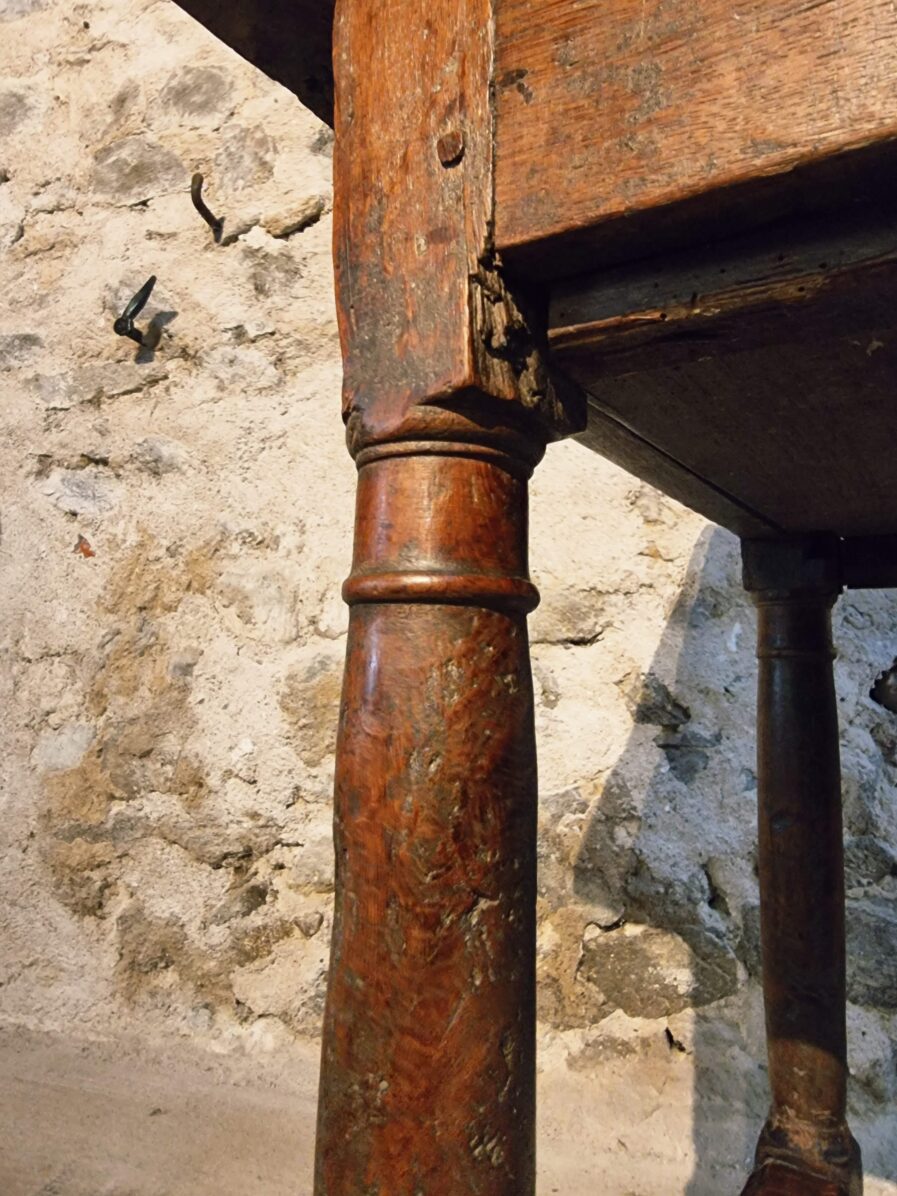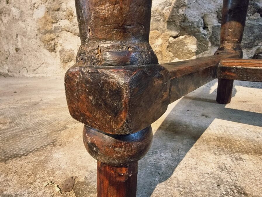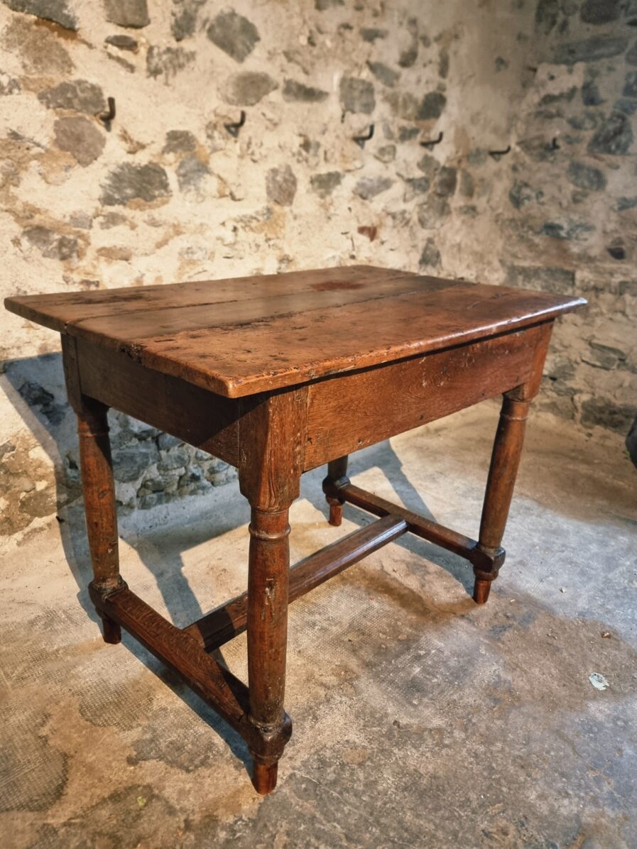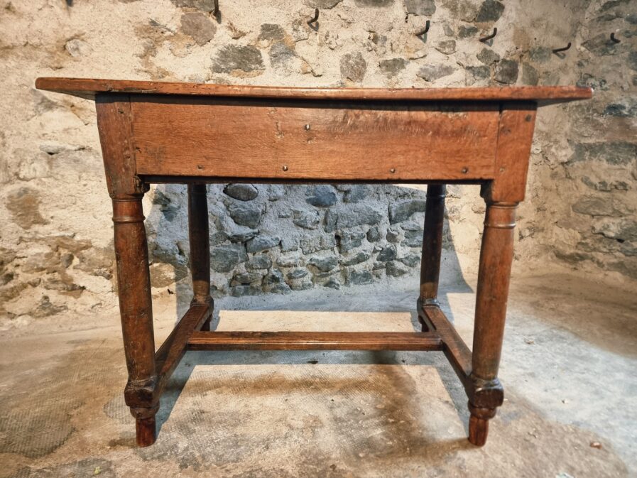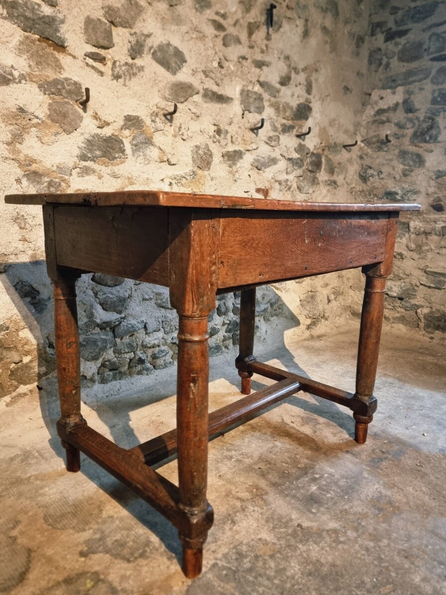 The tabletop is made of three walnut planks, rich in colour and patina, showing the marks of age and use that give it such character.