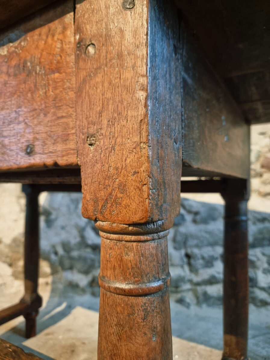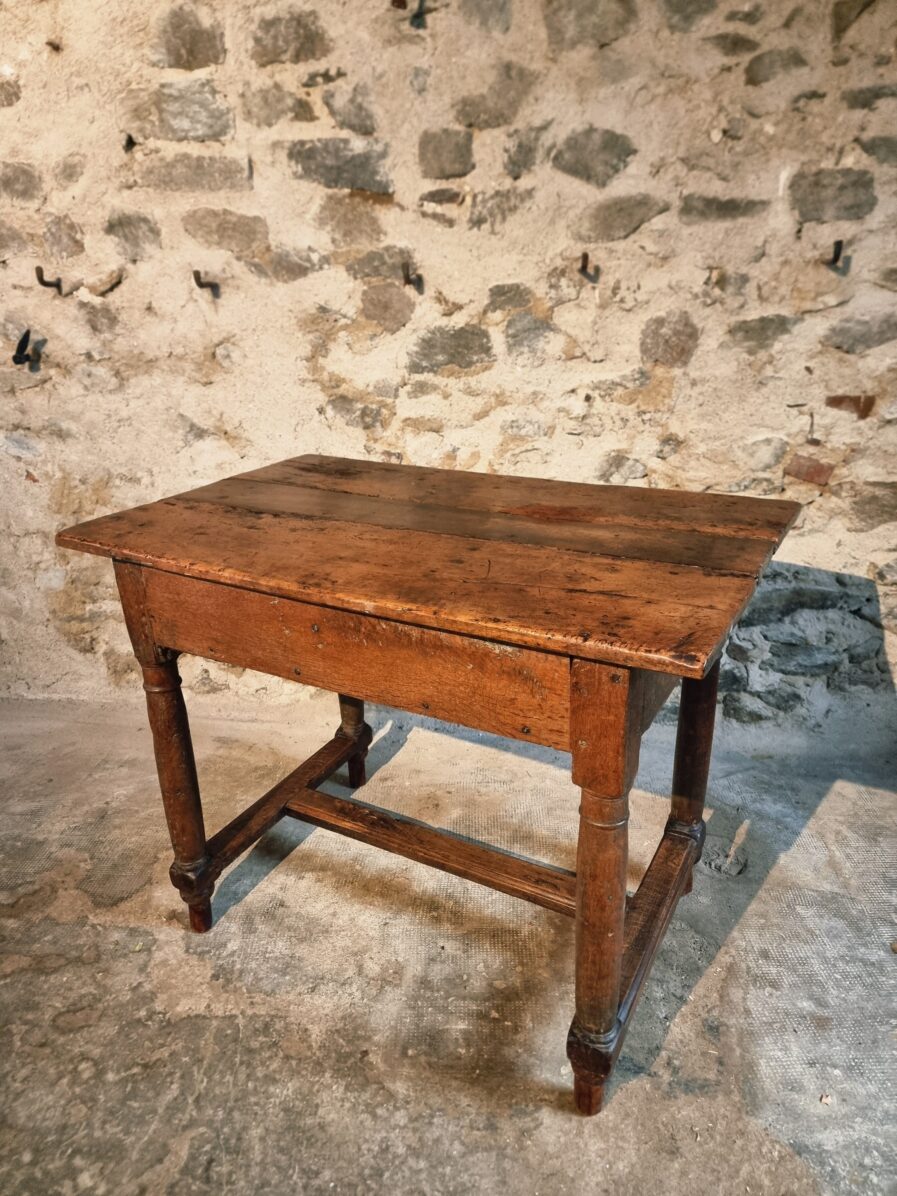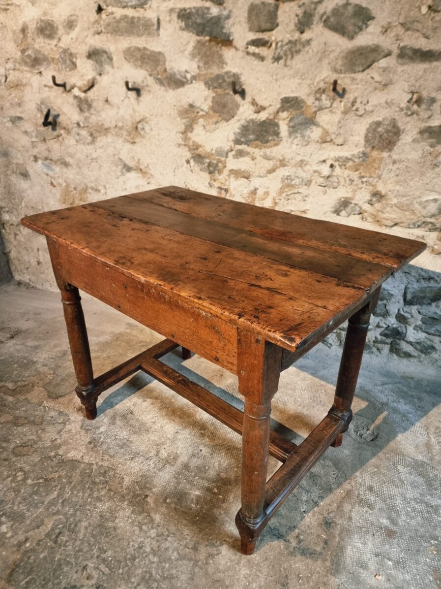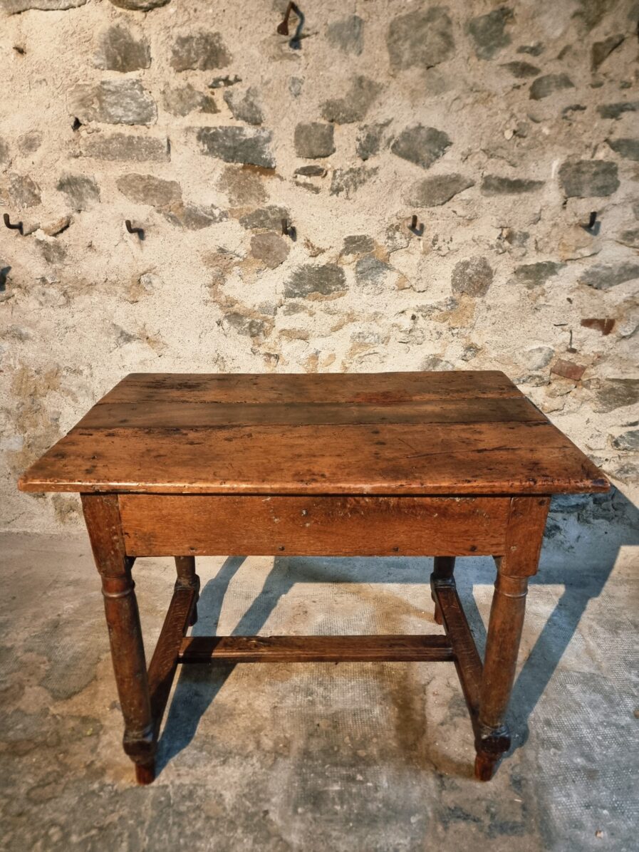The tabletop is made of three walnut planks, rich in colour and patina, showing the marks of age and use that give it such character.