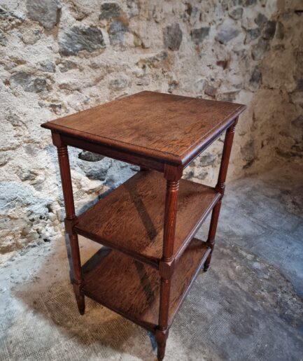 The warm oak tones and geometric base make it suitable for both modern and classic settings.