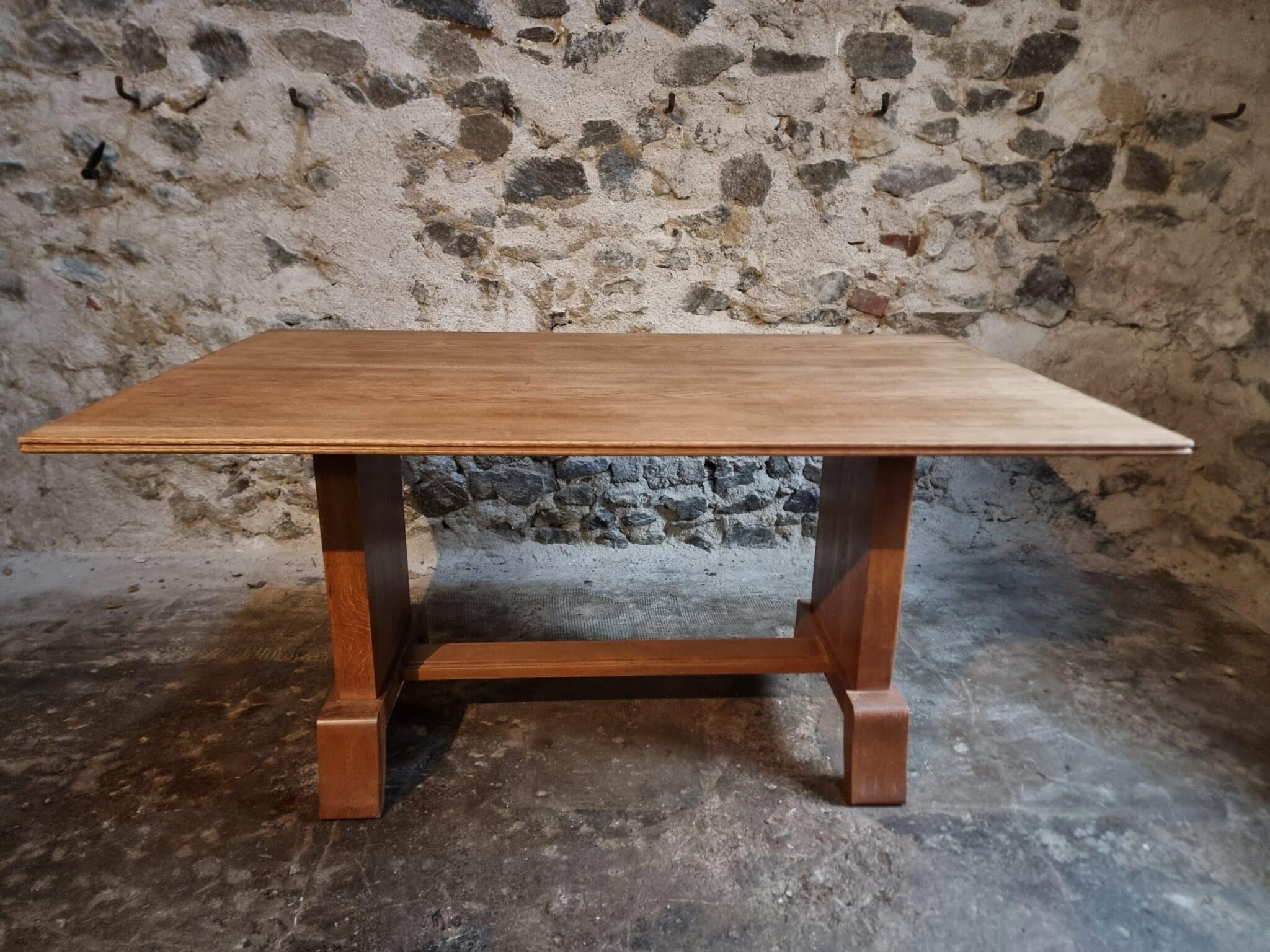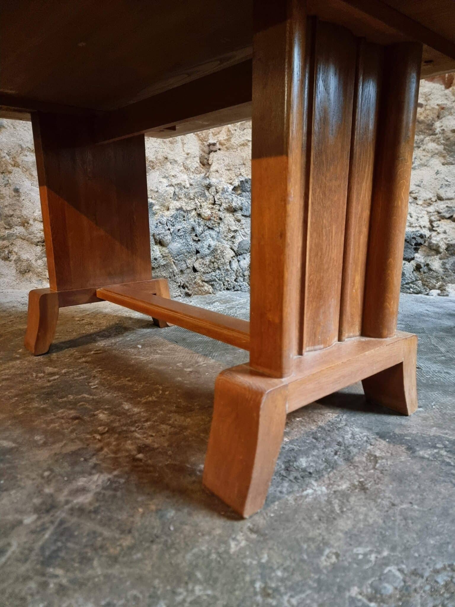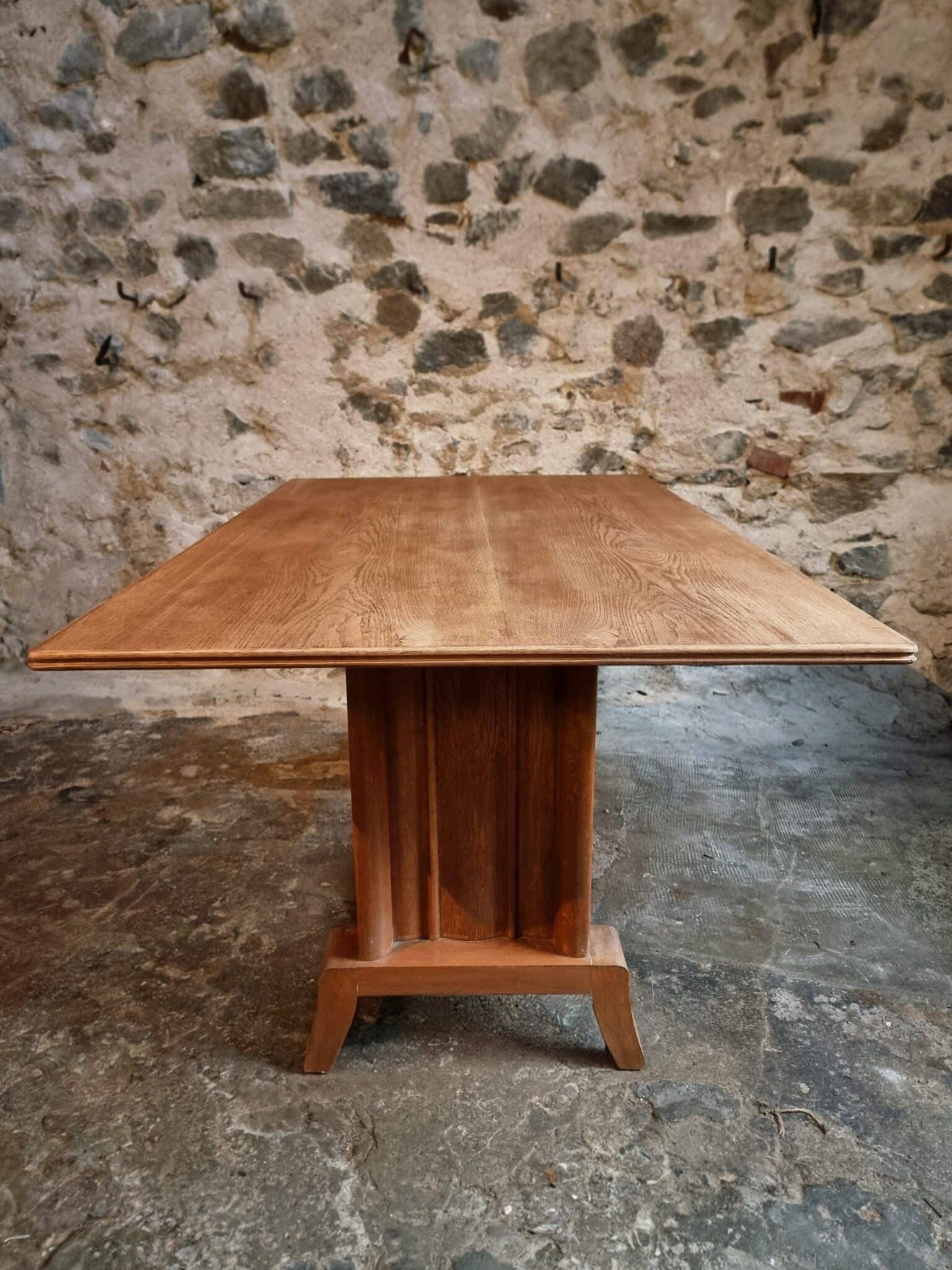 This French Art Deco oak dining table dates from the 1930–1950 period and reflects the restrained geometric elegance characteristic of the Art Deco movement.
