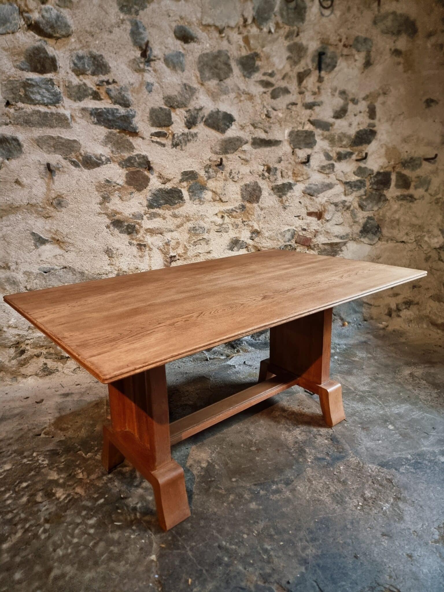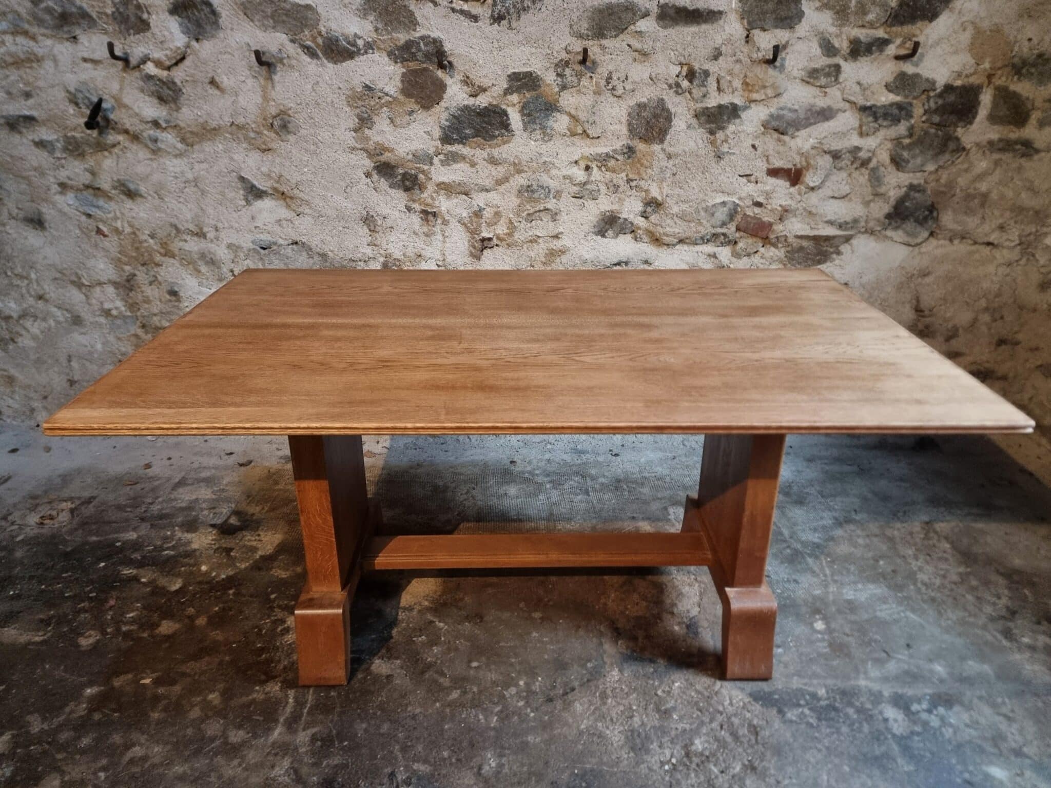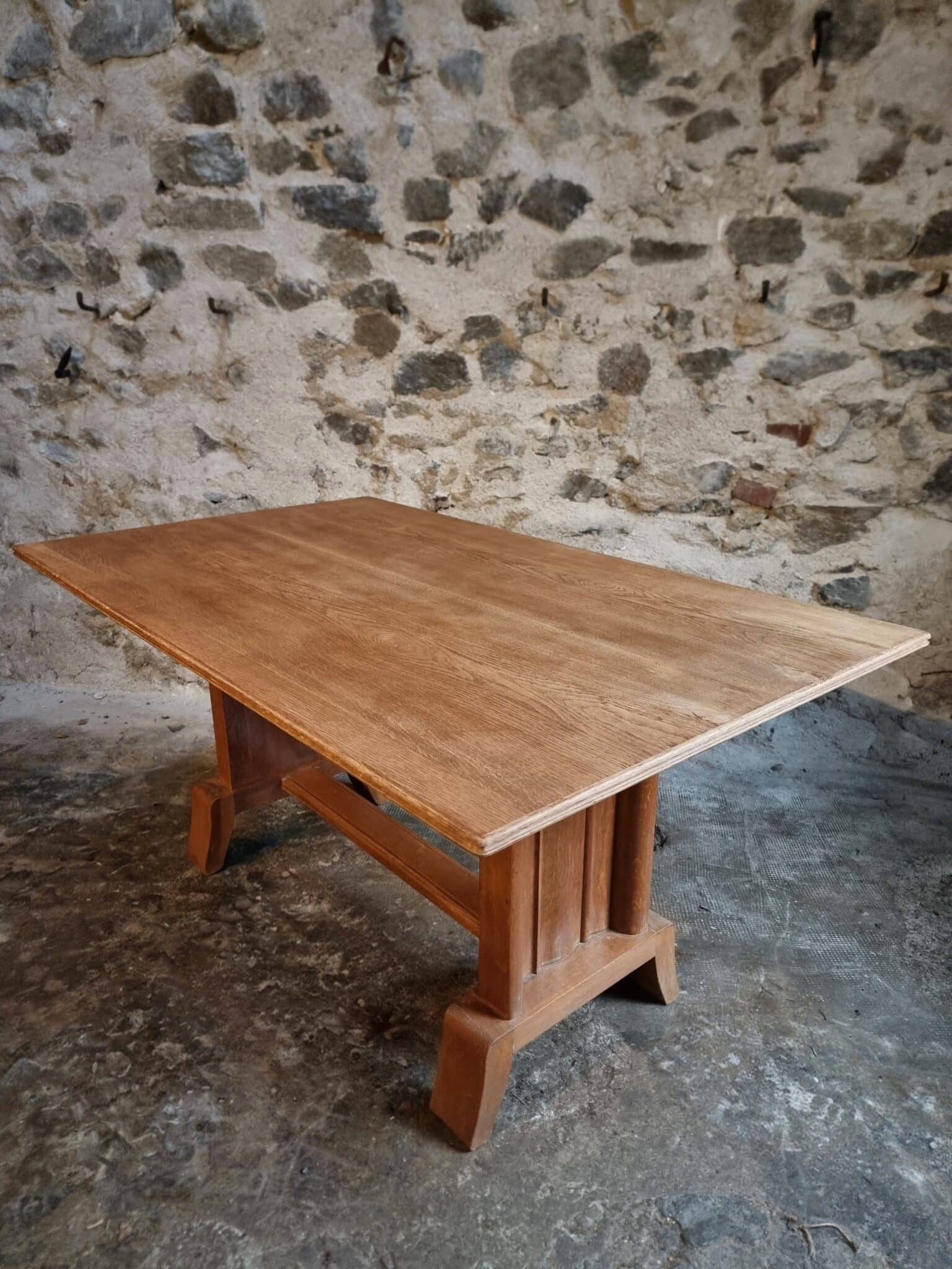 This French Art Deco oak dining table dates from the 1930–1950 period and reflects the restrained geometric elegance characteristic of the Art Deco movement.