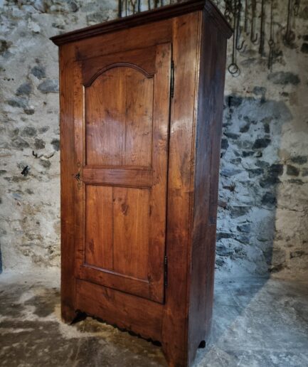 The piece features two paneled doors fitted with original hardware, both of which can be locked, offering secure storage for tableware, linens, or household items. The interior is arranged with shelves, making the cabinet practical for use in a dining room, kitchen, or living space. The gently shaped lower apron and balanced proportions are typical of late 18th-century provincial craftsmanship.