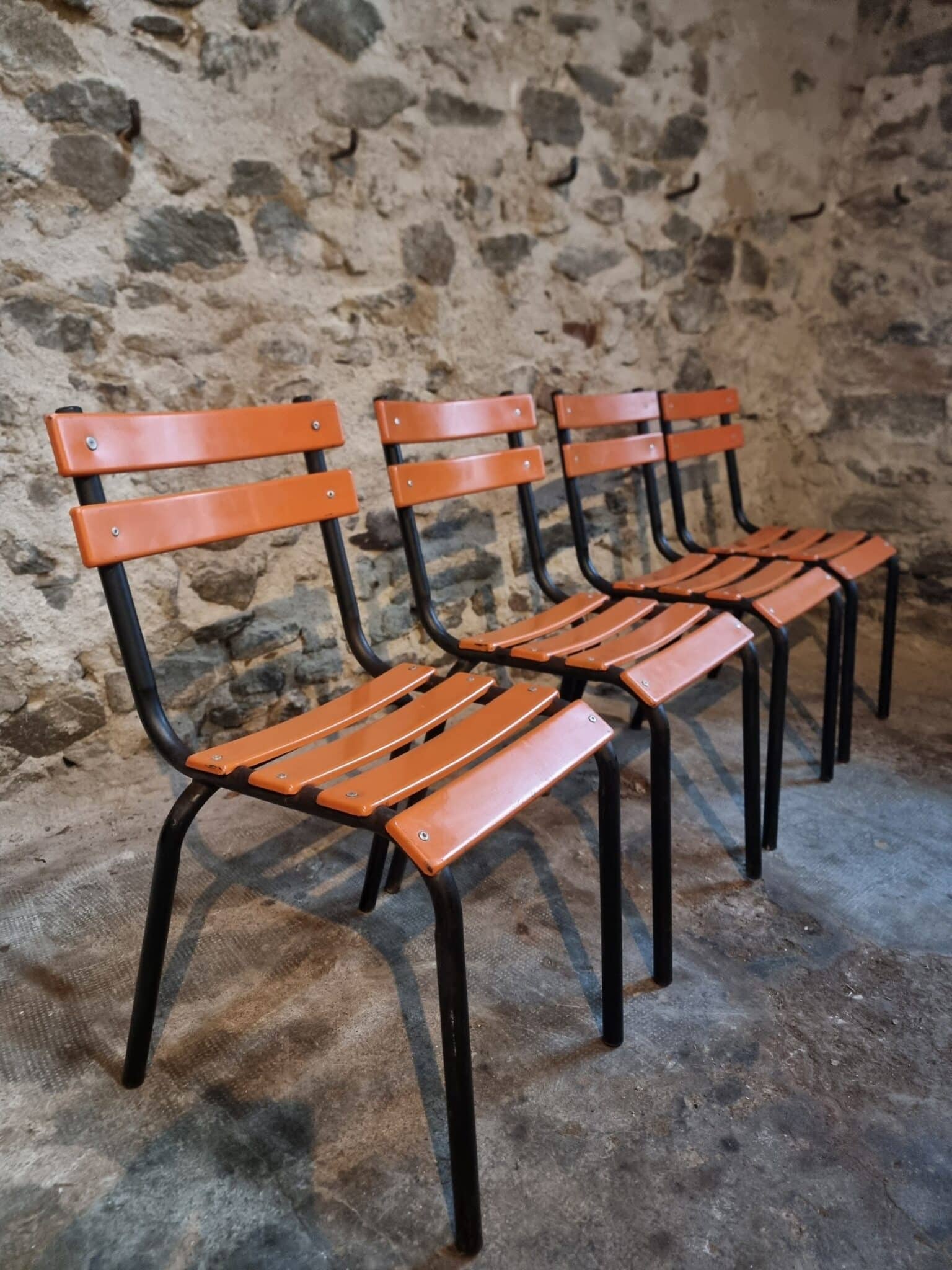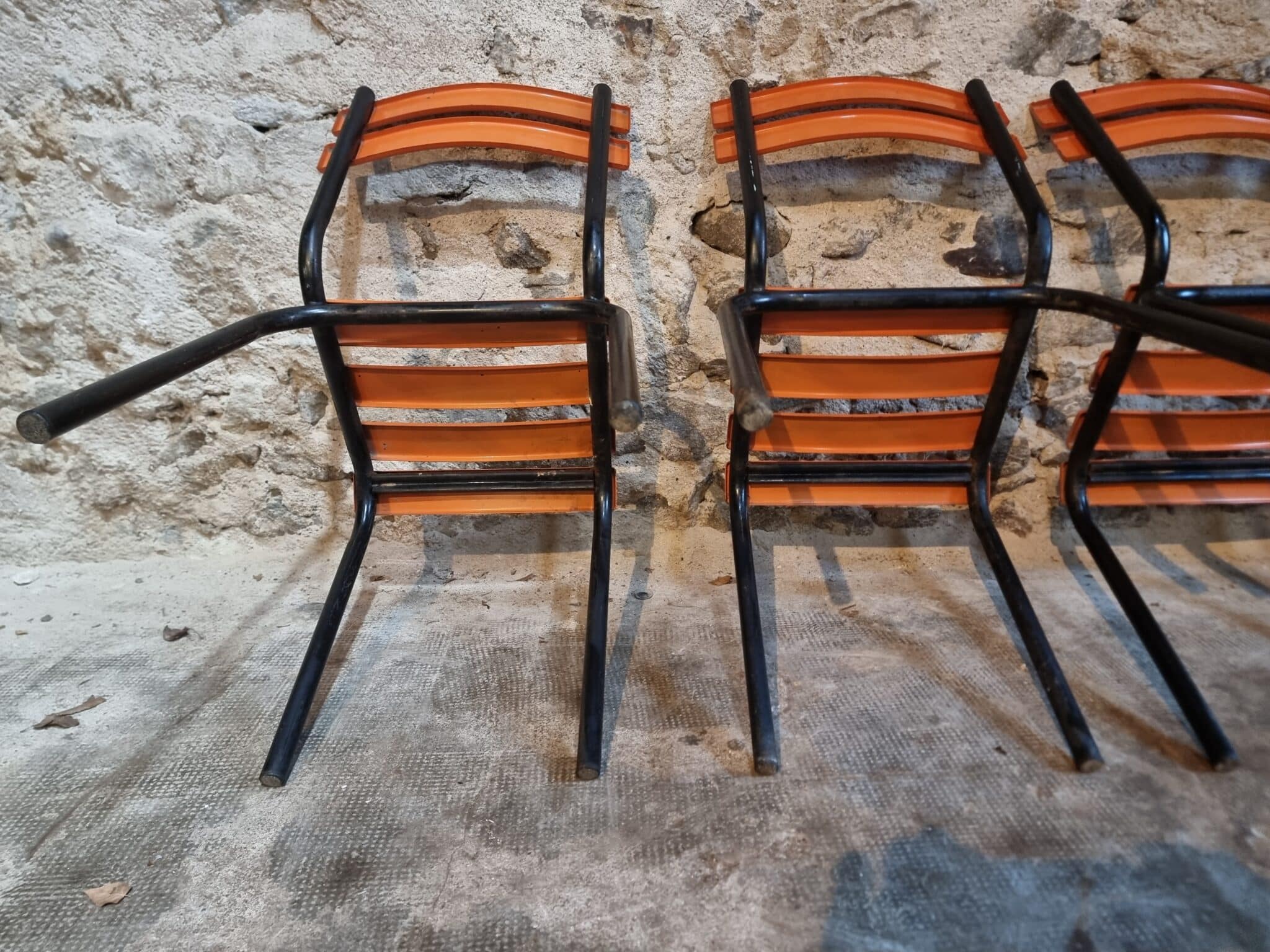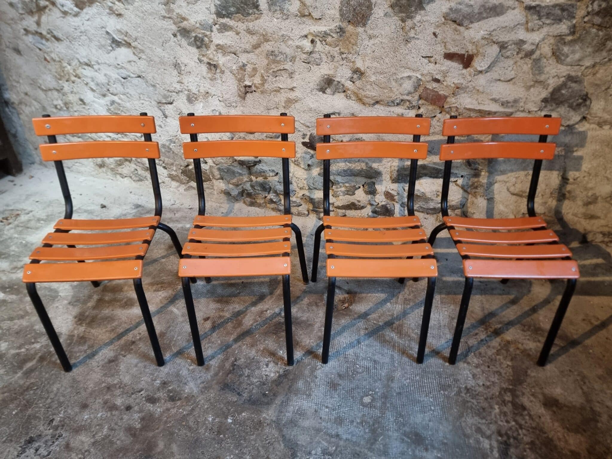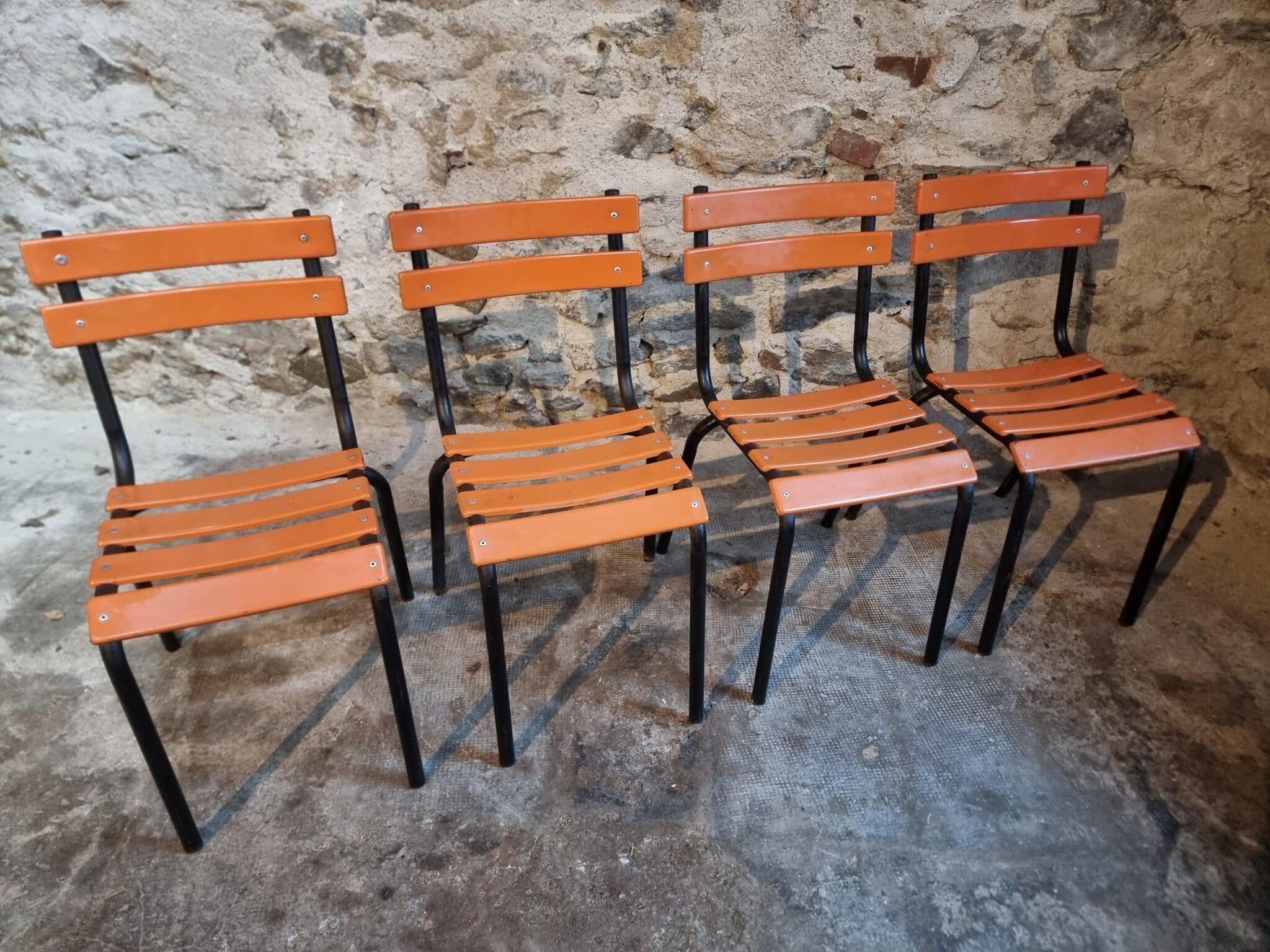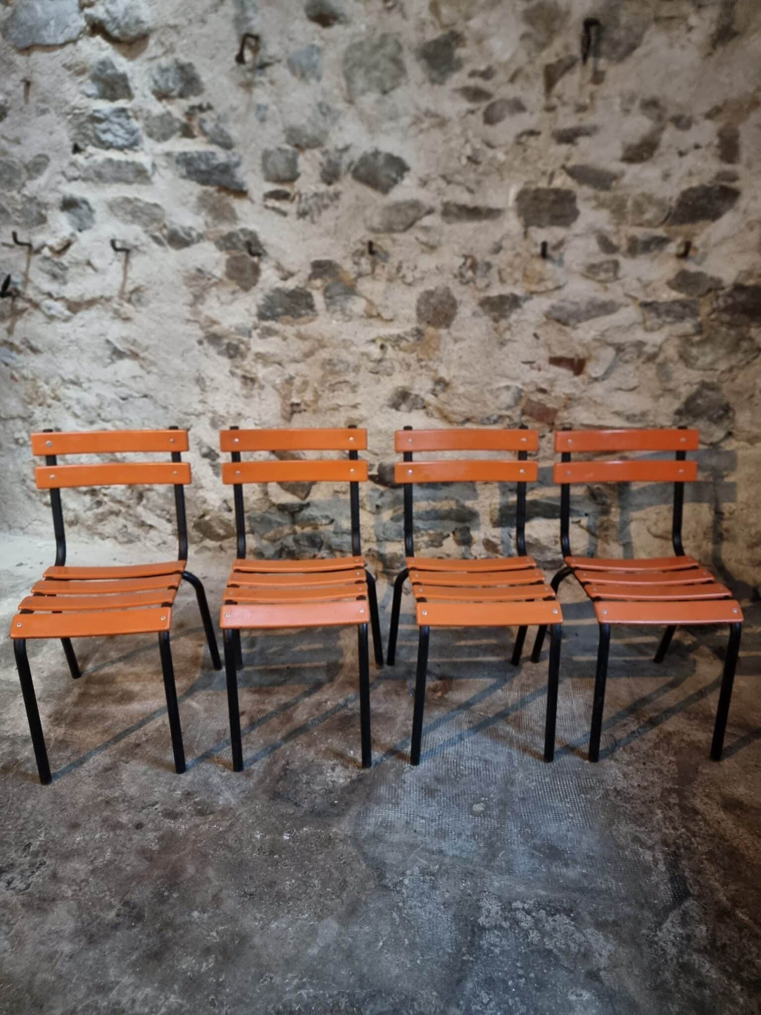 Their simple utilitarian design reflects the functional style of mid-20th-century French school and institutional furniture. The warm orange colour of the slats contrasts nicely with the black frame and gives the chairs a distinctive industrial look.