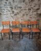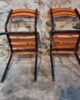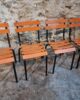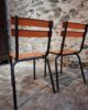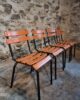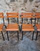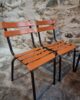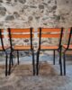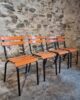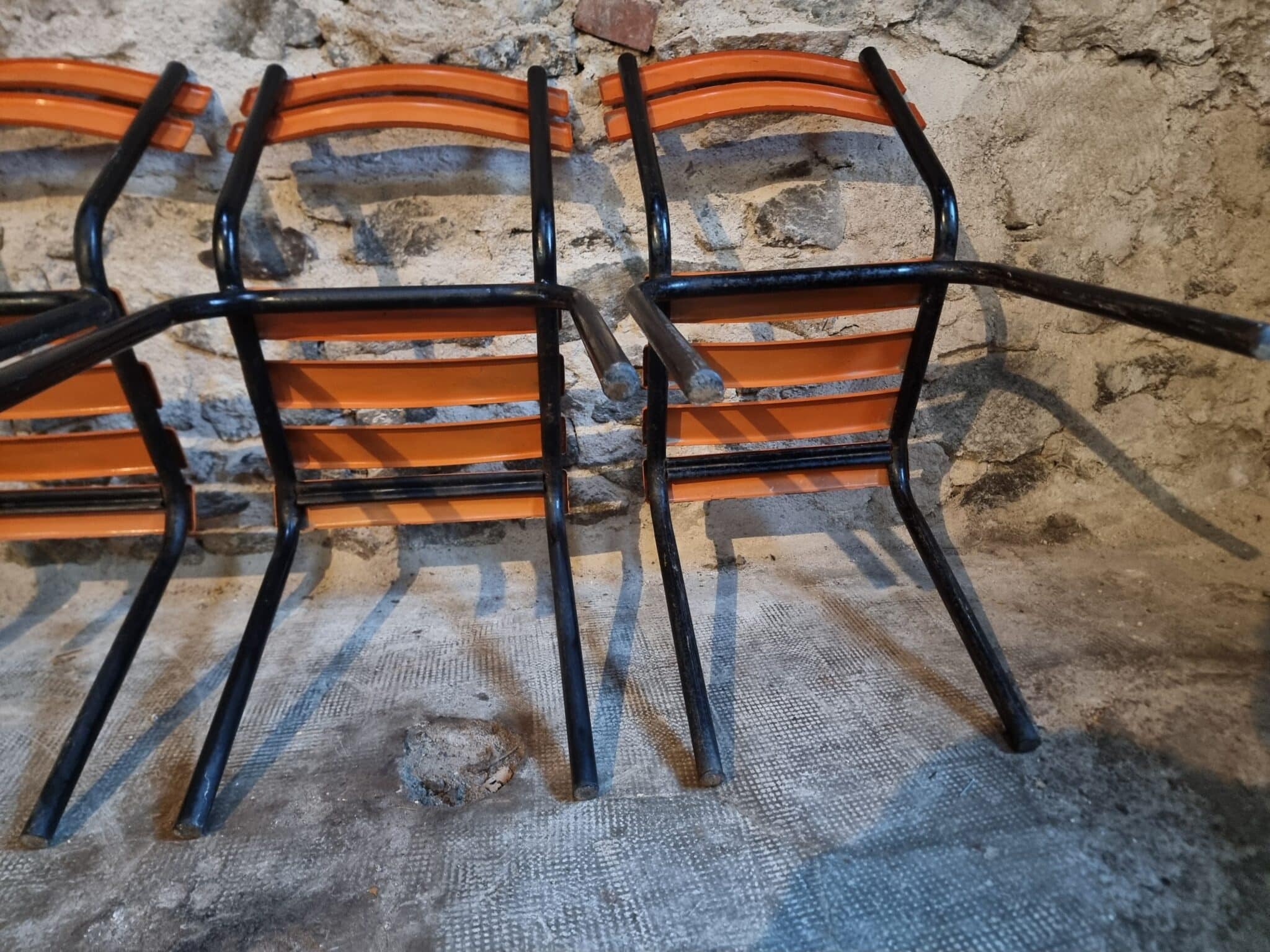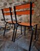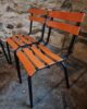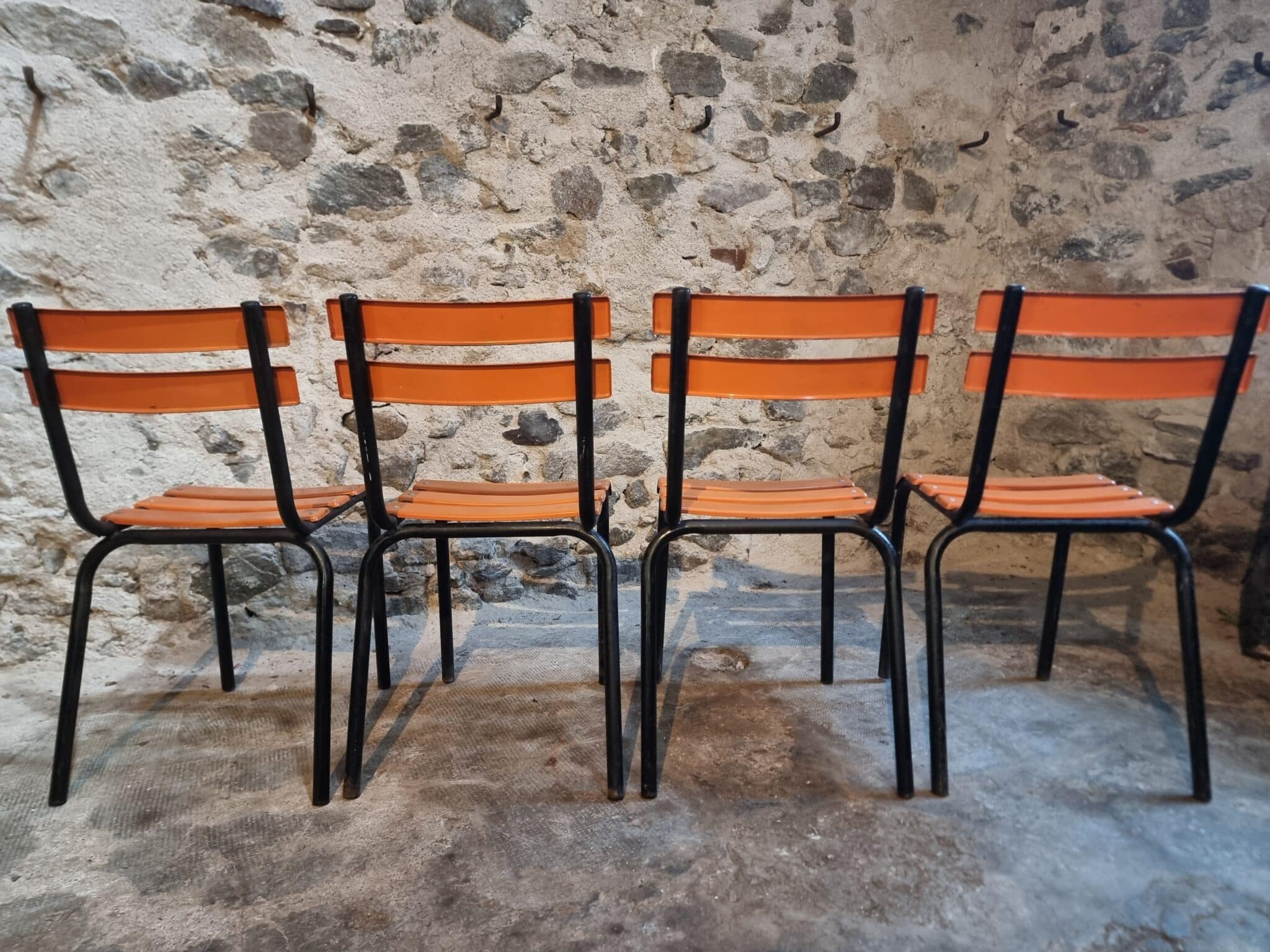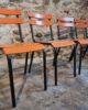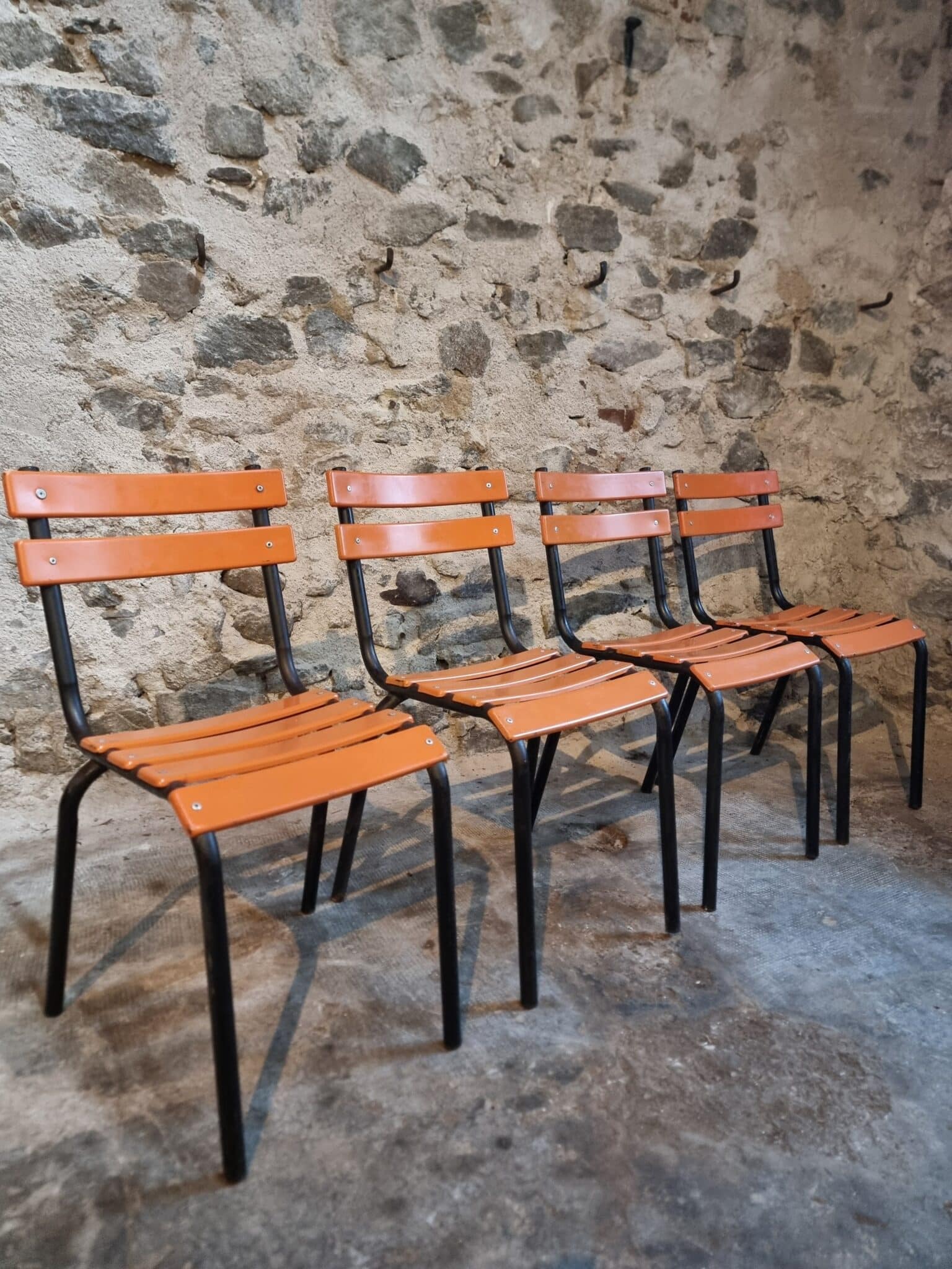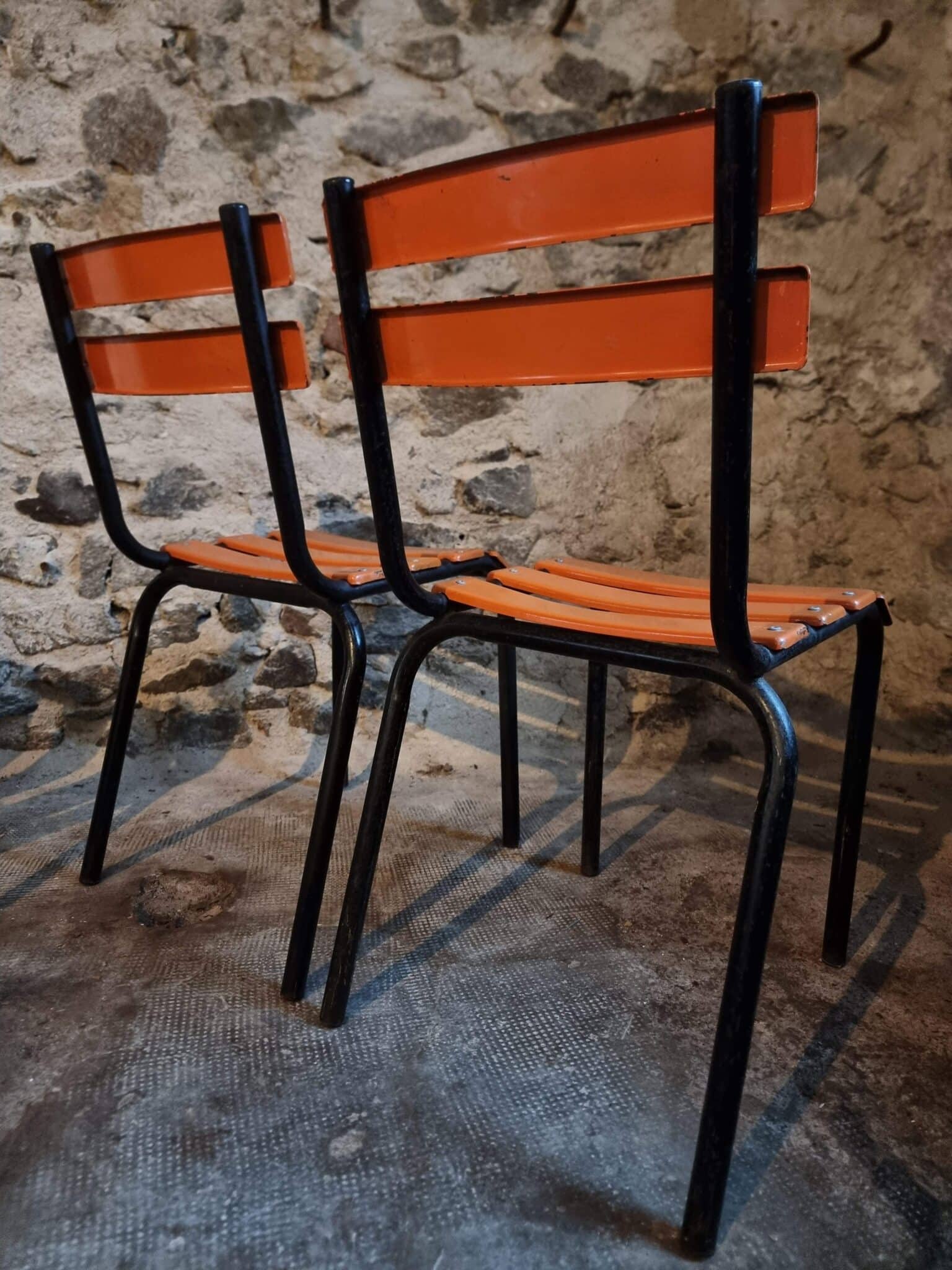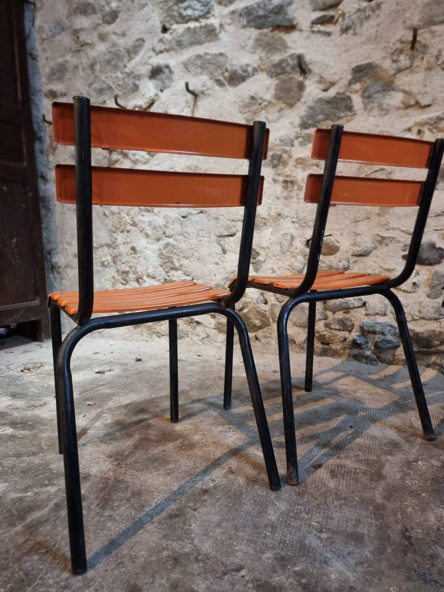 Their simple utilitarian design reflects the functional style of mid-20th-century French school and institutional furniture. The warm orange colour of the slats contrasts nicely with the black frame and gives the chairs a distinctive industrial look.