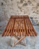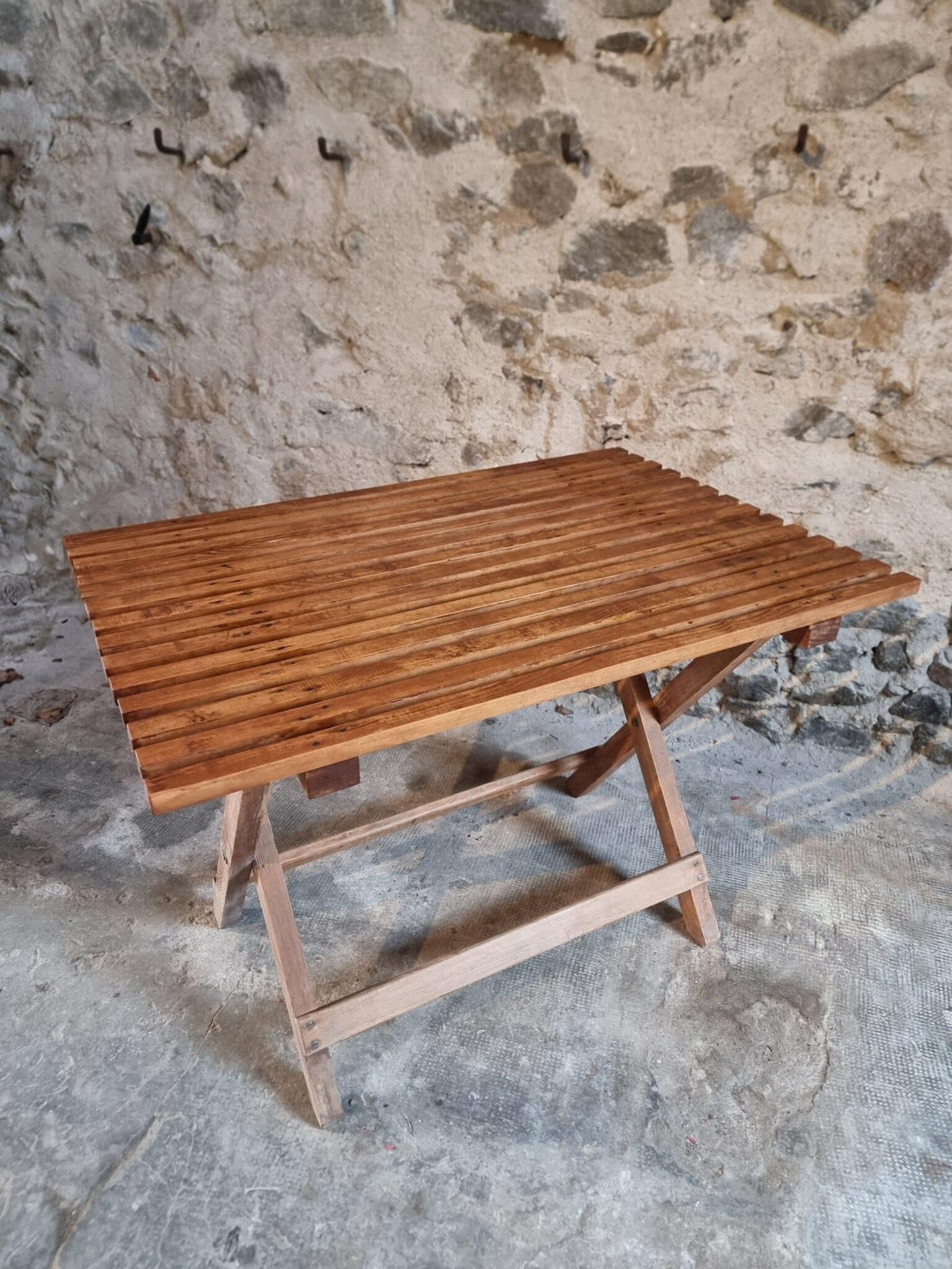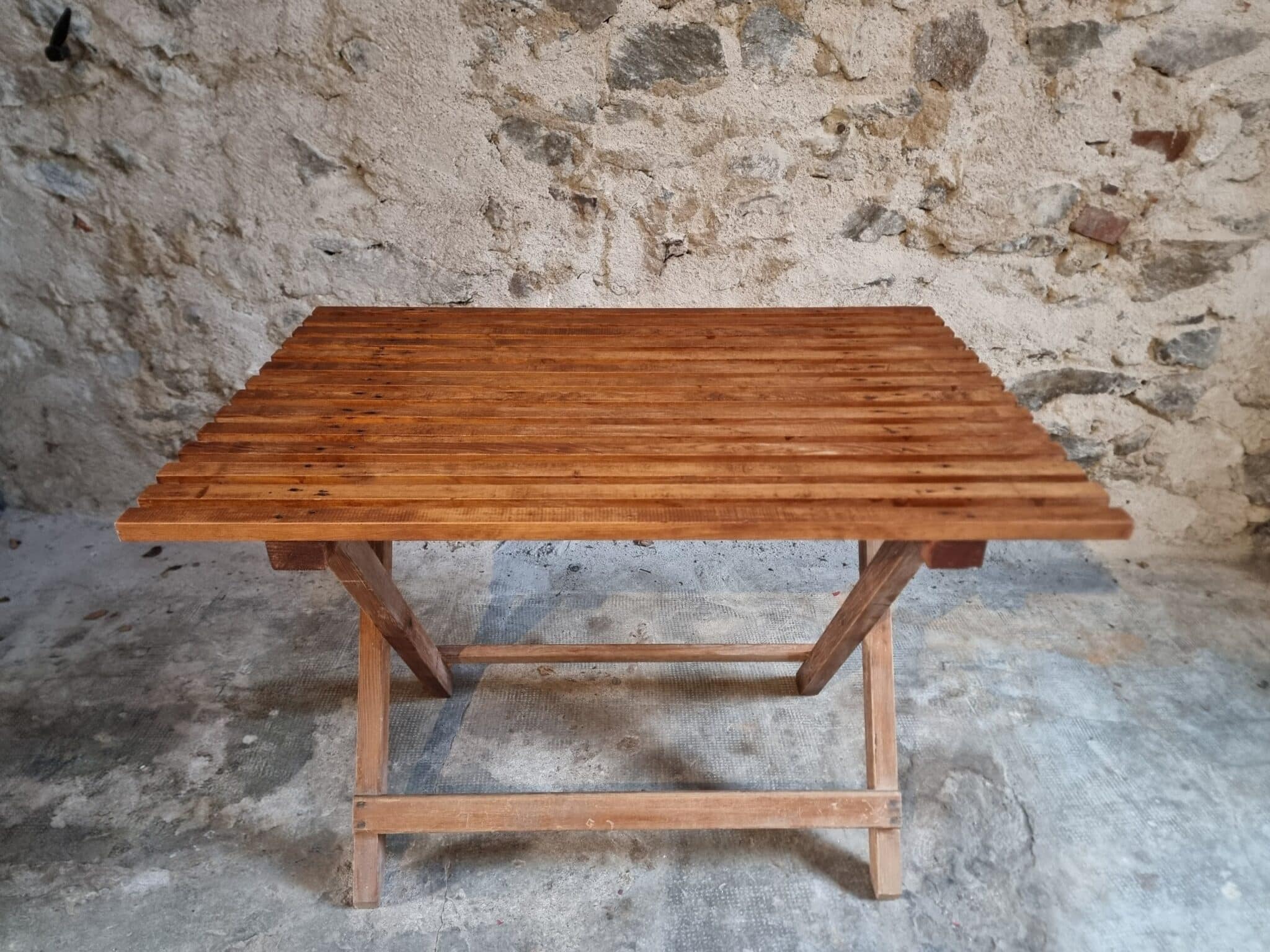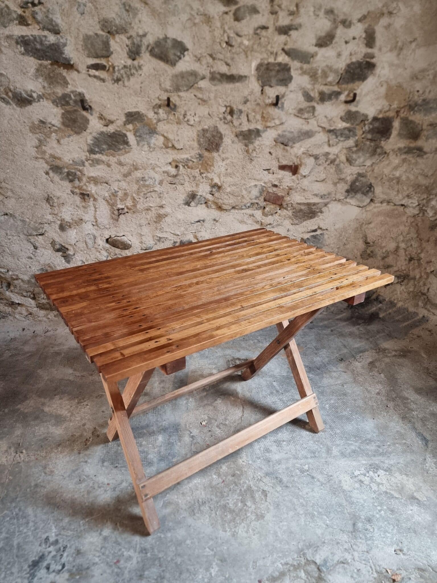 This vintage folding table dates from the mid 20th century and is made of solid pine wood. The design is simple and functional, featuring a slatted top and a practical folding mechanism.