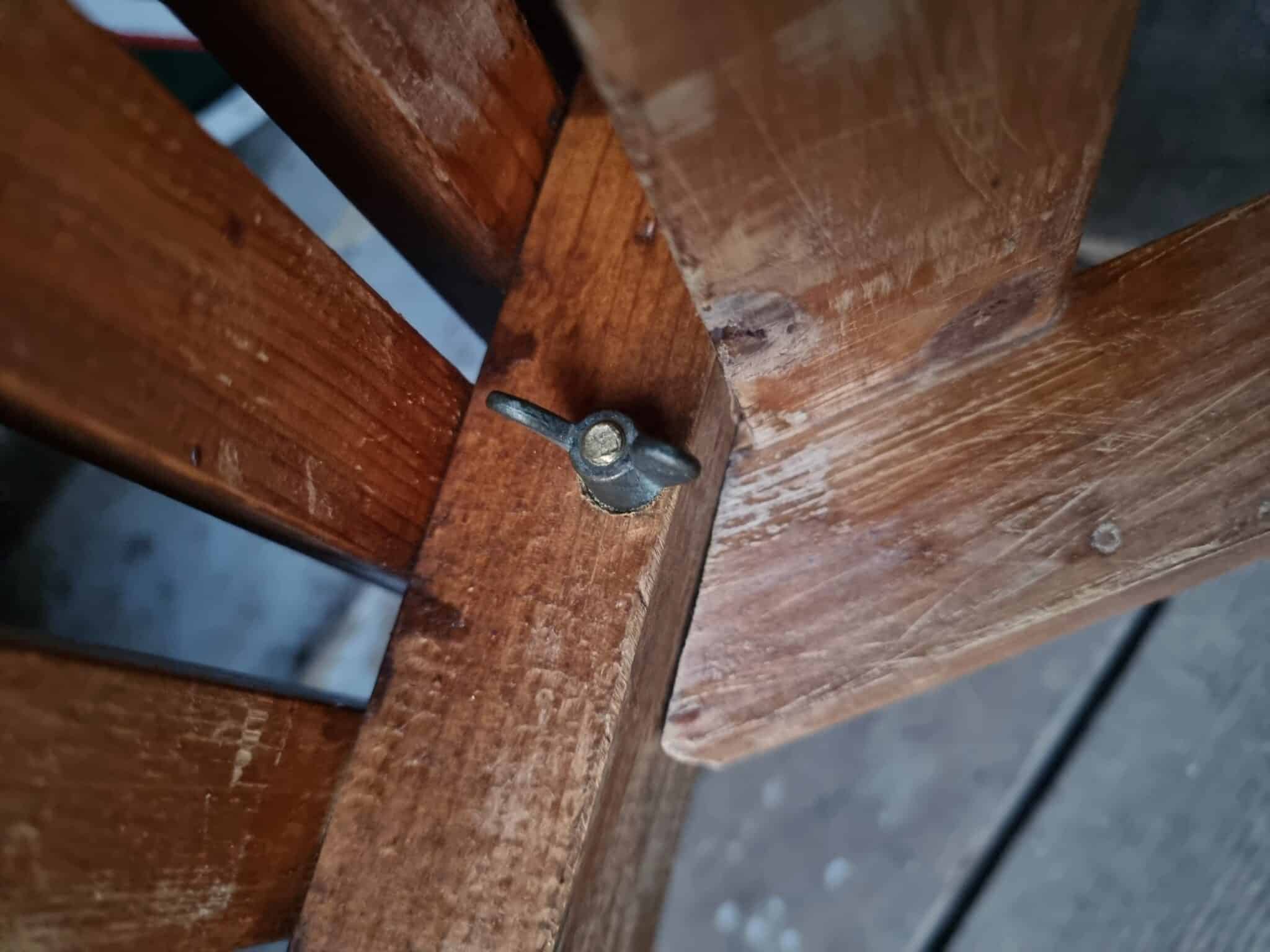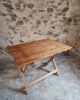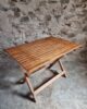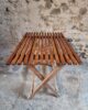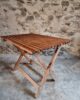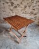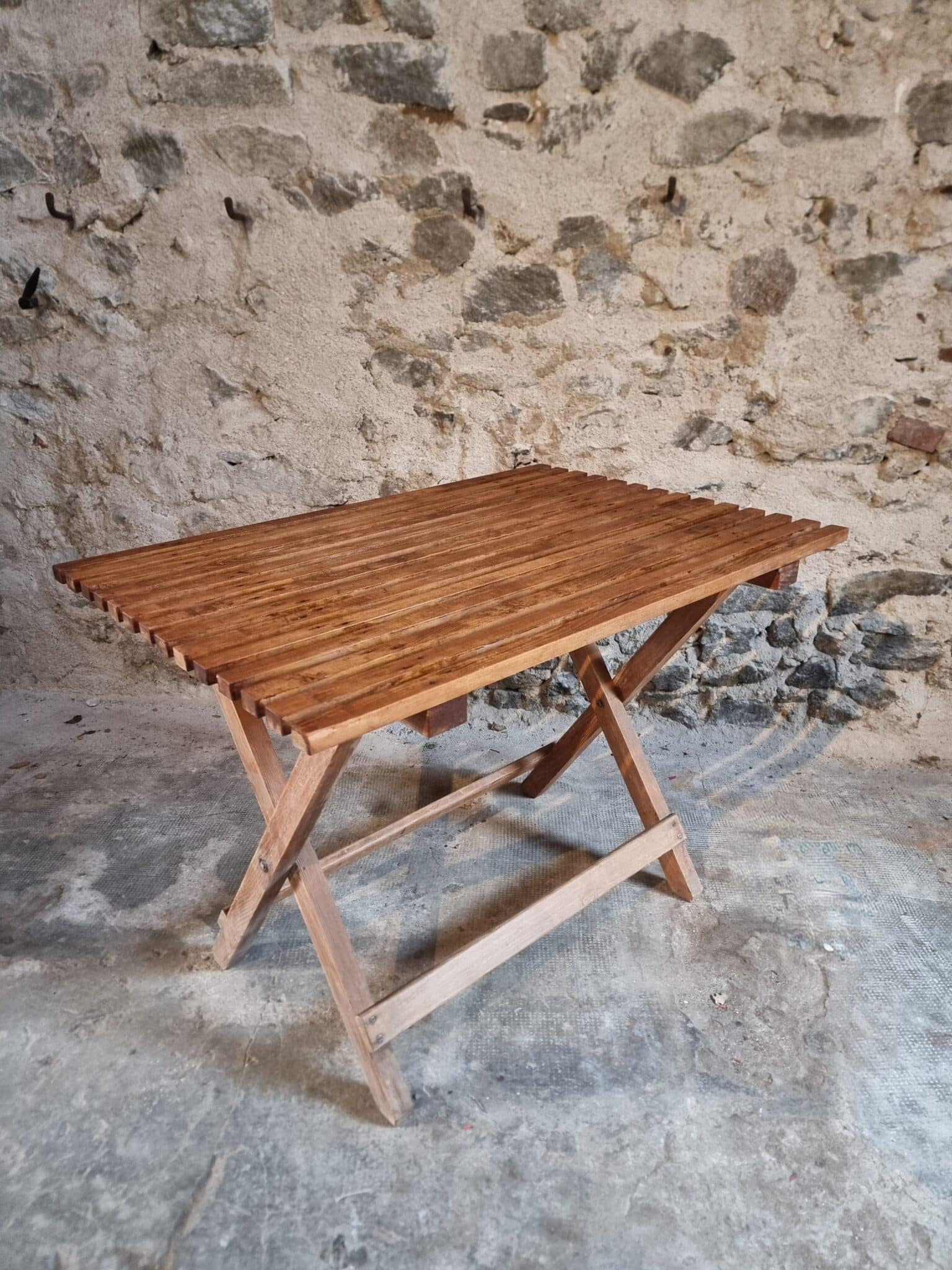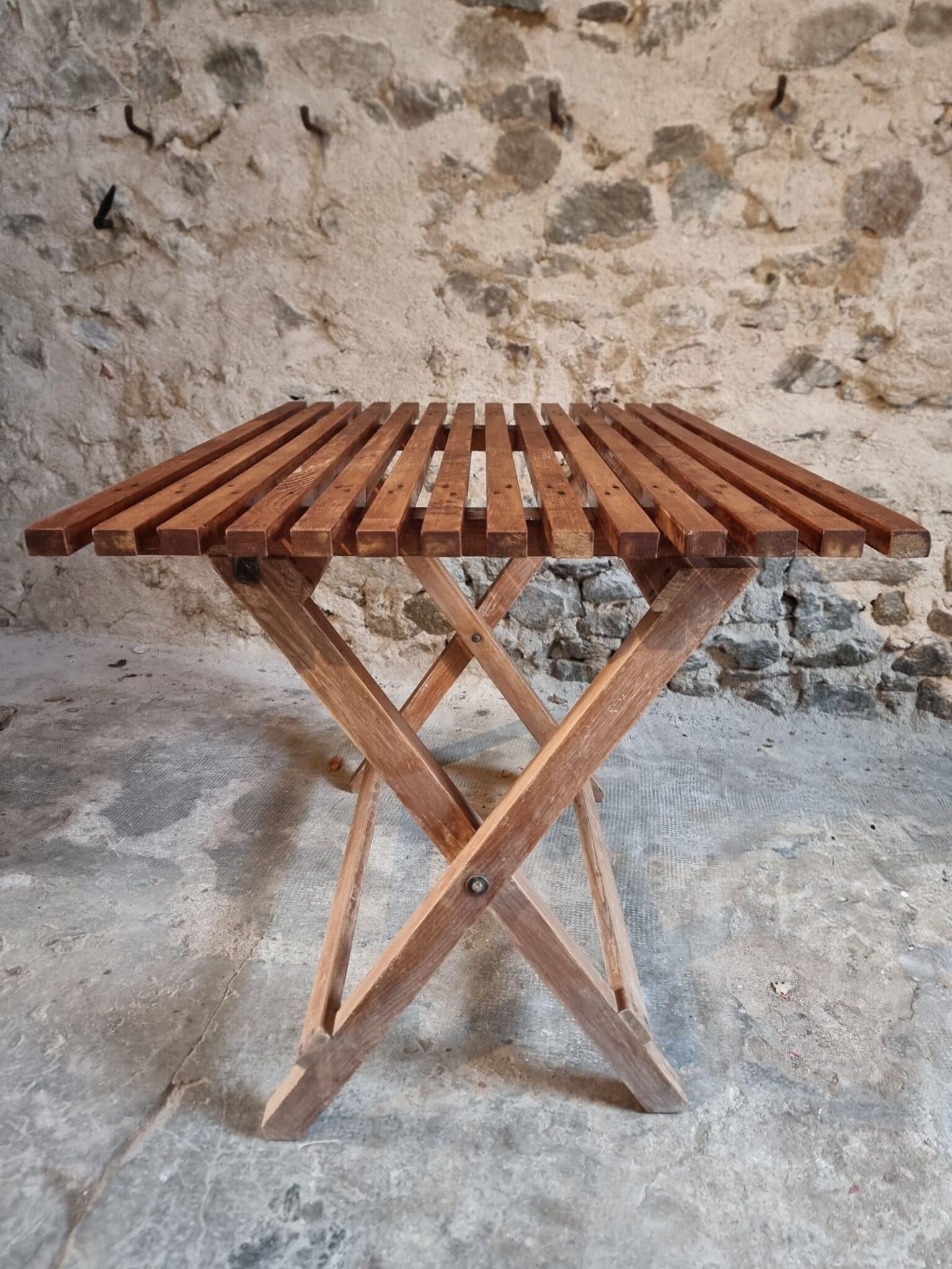 This vintage folding table dates from the mid 20th century and is made of solid pine wood. The design is simple and functional, featuring a slatted top and a practical folding mechanism.