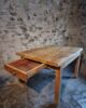 The table features a thick solid wood top measuring approximately 55 mm, providing a stable and durable working surface. At one short end, the table is fitted with a single drawer, equipped with an original copper drop handle, offering practical storage while maintaining a restrained, utilitarian appearance.