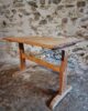The base is constructed primarily from pine, with structural elements in beech. The trestle-style legs provide stability and allow comfortable seating.