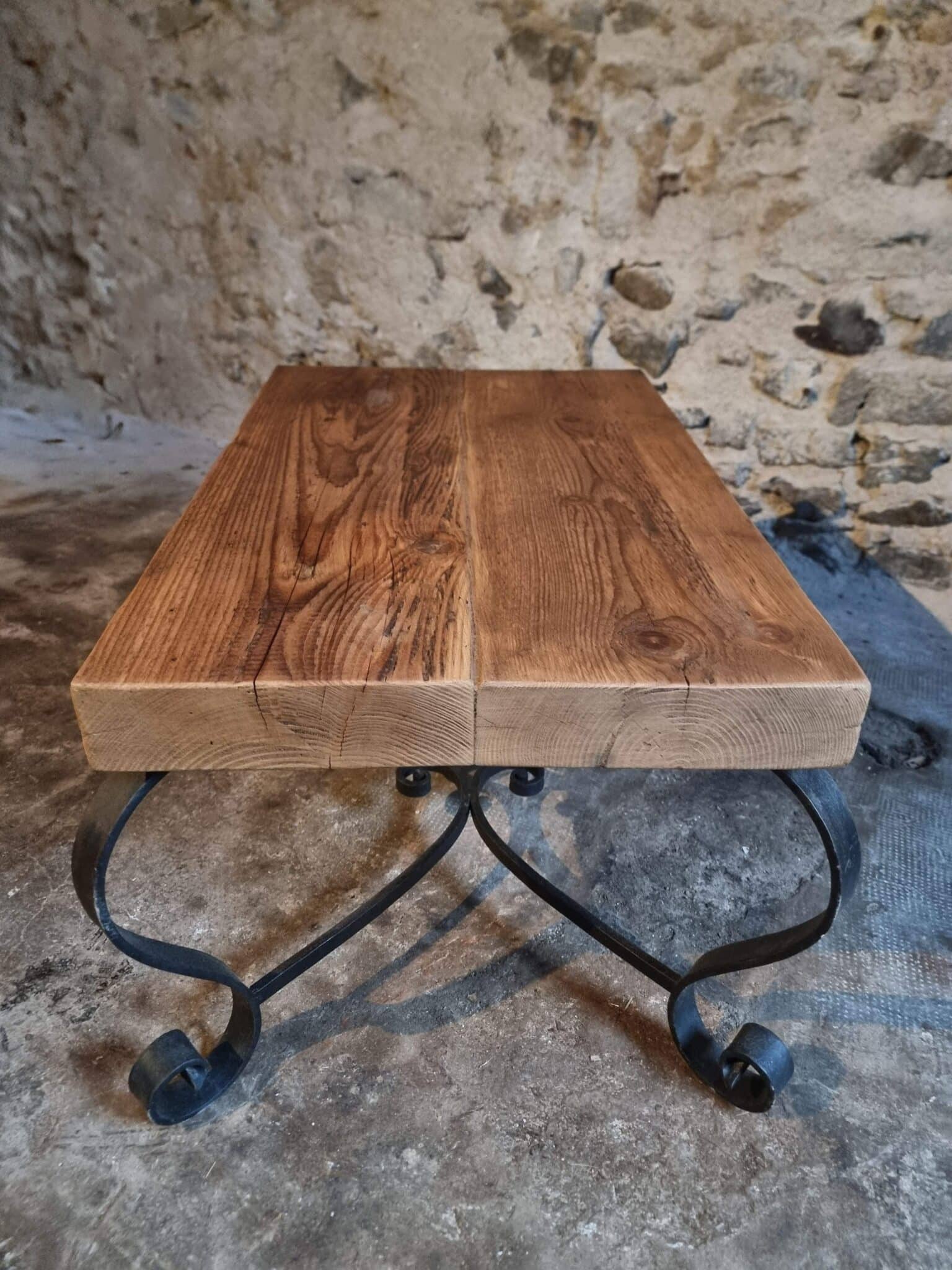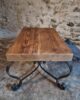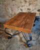 The base is made of bent iron with elegant scroll details, giving the table a light yet stable construction. The tabletop consists of thick rustic pine boards with visible grain, knots and natural character. The substantial thickness of the wood adds a robust appearance to the piece.