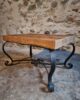 This vintage French coffee table dates from the 1960s and features a rustic solid pine tabletop combined with a decorative black iron base.