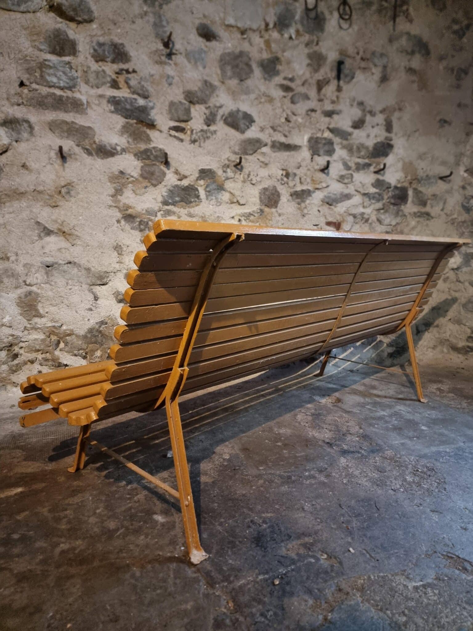 The wooden slats retain their original warm caramel / honey-toned paint finish, which has developed a natural patina over time. This aged surface gives the bench its authentic vintage character and depth of colour.