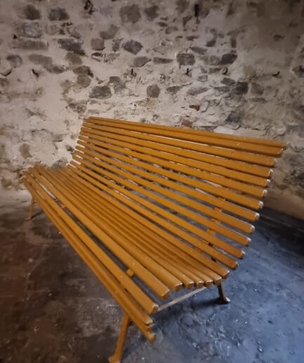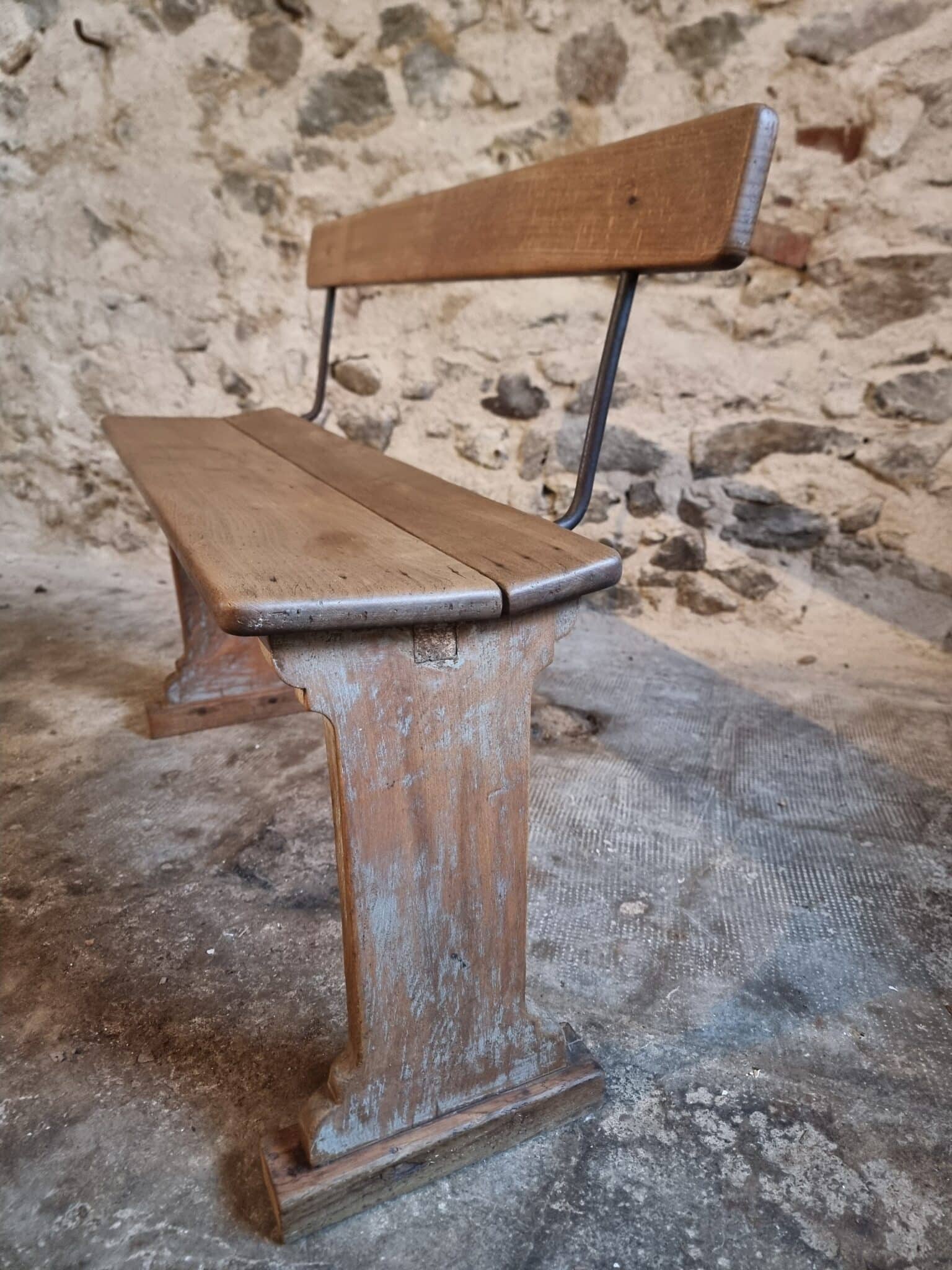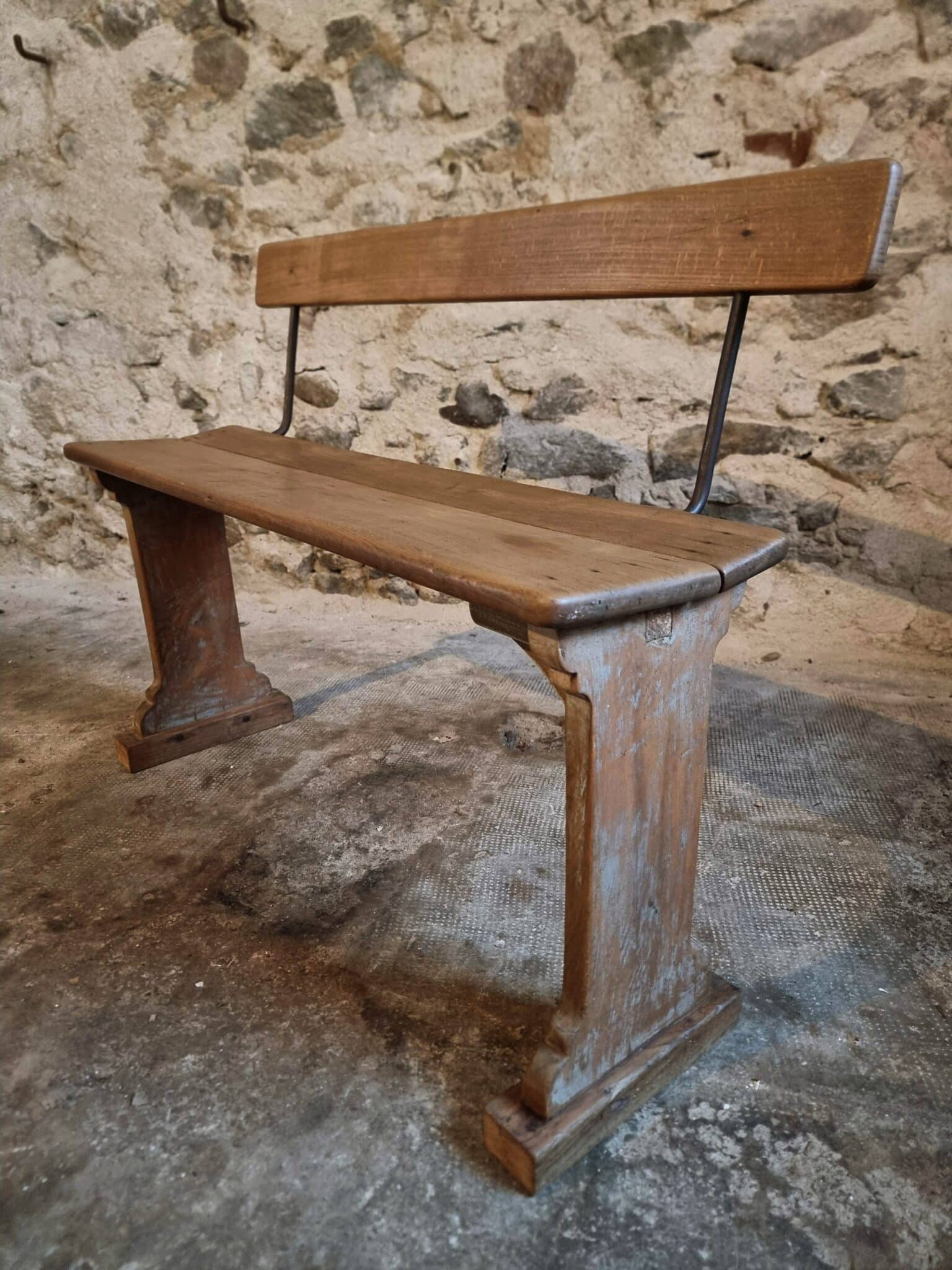 The bench features a clean, architectural silhouette with sturdy pedestal legs and a simple backrest supported by metal brackets. Its proportions and construction reflect early 20th-century French institutional craftsmanship.